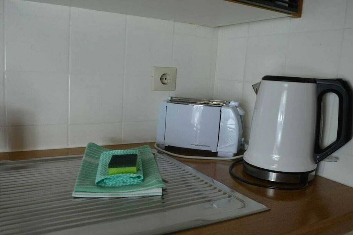 - voll ausgestattete Küche mit Wasserkocher, Toaster und Kaffeemaschine.