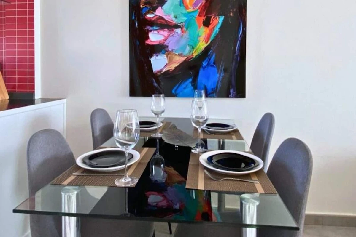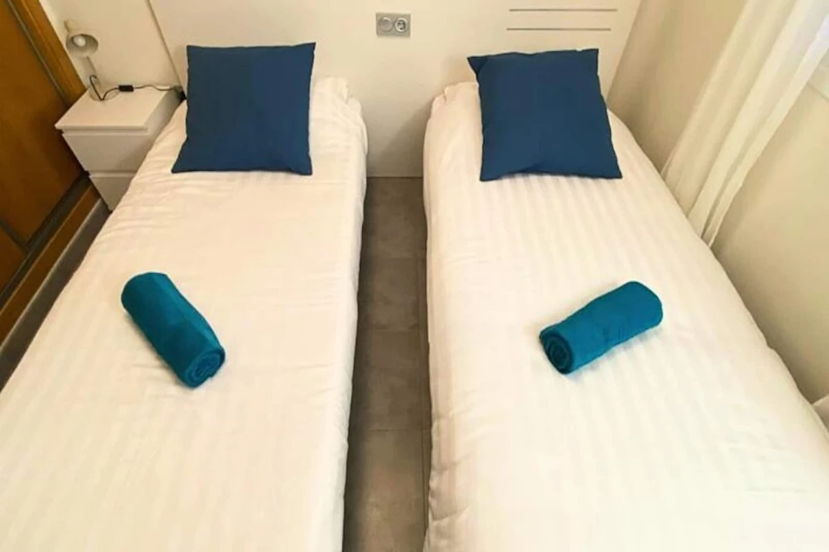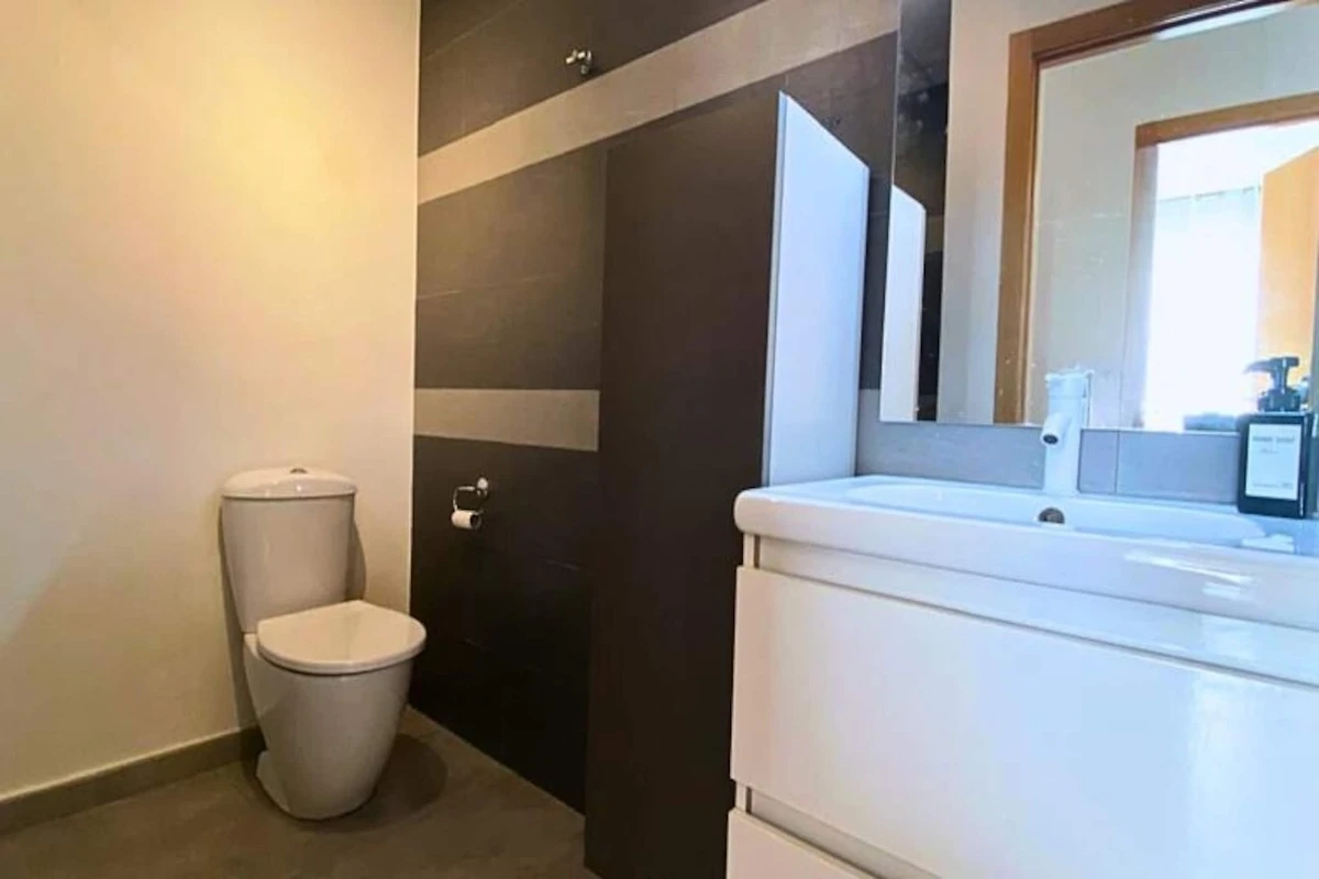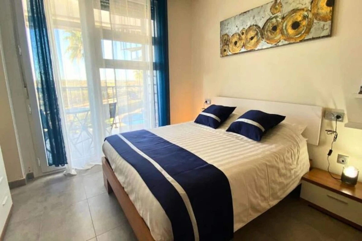 Dieses moderne Apartment bietet einen hellen und geräumigen Wohnraum, ideal für Familien oder Freunde, mit zwei Schlafzimmern und einem privaten Solarium. Ein Schlafzimmer verfügt über ein Doppelbett, das andere über zwei Einzelbetten. Haustiere sind nicht erlaubt. Zur Wohnung gehört auch ein Badezimmer mit ebenerdiger Dusche. Bettwäsche und Handtücher werden für zusätzlichen Komfort bereitgestellt. Die Wohnung befindet sich im 1. Stock, ist über eine Außentreppe erreichbar und verfügt über einen Parkplatz direkt vor der Residenz.