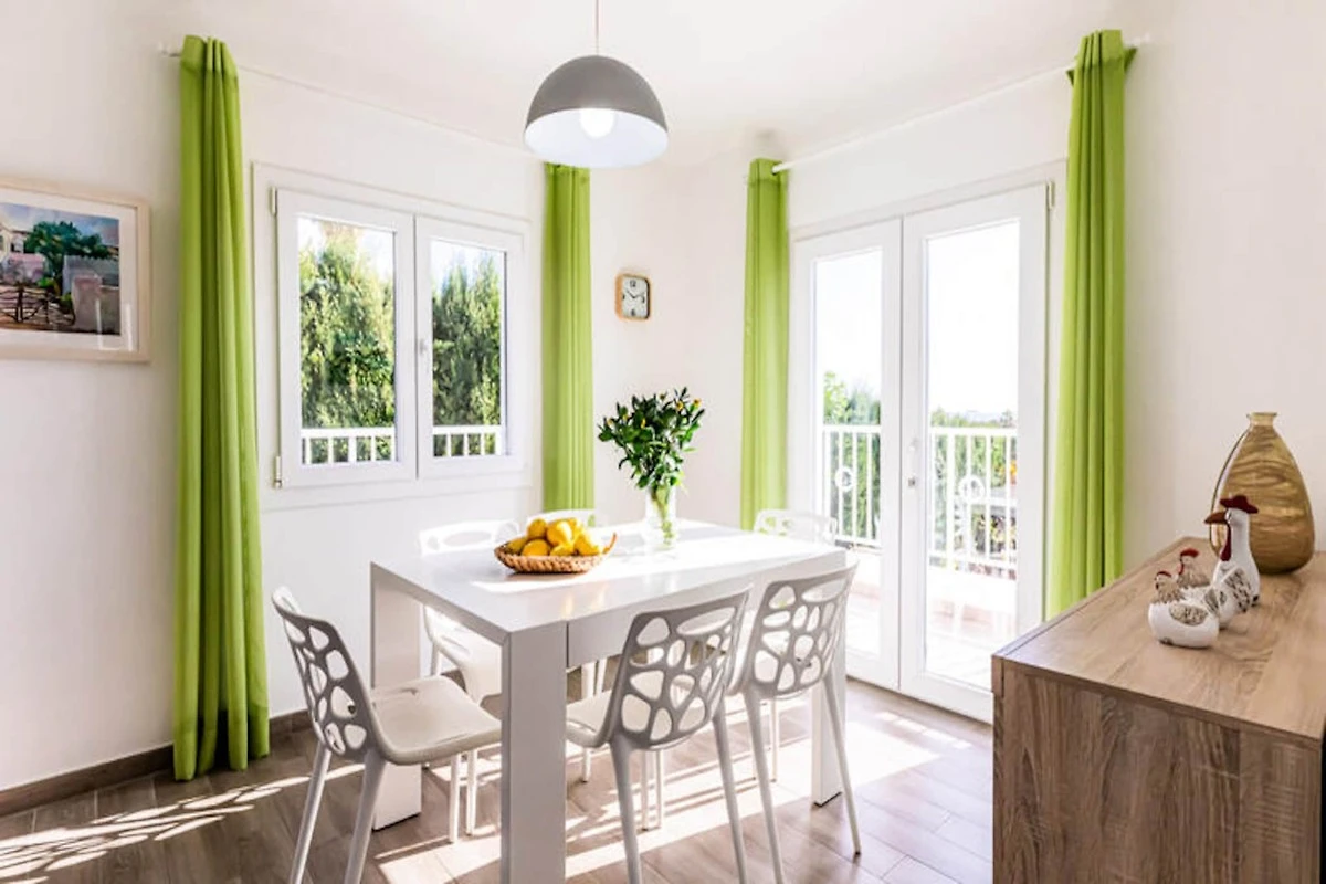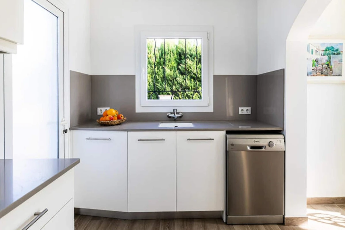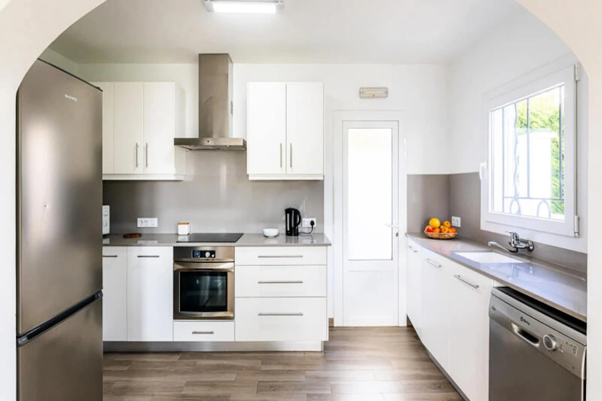 Die voll ausgestattete separate Küche verfügt über einen Kühlschrank, eine Mikrowelle, einen Backofen, einen Gefrierschrank, einen Geschirrspüler und die wichtigsten Küchenutensilien, sodass Sie Ihre Mahlzeiten ganz einfach zu Hause zubereiten können. Für zusätzlichen Komfort bietet die Villa auch eine Waschmaschine. Die Gäste können auf der Terrasse speisen oder im Garten mit Gartenmöbeln und einem Grill in einer ruhigen Atmosphäre entspannen, die perfekt ist, um das mediterrane Klima zu genießen.