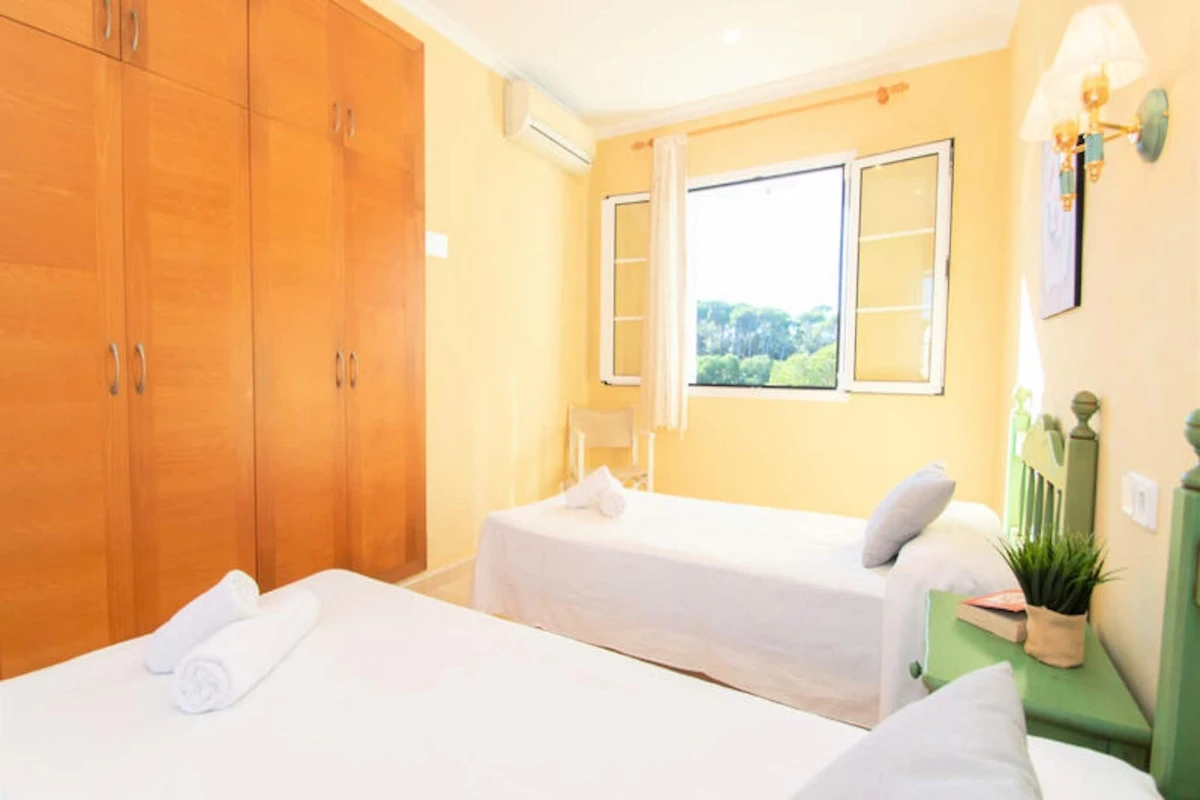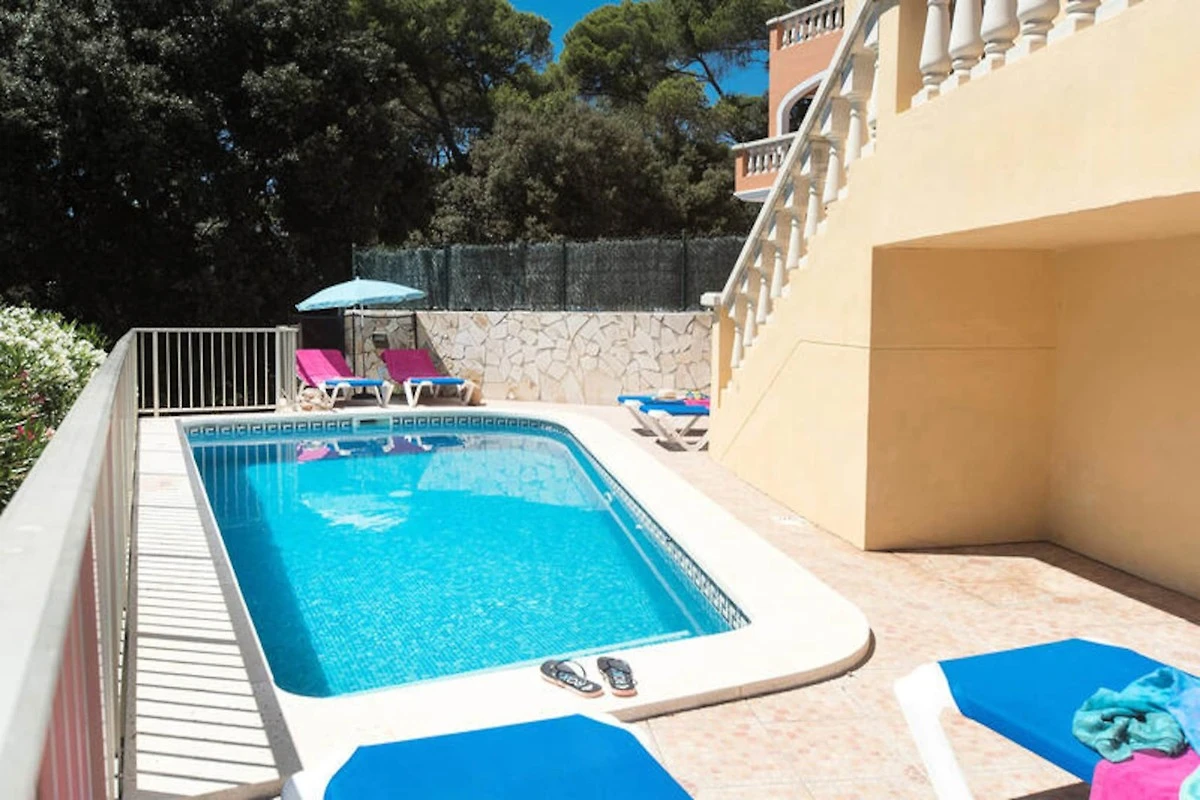 Diese wunderschצne Villa ist perfekt f�r 6 Personen und verf�gt �ber 3 Doppelzimmer und moderne Annehmlichkeiten wie Klimaanlage, WLAN und einen privaten Pool. Im Erdgeschoss befindet sich ein Schlafzimmer mit zwei Einzelbetten, wהhrend sich im Obergeschoss zwei weitere Schlafzimmer befinden, eines mit einem Doppelbett und einem privaten Balkon. Die Villa liegt in einer ruhigen Gegend, 5 Minuten vom atemberaubenden Strand Cala Galdana entfernt und ist nicht haustierfreundlich.