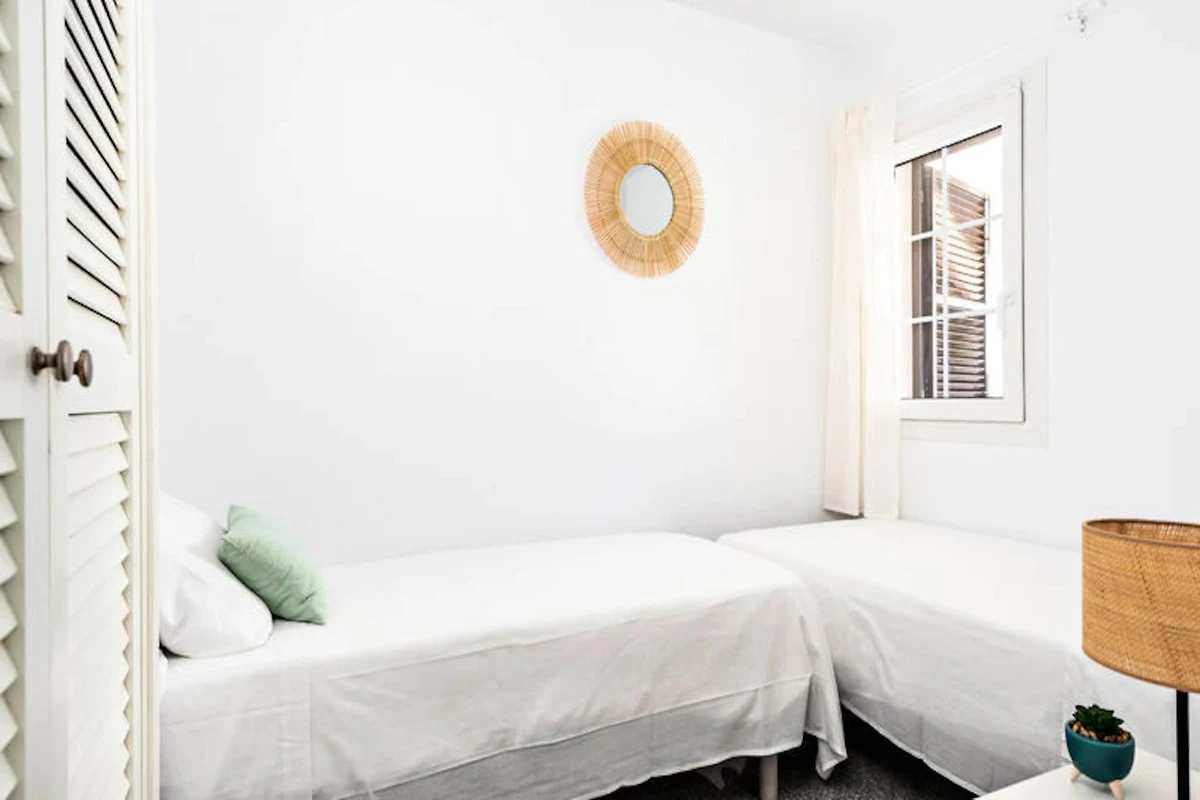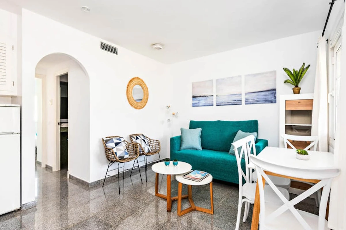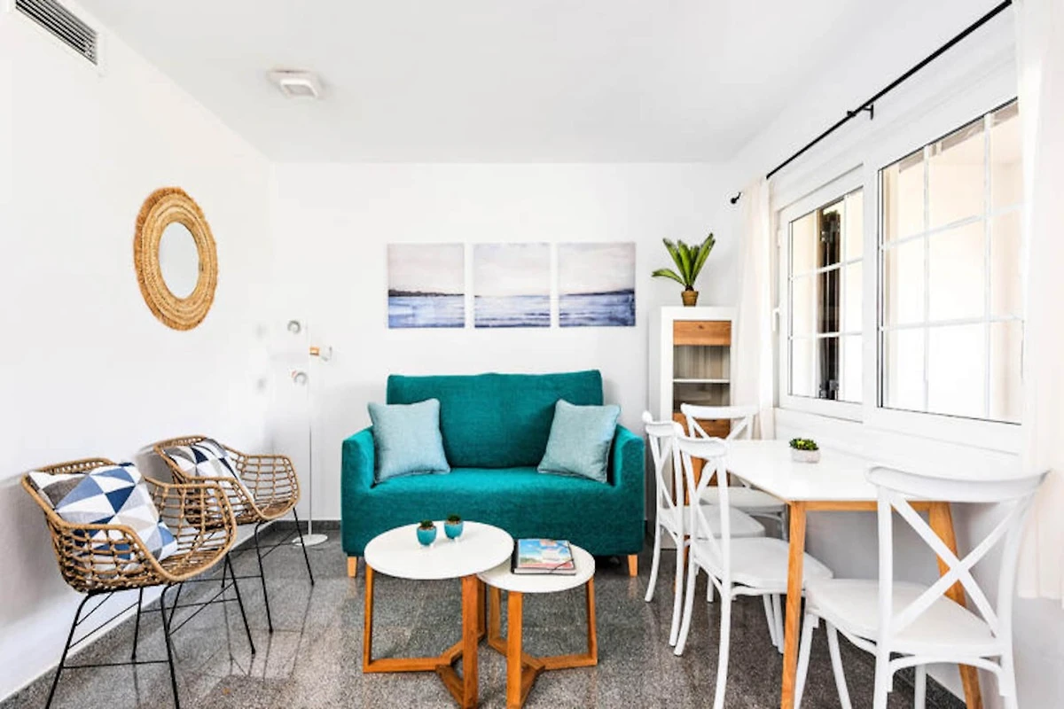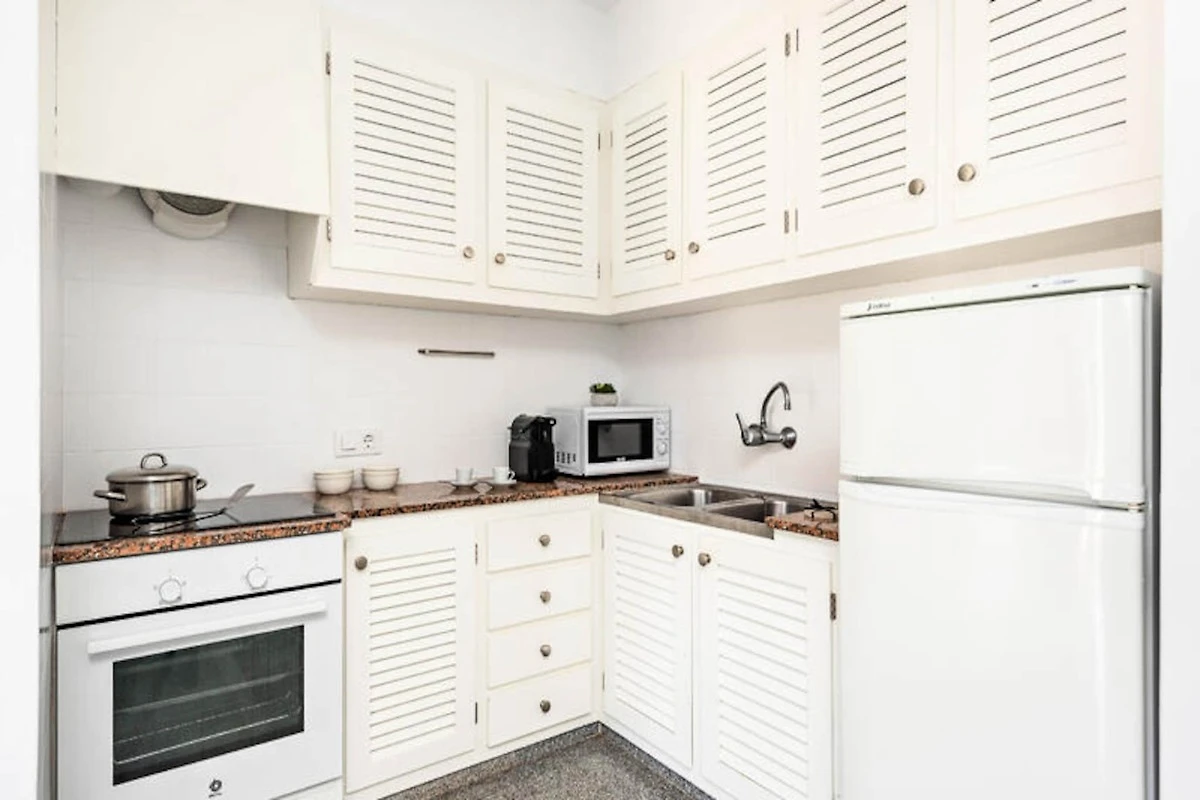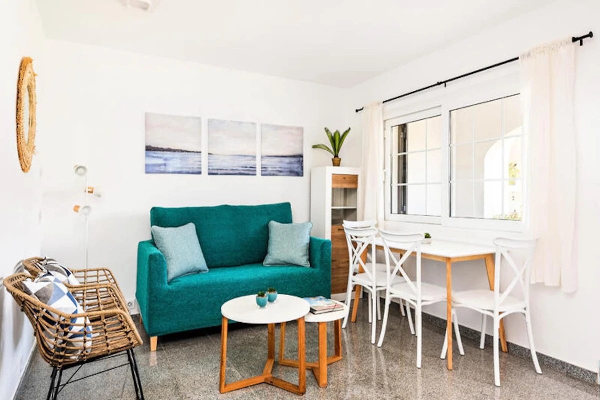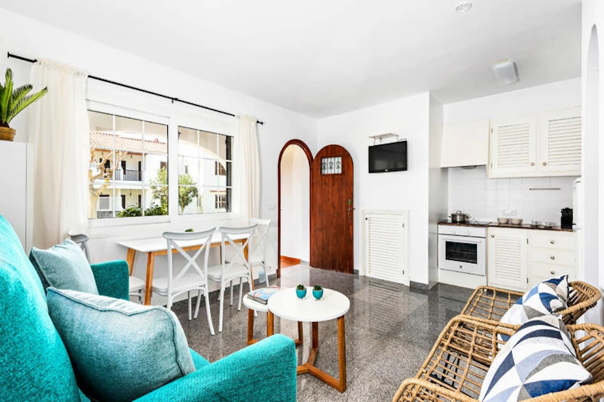 Während der Komplex über keinen eigenen Gemeinschaftspool verfügt, können Gäste gegen eine geringe Gebühr den nahegelegenen Restaurantpool nutzen. Das Apartment verfügt über eine zentrale Klimaanlage, zwei Außenterrassen, ein gemütliches Wohn-Esszimmer und Poolhandtücher für zusätzlichen Komfort. Nur 900 Meter entfernt finden Sie einen der schönsten Strände der Insel, ideal für Familien, mit Wasserspielen, Verleih und barrierefreien Dienstleistungen für Menschen mit eingeschränkter Mobilität.
