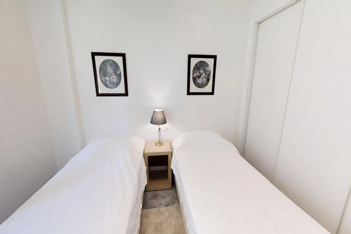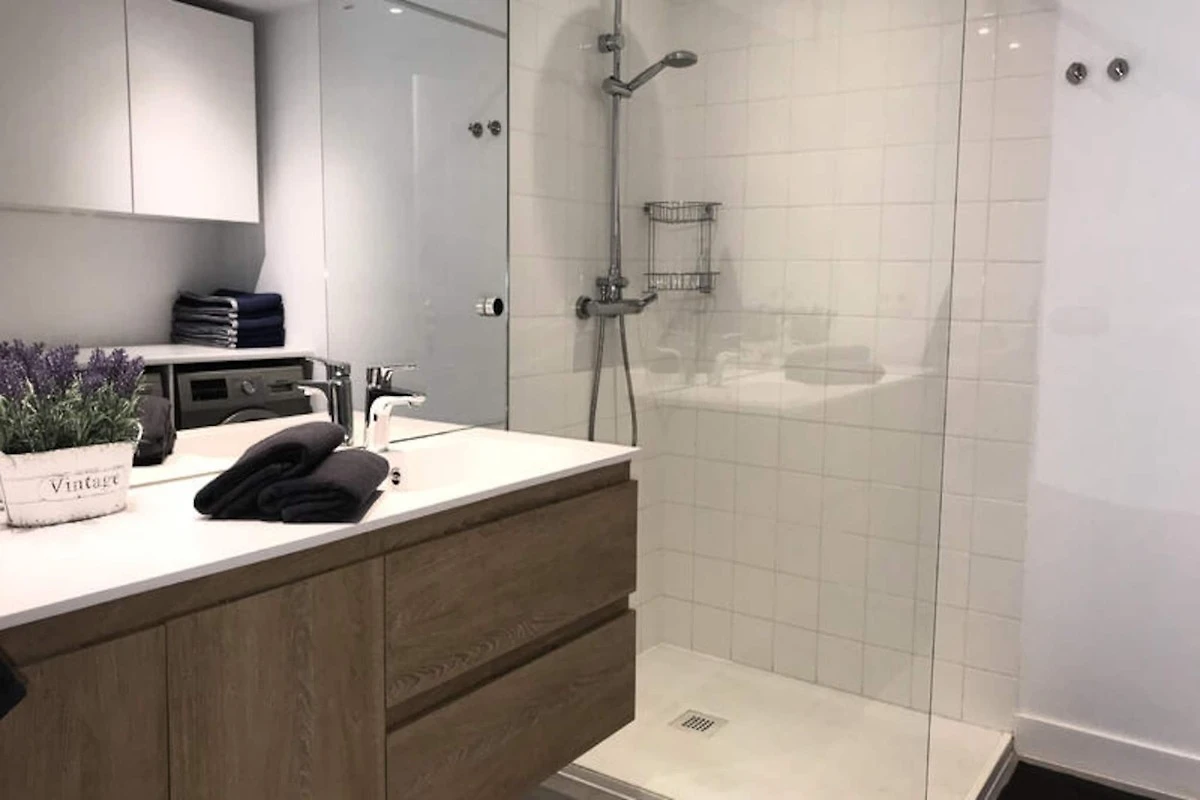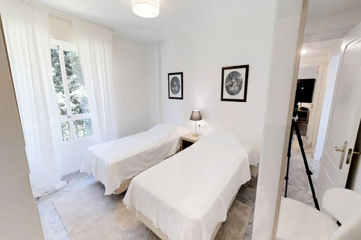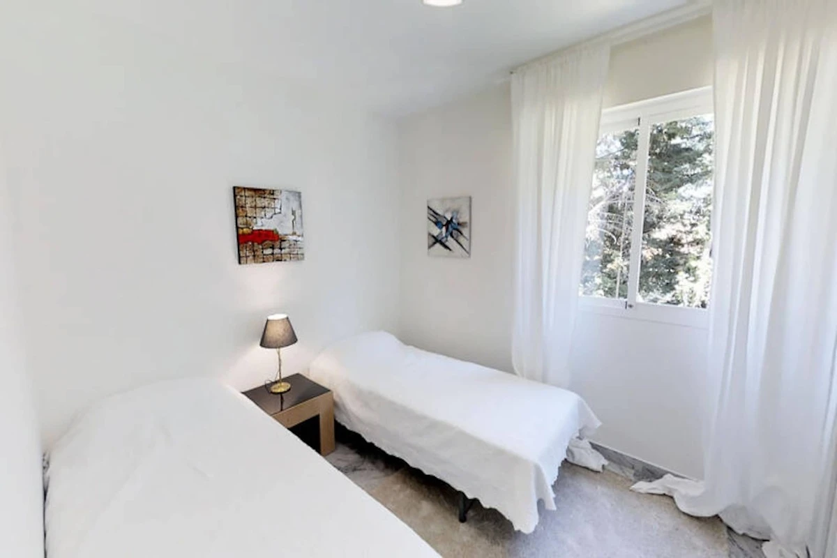 Die Wohnung verfügt über drei Schlafzimmer und zwei Badezimmer. Zwei der Schlafzimmer sind mit jeweils zwei Einzelbetten ausgestattet, während das Hauptschlafzimmer, das mehr Privatsphäre bietet, über ein eigenes Badezimmer verfügt. Das kürzlich renovierte Apartment verfügt über eine moderne Einrichtung, die das stilvolle und funktionale Design ergänzt.