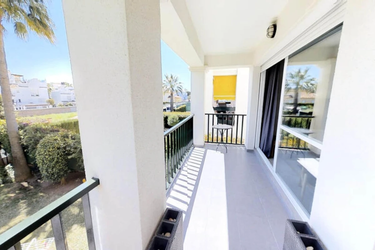 Dieses moderne Apartment befindet sich in einer sicheren Wohnanlage und bietet Zugang zu einem großen Swimmingpool, der mit anderen Bewohnern geteilt wird. Umgeben von einem weitläufigen Garten bietet es eine ruhige und entspannende Umgebung. Die Wohnung verfügt über eine 15 m² große Terrasse, auf der Sie Sonne tanken und das schöne Wetter genießen können. Im Inneren geht die offene Küche nahtlos in den komfortablen Wohnbereich über, der sich auch zur Terrasse hin öffnet.
