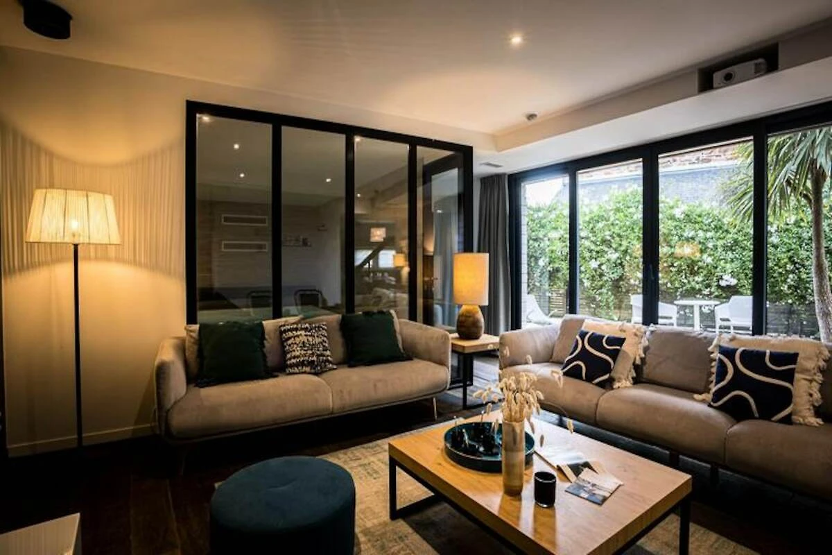 Die offenen und komfortablen Wohnzimmer sind hochwertig ausgestattet. Die Küche mit ihrer zentralen Kochinsel/Essbereich und das Wohnzimmer öffnen sich zu einem geschlossenen Innenhof, der außer Sichtweite Müßiggang und Entspannung verspricht.