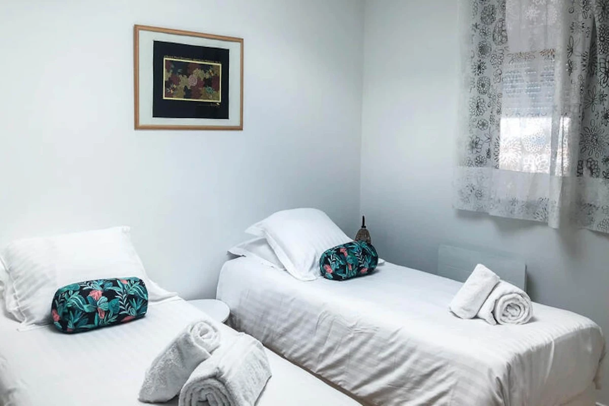 - Schlafzimmer 3 (Erdgeschoss): 2 80 cm breite Betten.