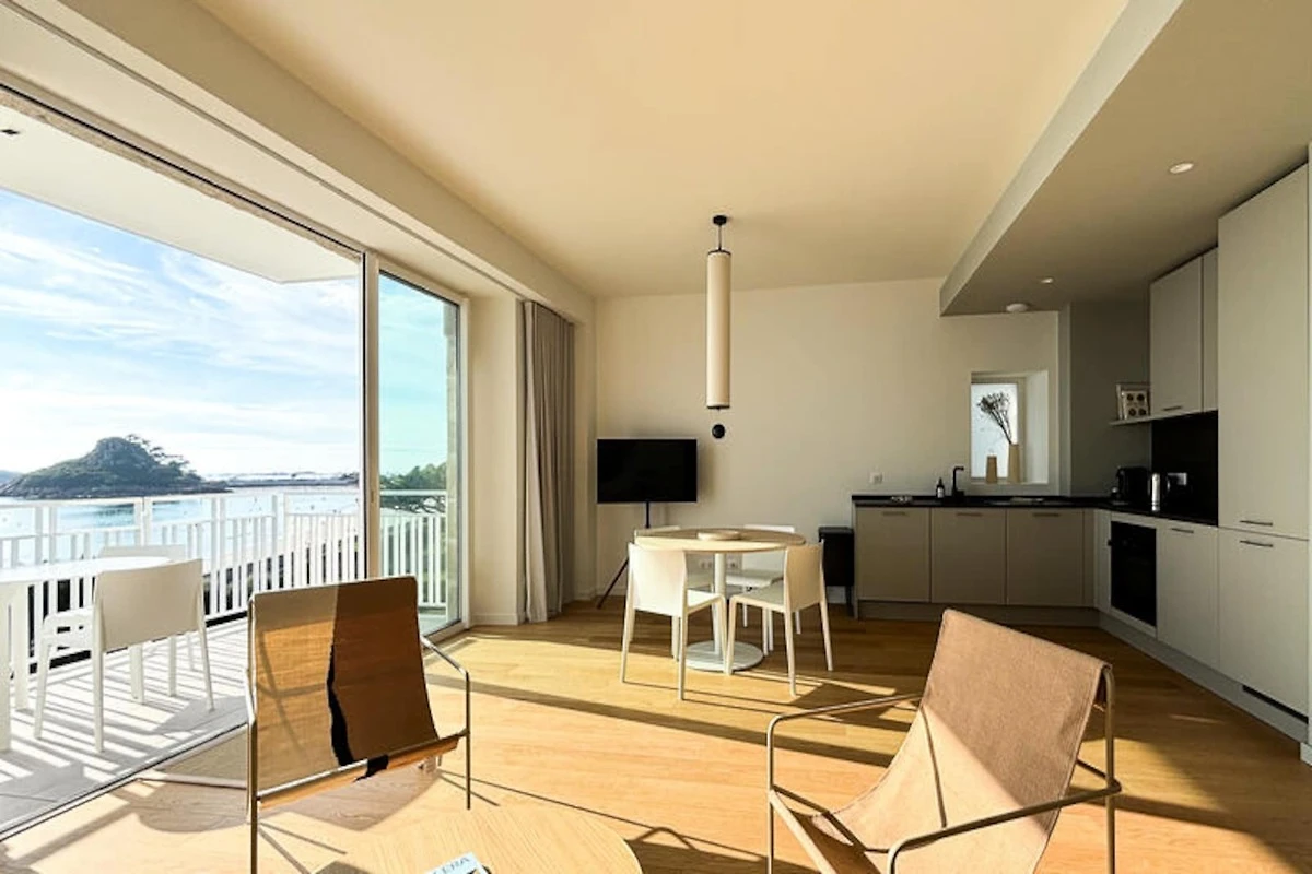 Unser geräumiges 70 m2 großes Apartment, ideal gegenüber dem Strand von Tresmeur gelegen, bietet Ihnen einen atemberaubenden Blick auf das Meer. Mit seinen drei Balkonen direkt am Meer können Sie zu jeder Tageszeit atemberaubende Panoramen genießen.