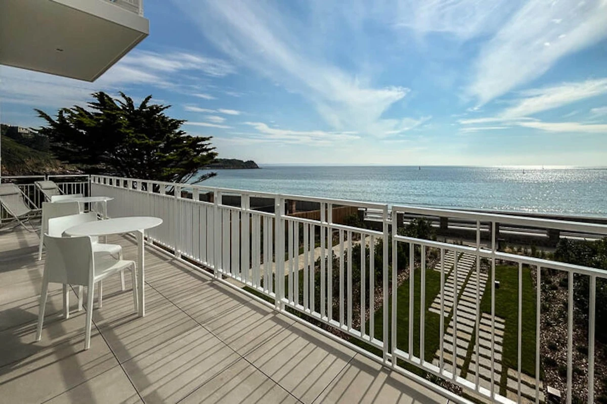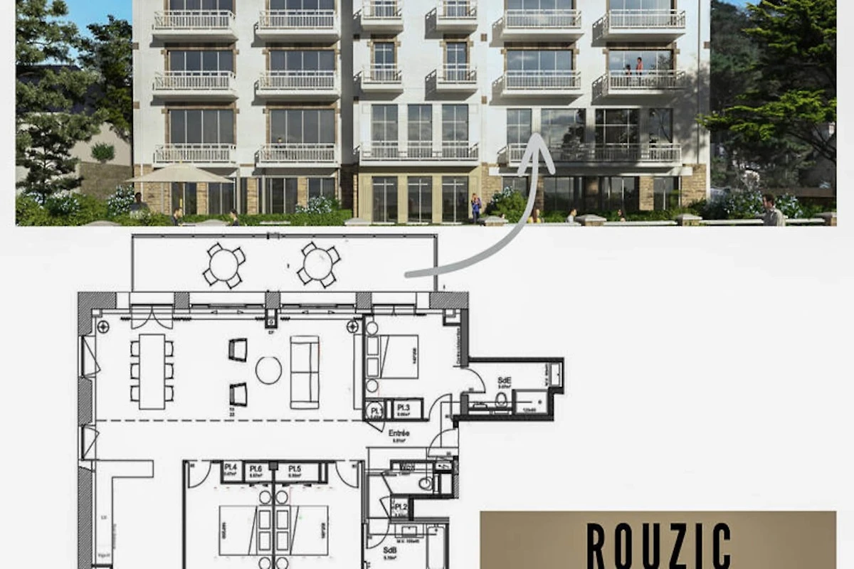 „Rouzic“ bietet Ihnen mit seinen herrlichen Außenbereichen und komfortablen Innenräumen ein außergewöhnliches Wohnumfeld. Entspannen Sie sich auf der sonnigen Terrasse von 53 m2 oder genießen Sie gesellige Momente auf dem Balkon von 20 m2 mit atemberaubendem Blick auf das Meer. Im Inneren ist das helle, 58 m² große Wohnzimmer der ideale Ort, um sich nach einem erlebnisreichen Tag mit der Familie oder Freunden zu treffen. Die 3 Schlafzimmer, darunter eine Master-Suite mit Ankleideraum und eigenem Bad, garantieren optimalen Komfort, begleitet von einem zusätzlichen Badezimmer und einer separaten Toilette für mehr Zweckmäßigkeit.