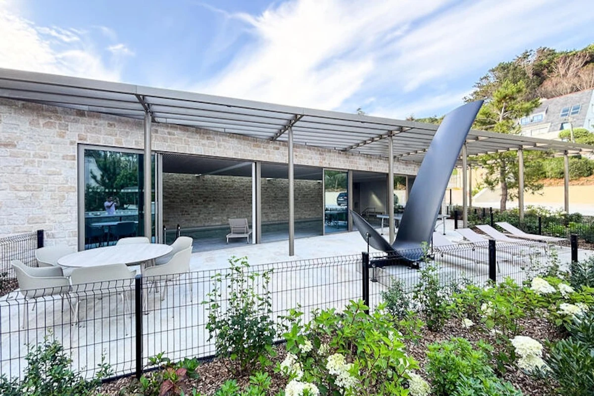 Willkommen in „La Roche Mignonne“, unserer prächtigen 3-Zimmer-Wohnung im Erdgeschoss des Centre Philippe-Joppé, entworfen vom berühmten Architekturbüro Wilmotte & Associés. Mit direktem Zugang zum Strand von Tresmeur und atemberaubendem Meerblick ist unsere Unterkunft der ideale Ort für einen unvergesslichen Urlaub am Meer.