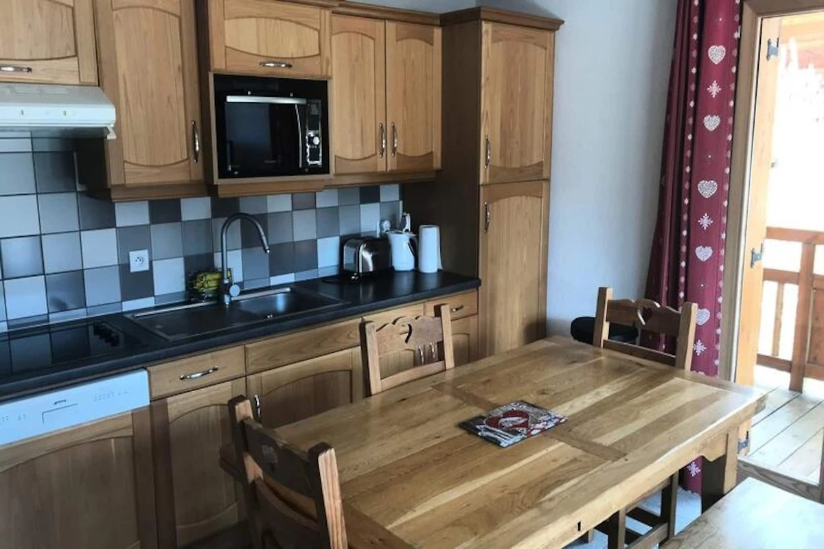 Die Wohnung verfügt über eine voll ausgestattete Küche mit 4-Flammen-Cerankochfeld, Backofen, Geschirrspüler und diversem Kochzubehör. Die beiden Badezimmer verfügen über eine Duschkabine, eine Badewanne und elektrische Handtuchtrockner. Eine große Terrasse und ein Balkon bieten einen atemberaubenden Blick auf die Berge und sind mit Gartenmöbeln ausgestattet, um die Landschaft zu genießen. Eine Einzelgarage und kostenlose Parkplätze vor der Residenz erhöhen den Komfort.