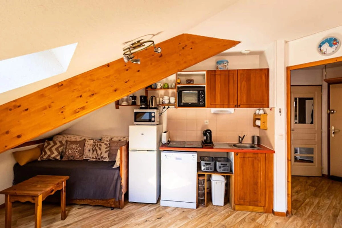 Das Apartment liegt im Herzen des Skigebiets Orres 1800 und bietet direkten Zugang zu den Pisten, was es zu einer idealen Wahl für Wintersportler macht. Es liegt nur 50 Meter von der Schneefront und den Skiliften entfernt und bietet bequemen Zugang zu den Skigebieten des Berges. Durch die zentrale Lage erreichen Gäste außerdem die Geschäfte, Restaurants und Bars des Resorts bequem zu Fuß und haben so einfachen Zugang zu den Dingen des täglichen Bedarfs und den gastronomischen Einrichtungen. Darüber hinaus organisiert das Resort das ganze Jahr über eine Vielzahl von Aktivitäten für Besucher, was es zu einem ganzjährigen Reiseziel macht. Ein privater Parkplatz mit direktem Aufzugzugang zur Unterkunft kann gegen Aufpreis arrangiert werden, was den Komfort des Standorts erhöht.