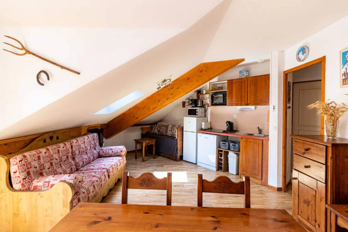 Das Anwesen bietet zusammen mit seiner bezaubernden alpinen Atmosphäre eine komfortable Unterkunft für bis zu 6 Personen, ideal für Familien oder kleine Gruppen. Es verfügt über ein geräumiges Doppelzimmer mit eigenem Balkon und einen gemütlichen Schlafbereich mit zwei Etagenbetten. Das kürzlich hinzugefügte Schlafsofa im Wohnzimmer bietet zusätzliche Schlafgelegenheiten. Das Apartment verfügt über ein großes Wohnzimmer mit zwei Sofas, einem angeschlossenen Fernseher und einem elektrischen Kamin, der einen gemütlichen Rückzugsort nach einem Tag voller Aktivitäten im Freien bietet. Haustiere sind gegen eine zusätzliche Gebühr erlaubt. Gäste können auch den beheizten Außenpool und die Saunen nutzen, die zu bestimmten Jahreszeiten geöffnet sind. Das Anwesen bietet keine kostenlosen Aktivitäten an, aber die Nähe zu lokalen Sehenswürdigkeiten bietet zahlreiche Möglichkeiten zur Unterhaltung und Erkundung.