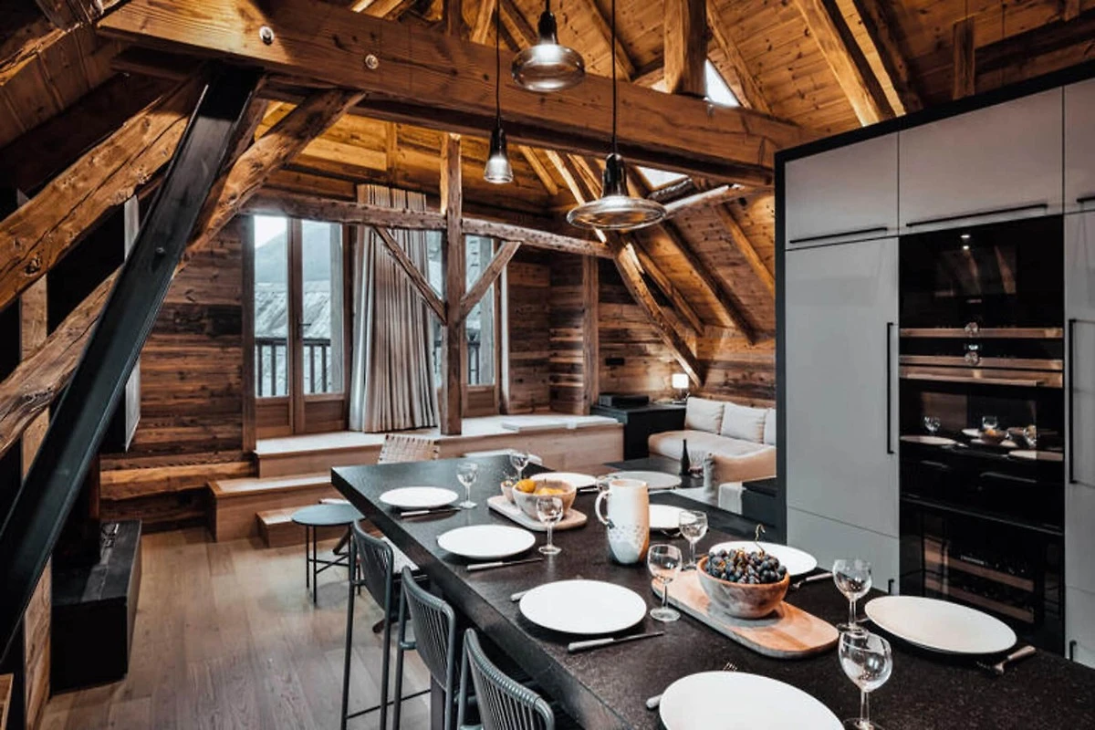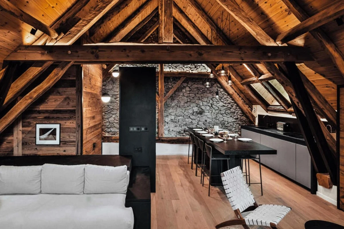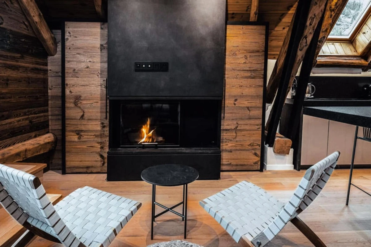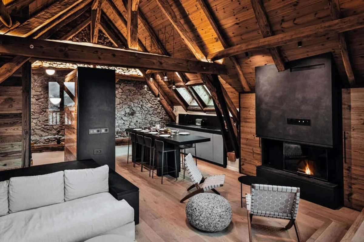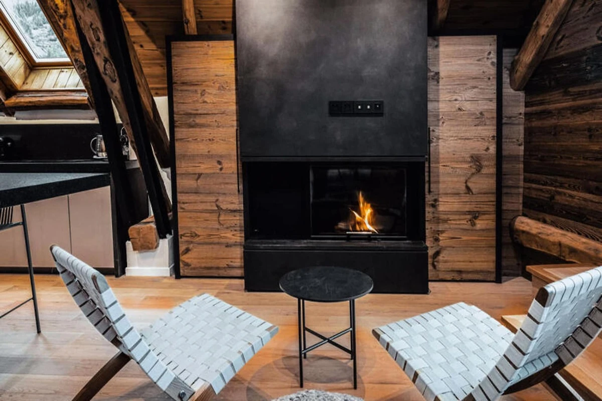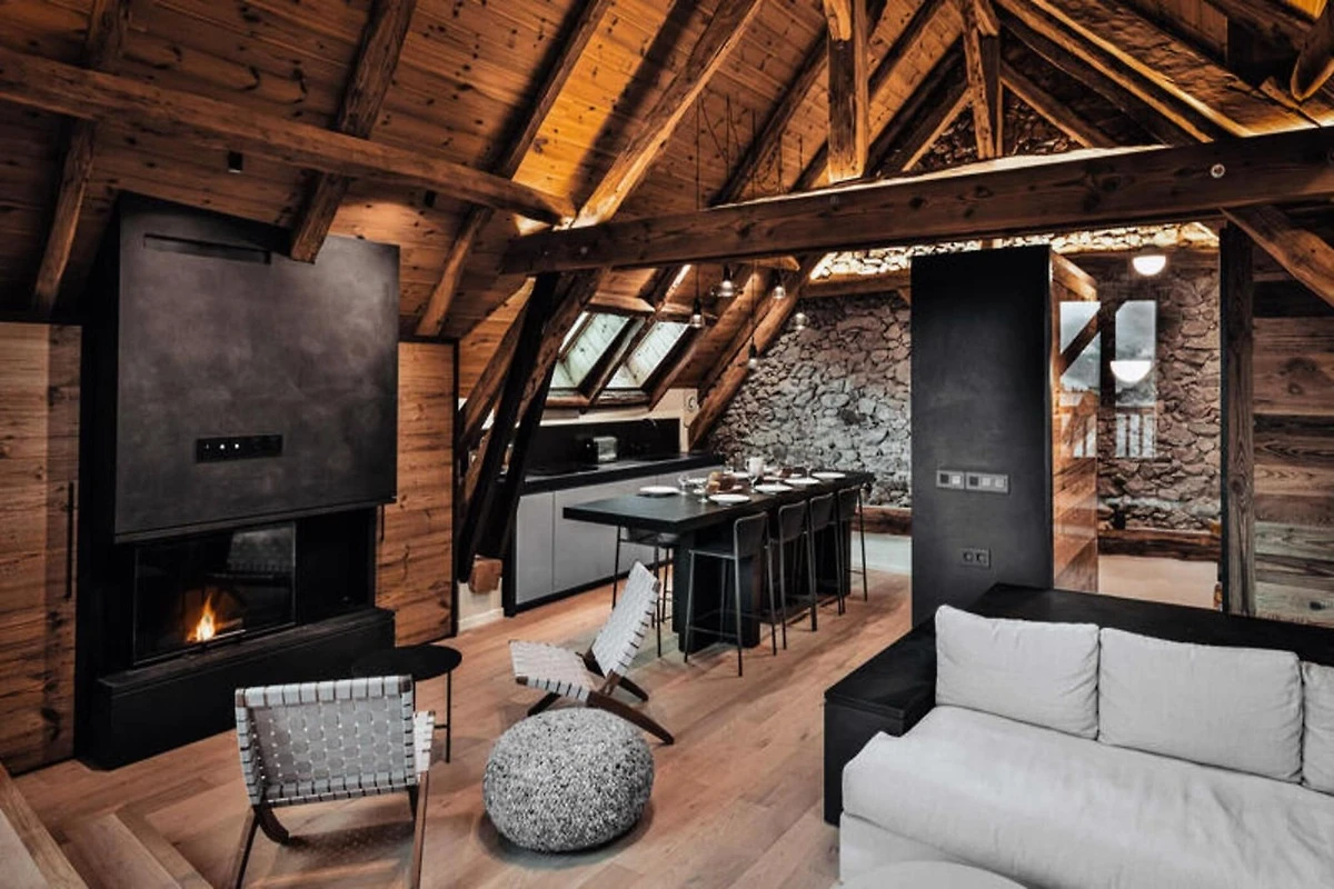 Dieses atemberaubende Maisonette-Apartment verbindet modernes Design nahtlos mit traditioneller Bergarchitektur und bietet einen gemütlichen Rückzugsort für bis zu acht Gäste. Auf der ersten Ebene befinden sich ein Schlafsaal mit zwei Etagenbetten (vier Einzelbetten), ein Doppelzimmer mit eigener Dusche und Fernseher sowie ein weiteres Doppelzimmer mit Fernseher. Eine separate Toilette und ein Badezimmer mit Badewanne runden die Raumaufteilung ab. Die obere Ebene verfügt über einen geräumigen Wohnbereich mit Kamin, einen Essbereich und eine offene Küche, die zu einem Balkon führt, der einen Panoramablick auf die umliegenden Berge bietet. Diese haustierfreie Unterkunft sorgt für eine ruhige und allergikerfreundliche Umgebung.