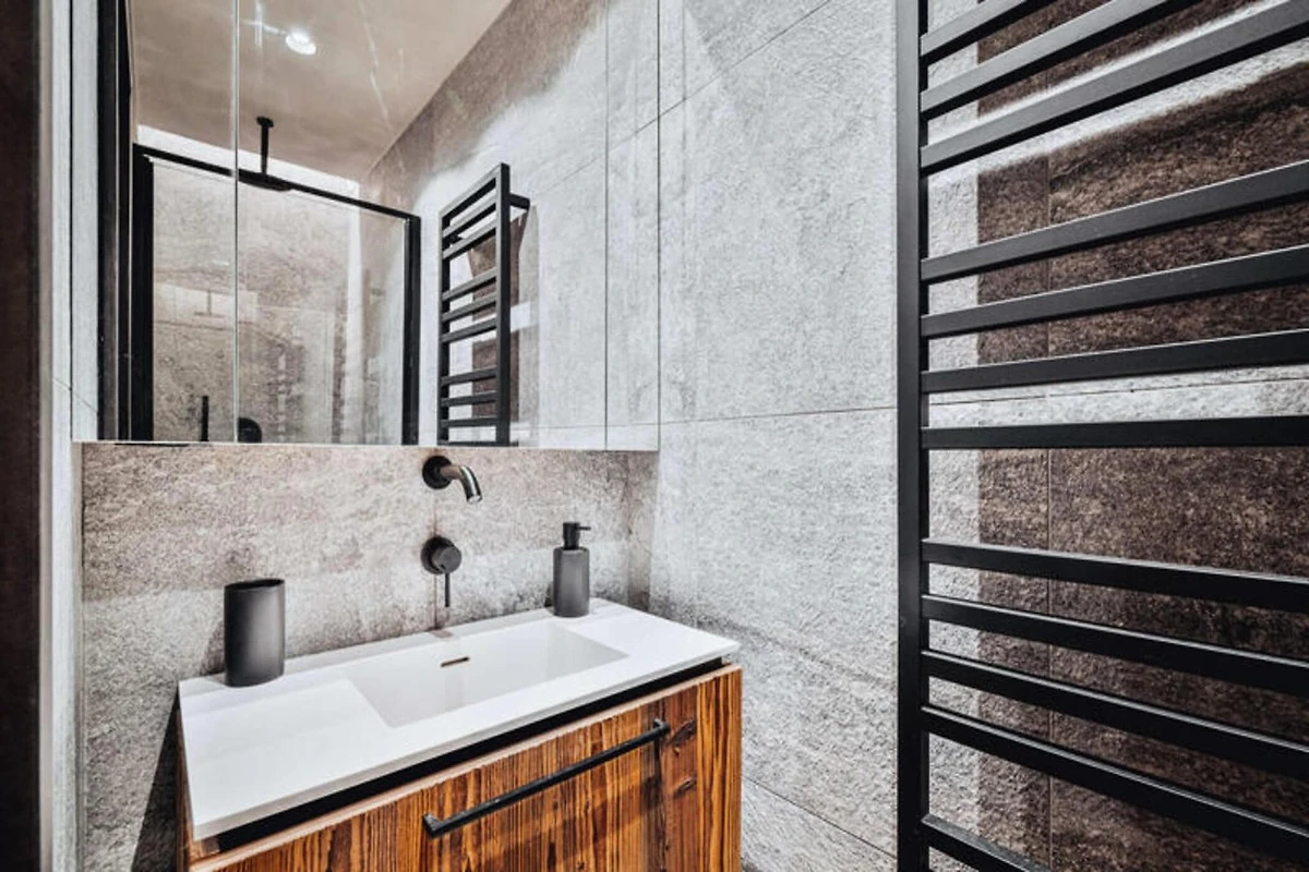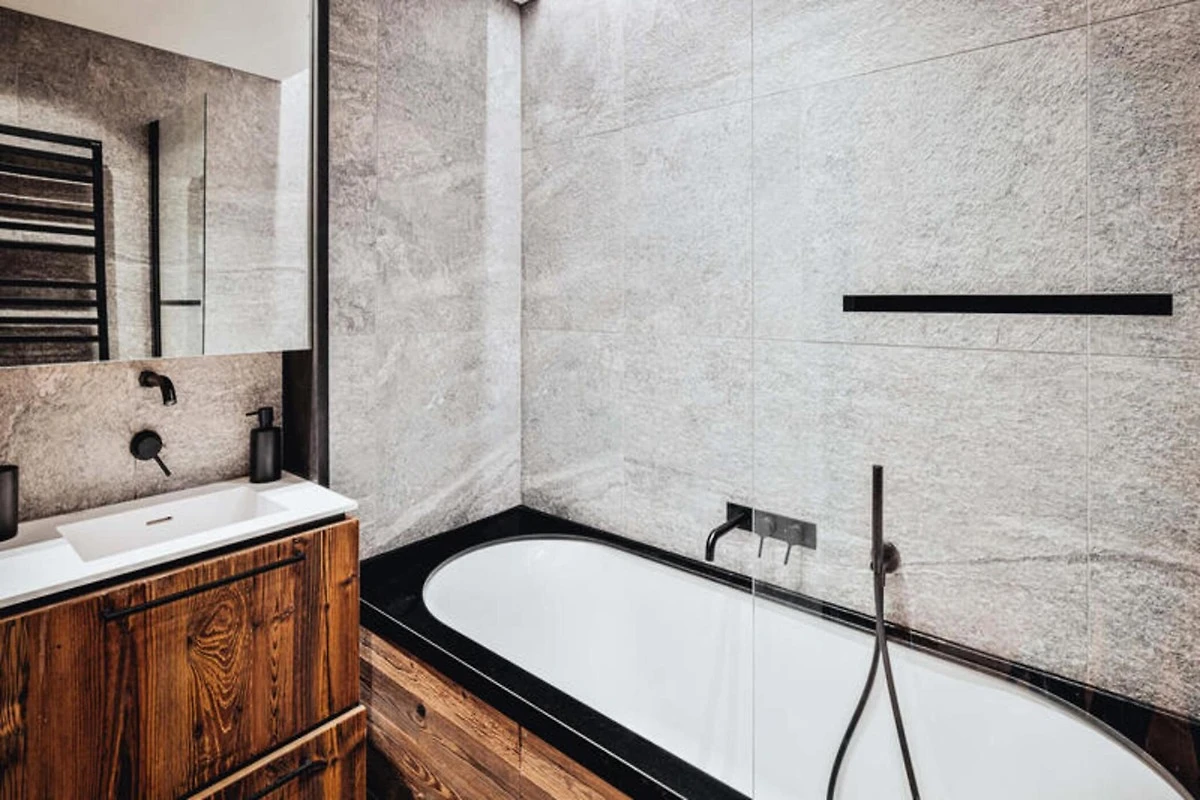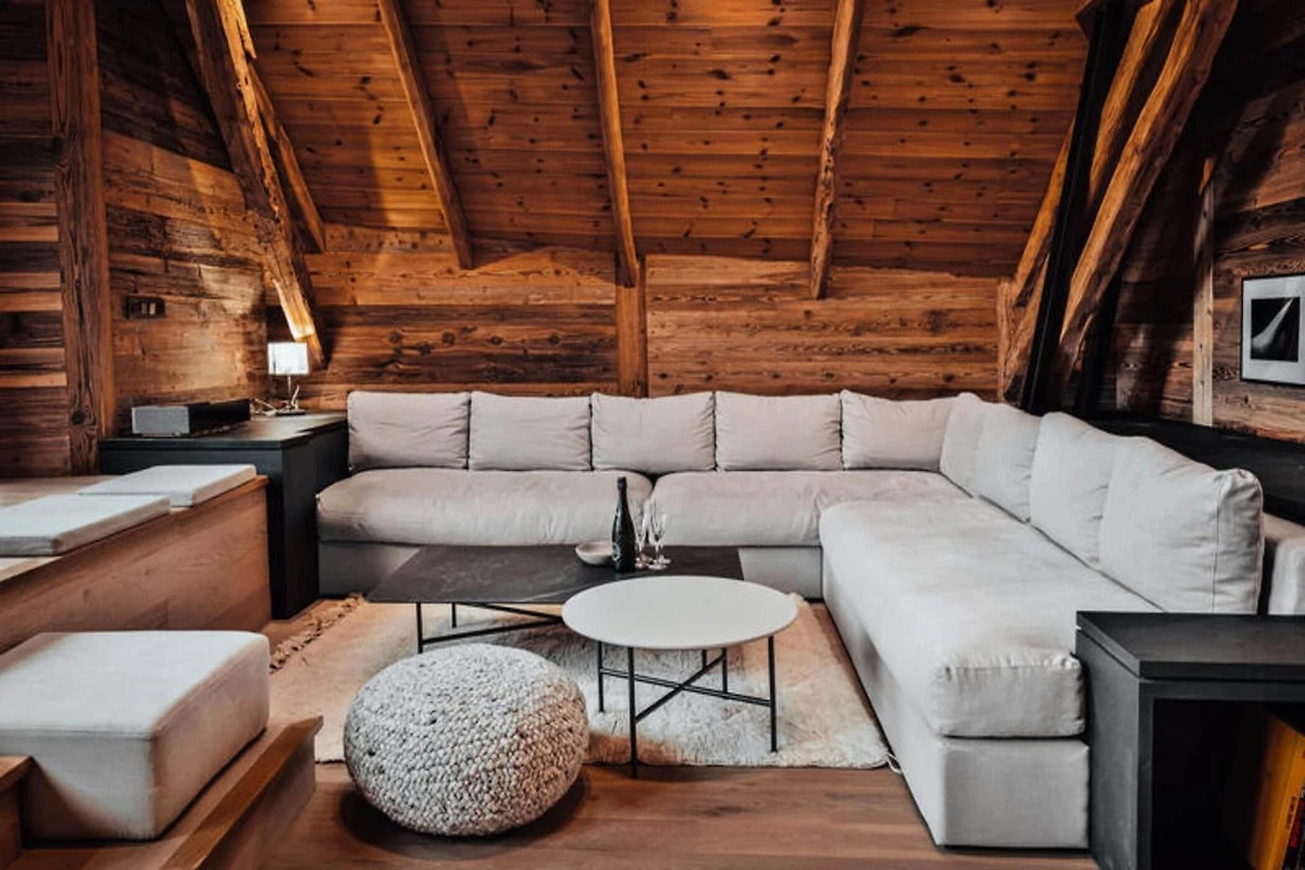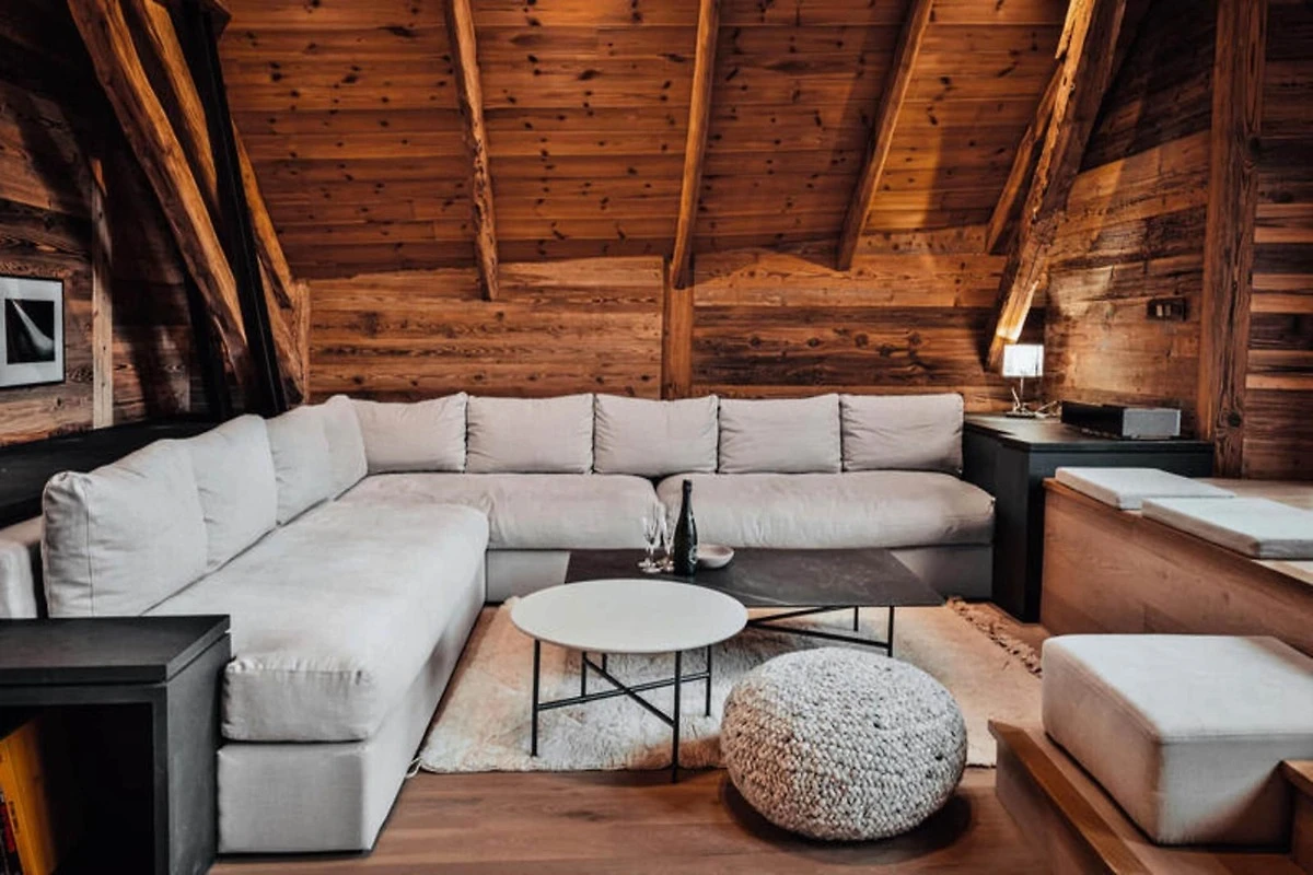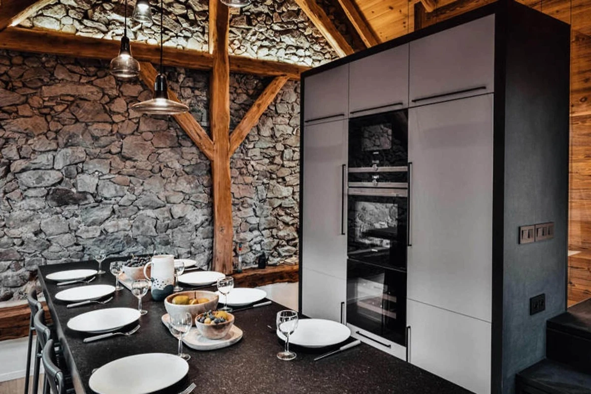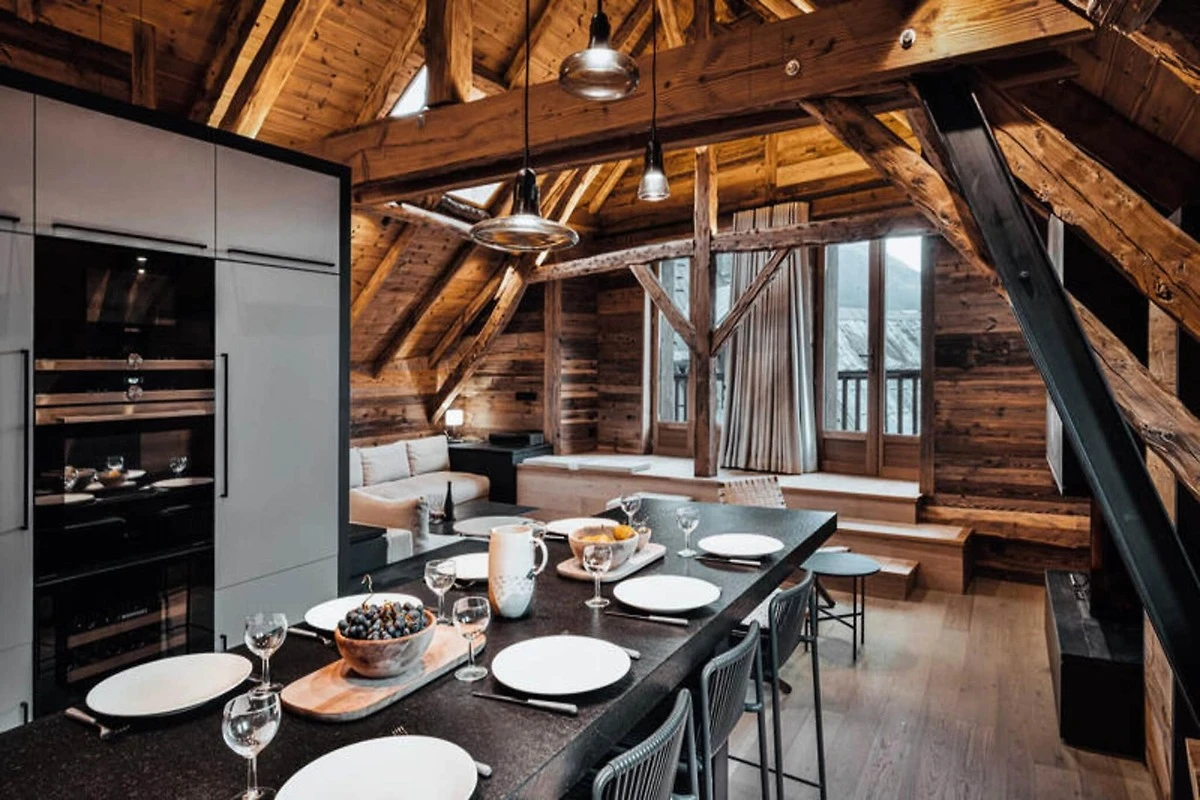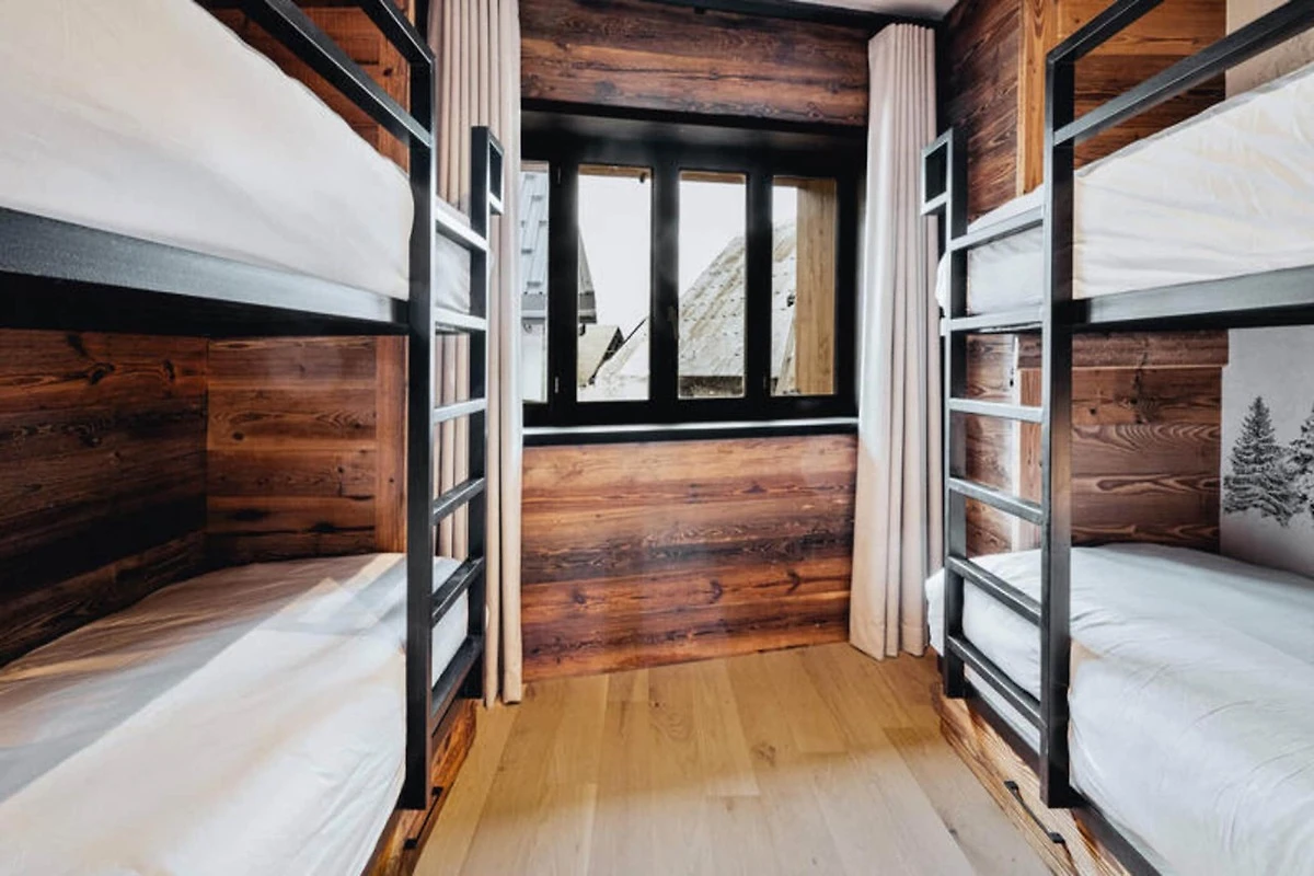 Dieses atemberaubende Maisonette-Apartment verbindet modernes Design nahtlos mit traditioneller Bergarchitektur und bietet einen gemütlichen Rückzugsort für bis zu acht Gäste. Auf der ersten Ebene befinden sich ein Schlafsaal mit zwei Etagenbetten (vier Einzelbetten), ein Doppelzimmer mit eigener Dusche und Fernseher sowie ein weiteres Doppelzimmer mit Fernseher. Eine separate Toilette und ein Badezimmer mit Badewanne runden die Raumaufteilung ab. Die obere Ebene verfügt über einen geräumigen Wohnbereich mit Kamin, einen Essbereich und eine offene Küche, die zu einem Balkon führt, der einen Panoramablick auf die umliegenden Berge bietet. Diese haustierfreie Unterkunft sorgt für eine ruhige und allergikerfreundliche Umgebung.