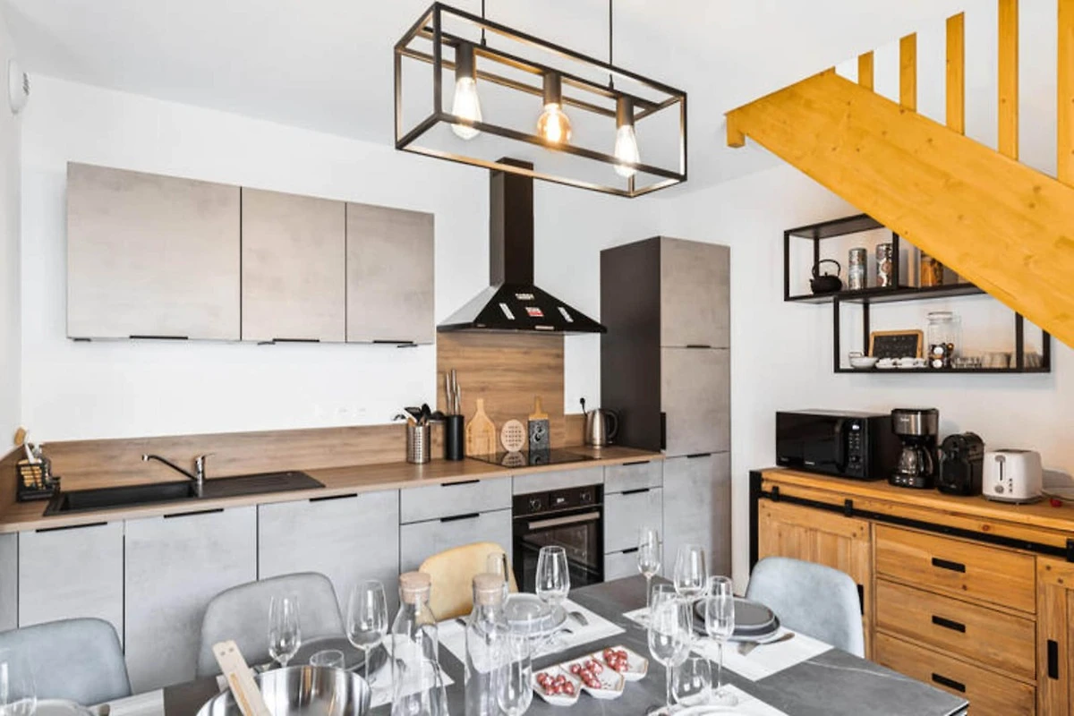 Dieses moderne Maisonette-Apartment bietet eine gemütliche, moderne Atmosphäre und eignet sich perfekt für Gruppen oder Familien mit Platz für bis zu 8 Gäste. Im Erdgeschoss befinden sich ein Schlafzimmer mit Doppelbett, ein geräumiger Wohnbereich mit offener Küche, ein separates Duschbad mit Waschmaschine und Trockner sowie eine separate Toilette. Die Wohnung ist nicht haustierfreundlich und das Rauchen ist strengstens untersagt. Die große Südterrasse bietet einen idealen Außenbereich zum Entspannen und ein Außenparkplatz sorgt für Komfort. Zur Wohnung gehört außerdem die notwendige Bettwäsche (Bettwäsche, Handtücher) und die Betten sind bei der Ankunft bezogen.