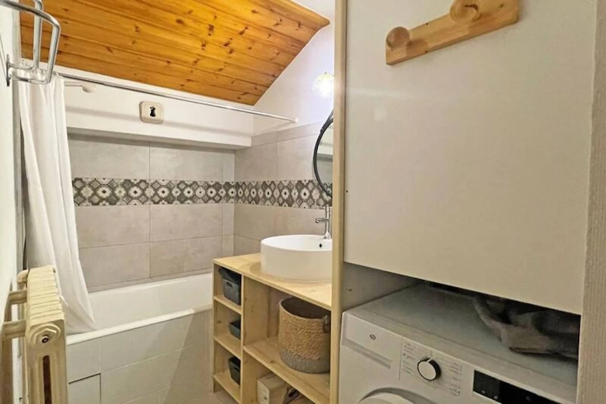 Een badkamer met wasmachine en apart toilet. Een tweepersoonsslaapkamer met een bed van 140 cm en kast, een tweede slaapkamer met 2 stapelbedden van 90 cm en 2 kasten. Het appartement beschikt over een skiberging en een parkeerplaats.