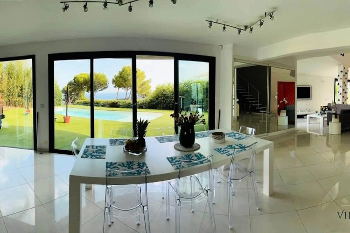 Deze prachtige architect ontworpen villa van 225 m², allemaal voorzien van airconditioning, verwelkomt u in de hoogten van Vallauris - Golfe Juan met zijn uitzonderlijk uitzicht op zee en zijn Provençaalse tuin van 800 m² georiënteerd op het zuiden en niet direct over het hoofd gezien.