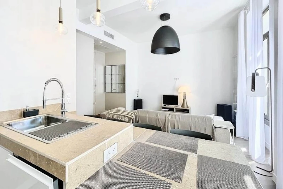Das Studio verfügt über eine offene, voll ausgestattete Küche mit Mikrowelle, Backofen und allen notwendigen Geräten. Zu den weiteren Annehmlichkeiten gehören ein Bügeleisen und ein Wäschetrockner. Ein professioneller Reinigungsservice sorgt für einen angenehmen Aufenthalt und die zentrale Lage des Apartments macht es zum perfekten Ausgangspunkt für die Erkundung von Cannes und seinen vielen Sehenswürdigkeiten.