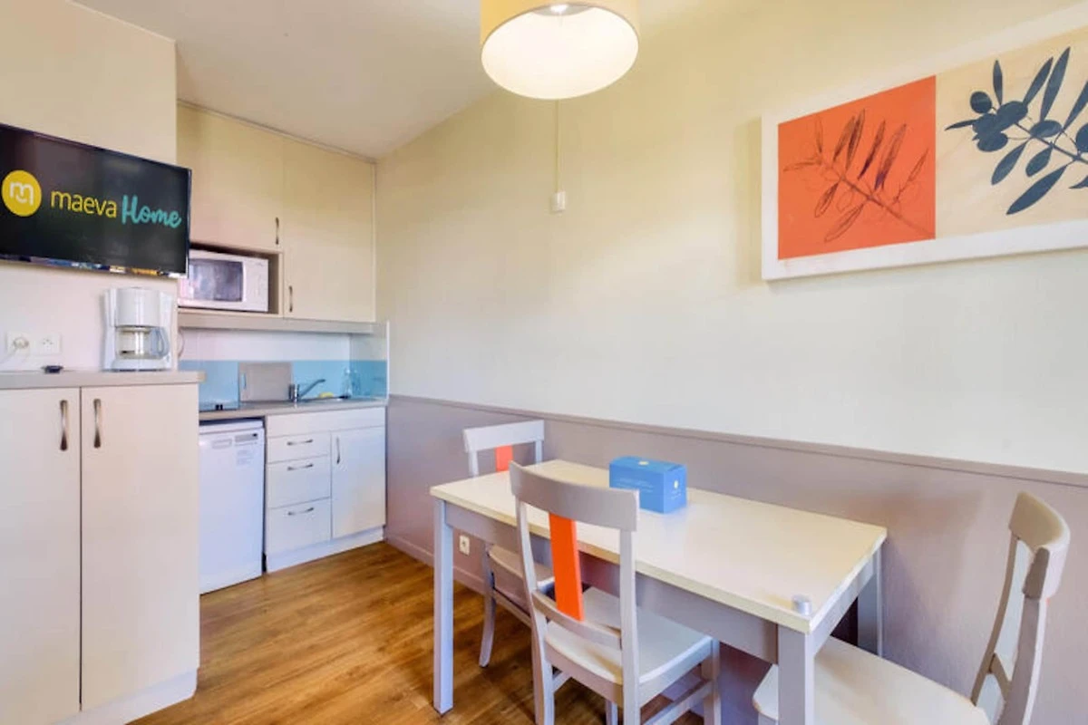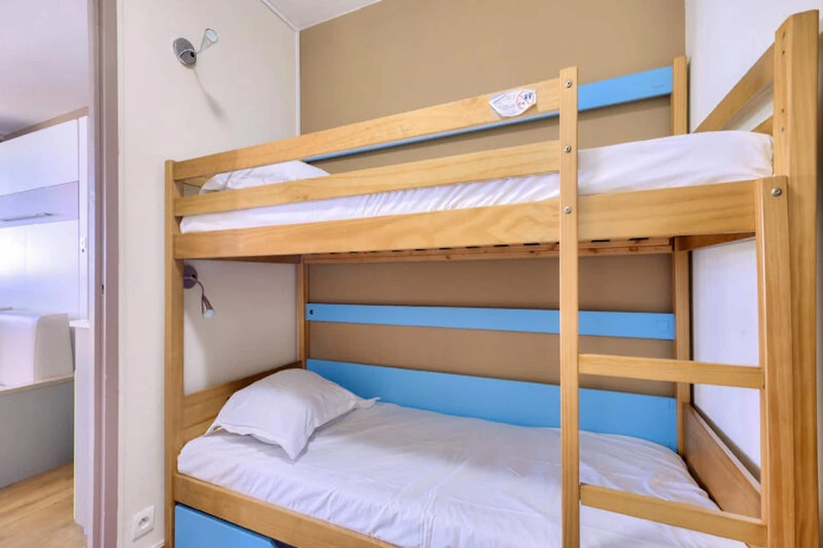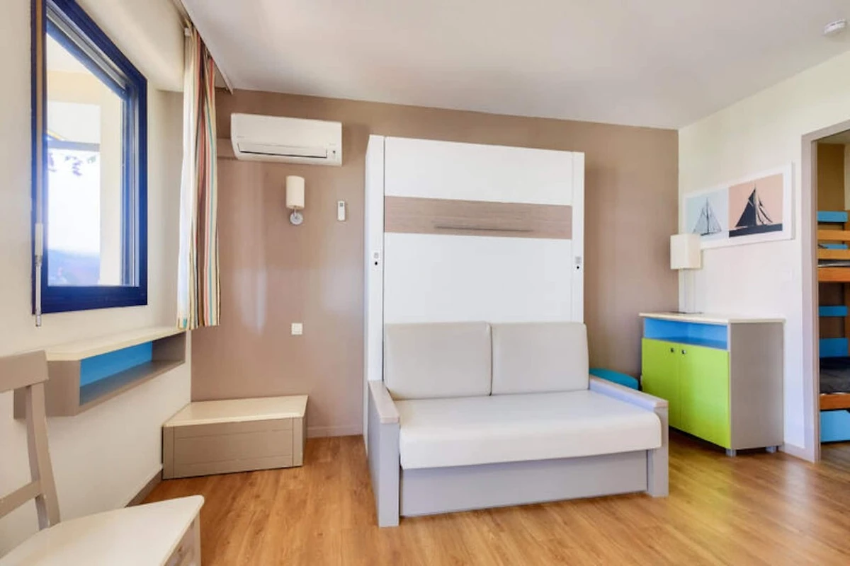 Das Anwesen verfügt über einen einladenden Außenpool, der von April bis Mitte Oktober zur Verfügung steht und den Bewohnern einen erfrischenden Rückzugsort bietet (gegen Aufpreis). Für Aktive gibt es in der Nähe Golf- und Tennisplätze sowie einen Pétanque-Platz, der sich perfekt zum Ausprobieren dieser beliebten lokalen Freizeitbeschäftigung eignet. Die Unterkunft umfasst einen komfortablen Wohnbereich mit einem Schlafsofa, eine halboffene Küche, eine Kabine mit Etagenbetten und ein Badezimmer mit modernen Annehmlichkeiten, die einen komfortablen und praktischen Aufenthalt gewährleisten.