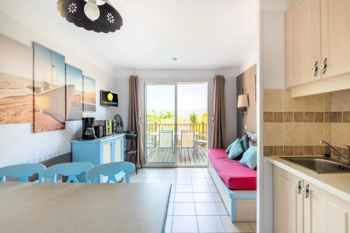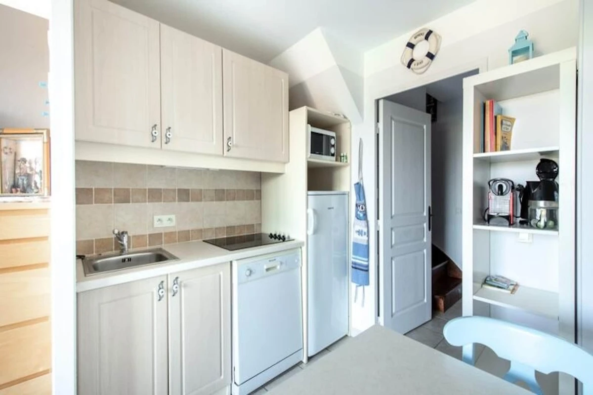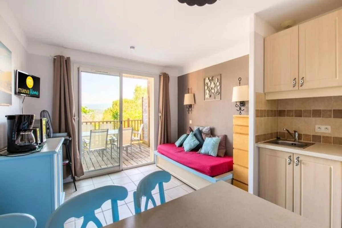 Das Apartment verfügt über eine gut ausgestattete Küche mit allem Nötigen, einschließlich Kühlschrank, Herd und Mikrowelle. Der moderne Waschraum verfügt über eine Dusche und eine Waschmaschine für zusätzlichen Komfort. Gäste können außerdem einen privaten Balkon mit herrlicher Aussicht genießen, der sich perfekt zum Entspannen nach einem erlebnisreichen Tag eignet.