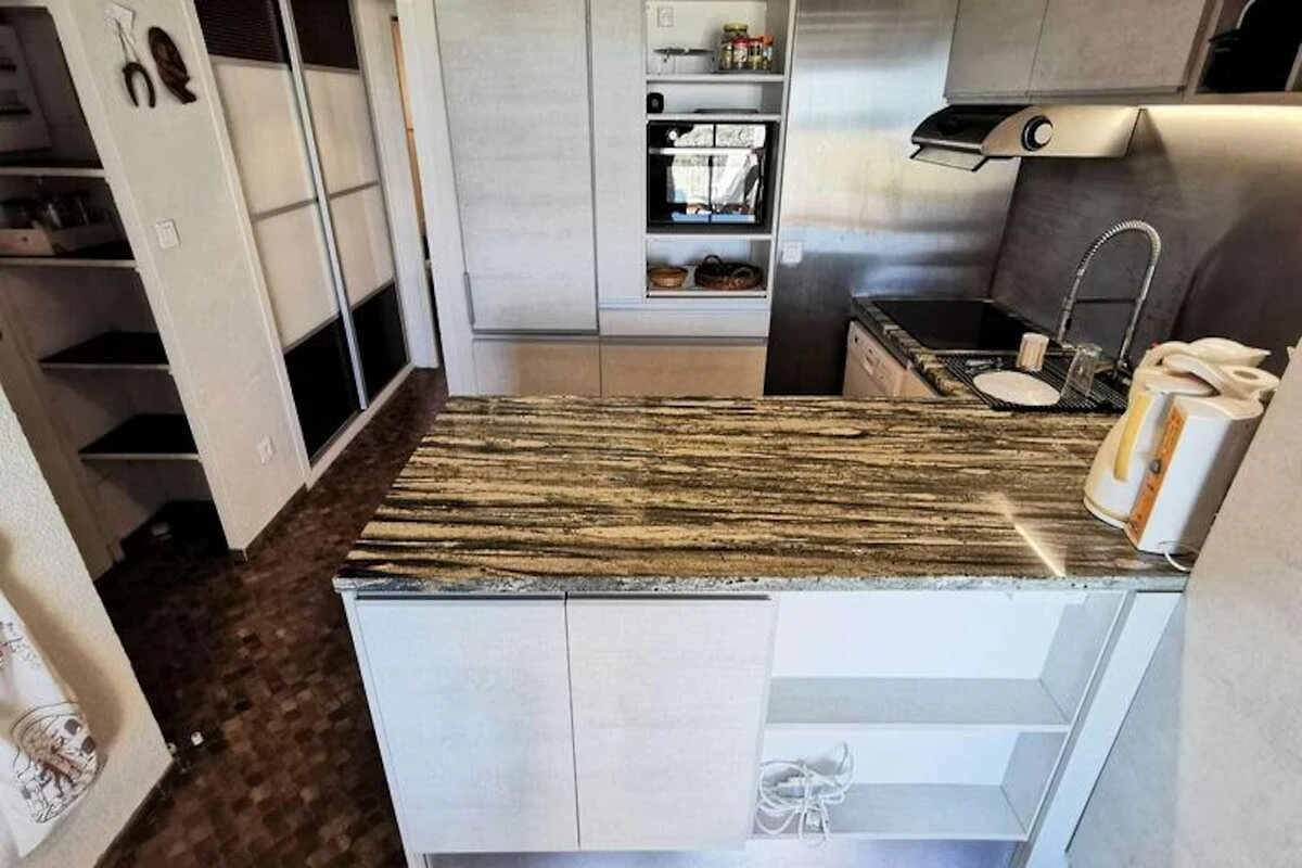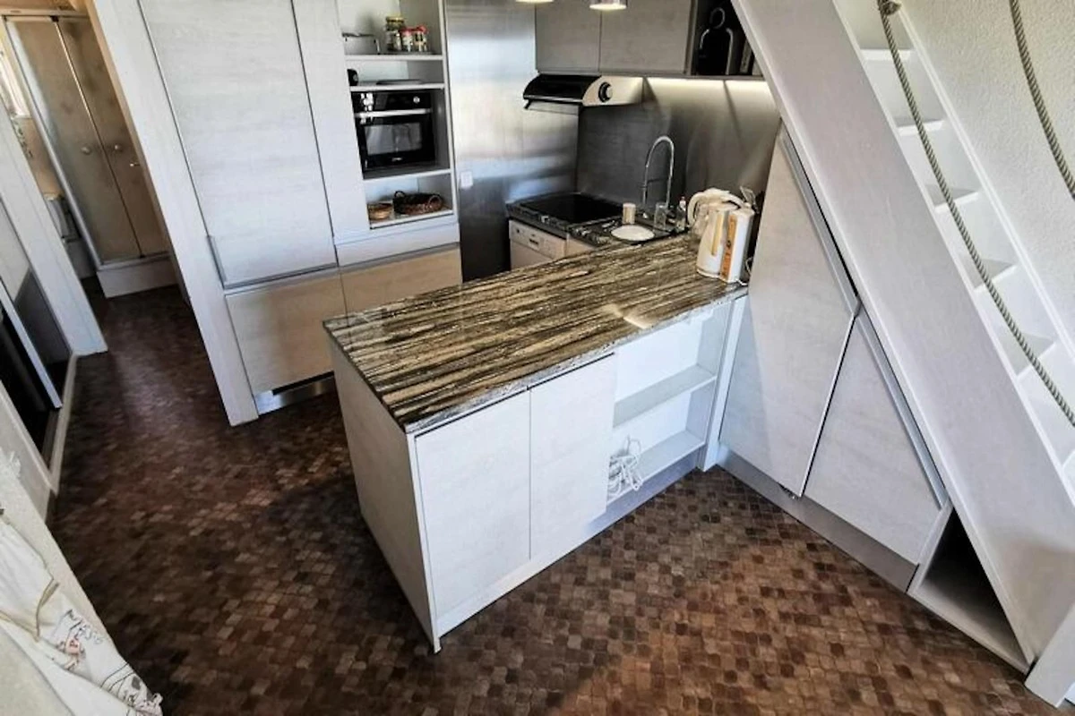 Dieses für bis zu 6 Personen ausgelegte Dreizimmer-Mezzanine-Apartment bietet komfortable Unterkünfte mit zwei Schlafzimmern, jeweils ausgestattet mit einem 160 cm breiten Doppelbett, und einem Mezzanine-Apartment mit zwei Einzelbetten. Das Apartment ist nicht haustierfreundlich, so dass eine ruhige Umgebung für alle Gäste gewährleistet ist. Zu den modernen Annehmlichkeiten gehören ein Fernseher, ein Cerankochfeld, ein Minibackofen, ein Geschirrspüler, ein Kühlschrank mit Gefrierfach und eine Waschmaschine für zusätzlichen Komfort.