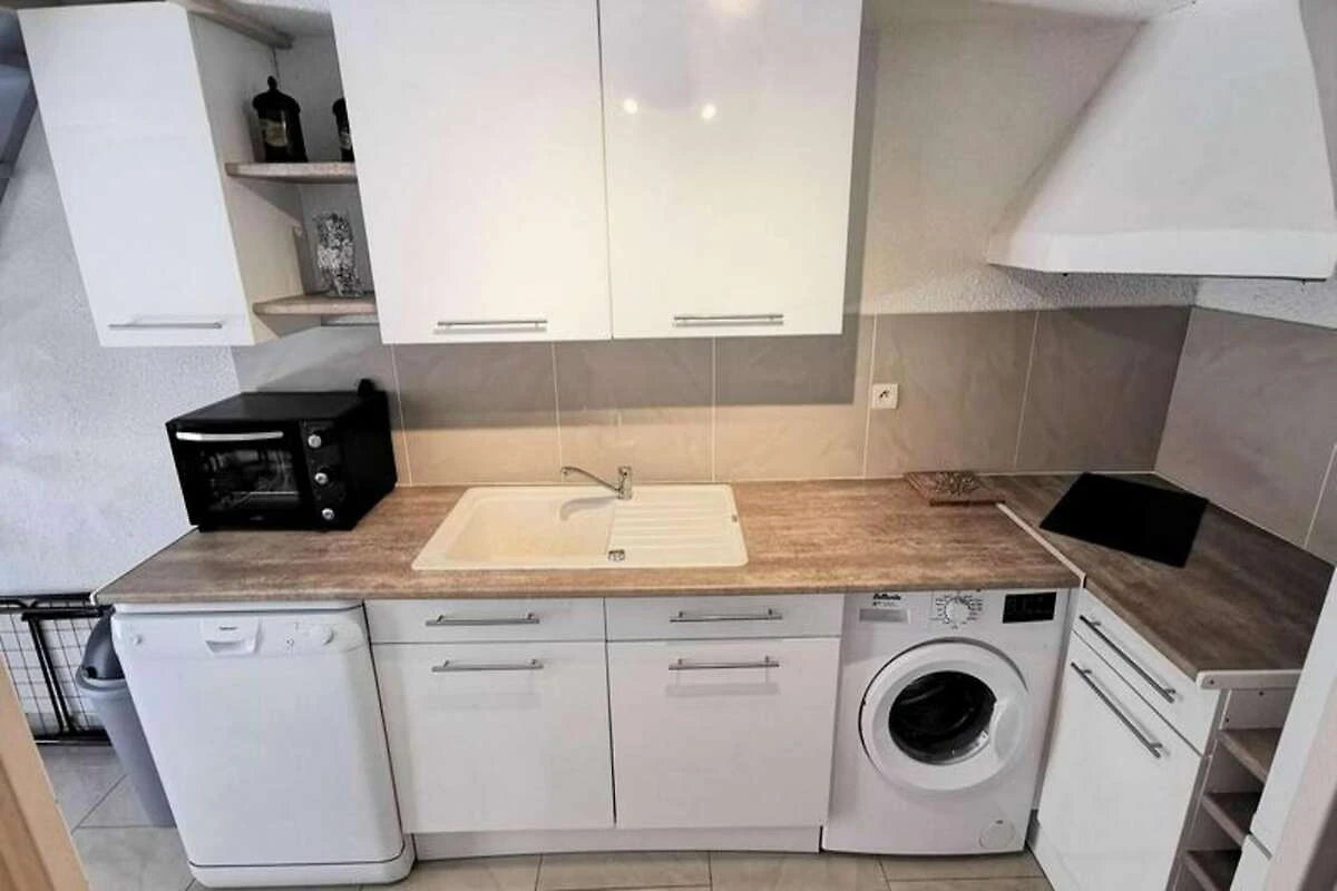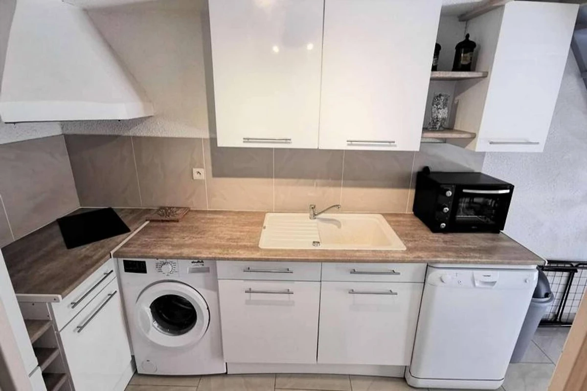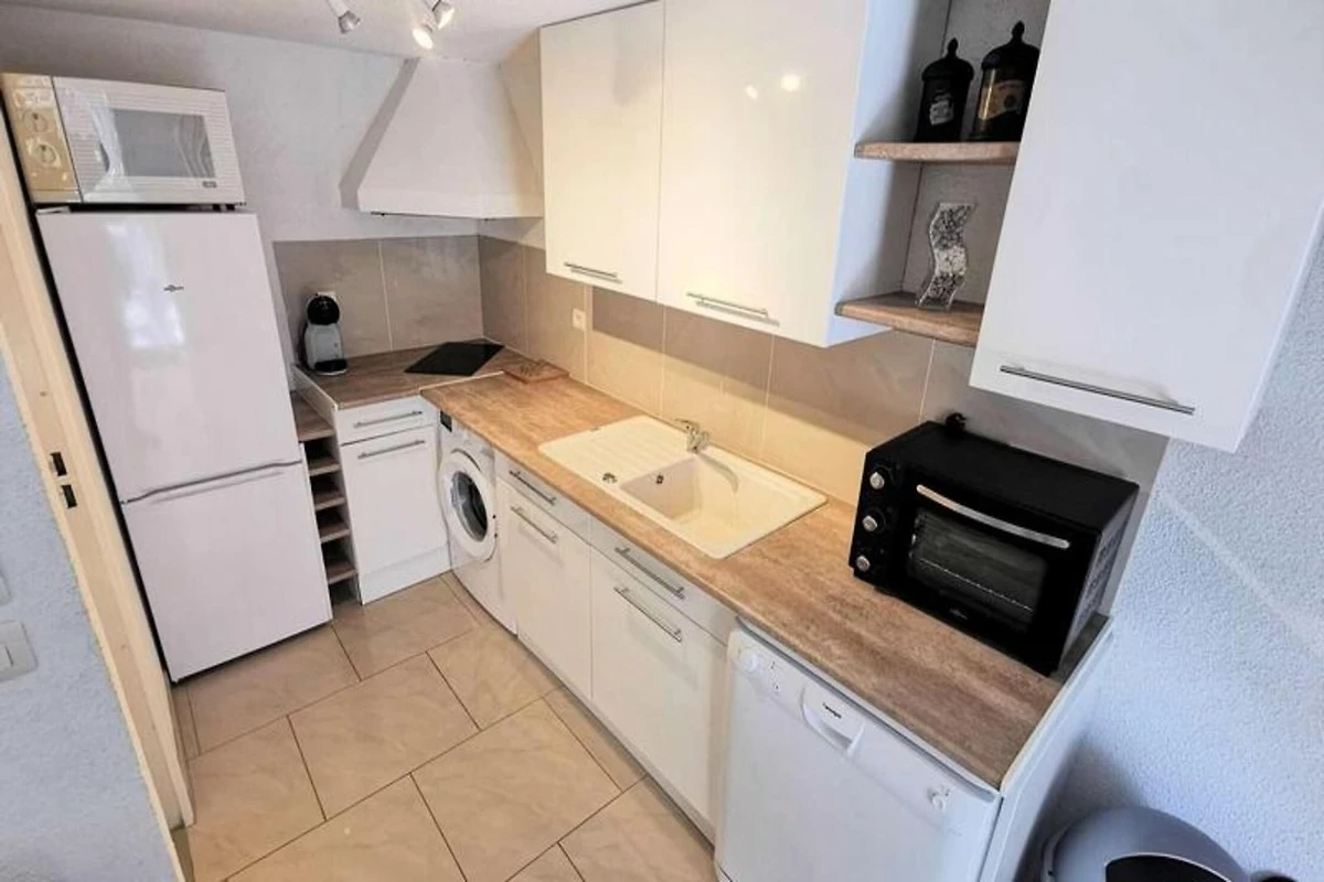 Die Unterkunft ist komplett ausgestattet und verfügt über eine Küche mit Elektroherd, Minibackofen, Mikrowelle, Geschirrspüler, Kühl-Gefrierkombination und Waschmaschine. Zu der 32 m² großen Fläche gehört auch eine 12 m² große Terrasse, die sich perfekt zum Genießen im Freien eignet. Gäste werden den zusätzlichen Komfort eines geschlossenen Gemeinschaftsparkplatzes mit Schranke zu schätzen wissen, der ihnen während ihres Aufenthalts Sicherheit bietet.