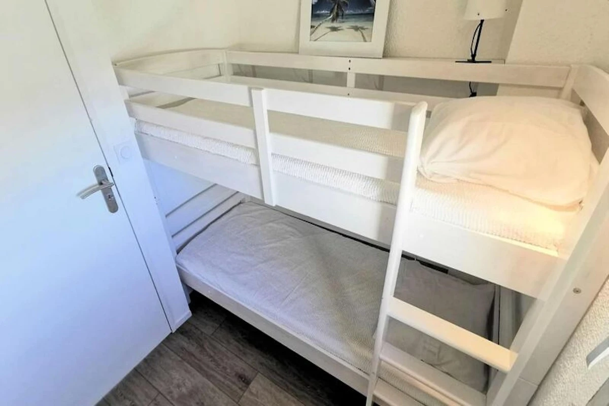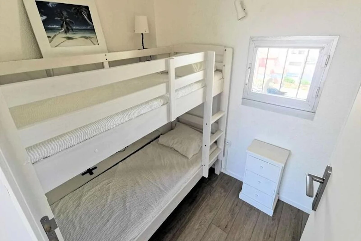 Diese Zweizimmerwohnung bietet bequem Platz für bis zu sechs Personen und verfügt über ein Wohnzimmer mit einem Schlafsofa für zwei Personen, ein Schlafzimmer mit einem Doppelbett und einen Schlafbereich mit Etagenbetten. Die Unterkunft ist nicht haustierfreundlich und gewährleistet so einen ruhigen Aufenthalt für alle Gäste. Die nach Südosten ausgerichtete Wohnung ist hell und einladend und ideal, um von zwei Terrassen aus den atemberaubenden Meerblick zu genießen. Die Wohnung befindet sich im dritten Stock und verfügt über keinen Aufzug.