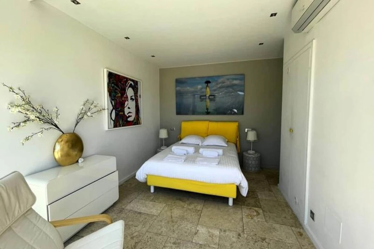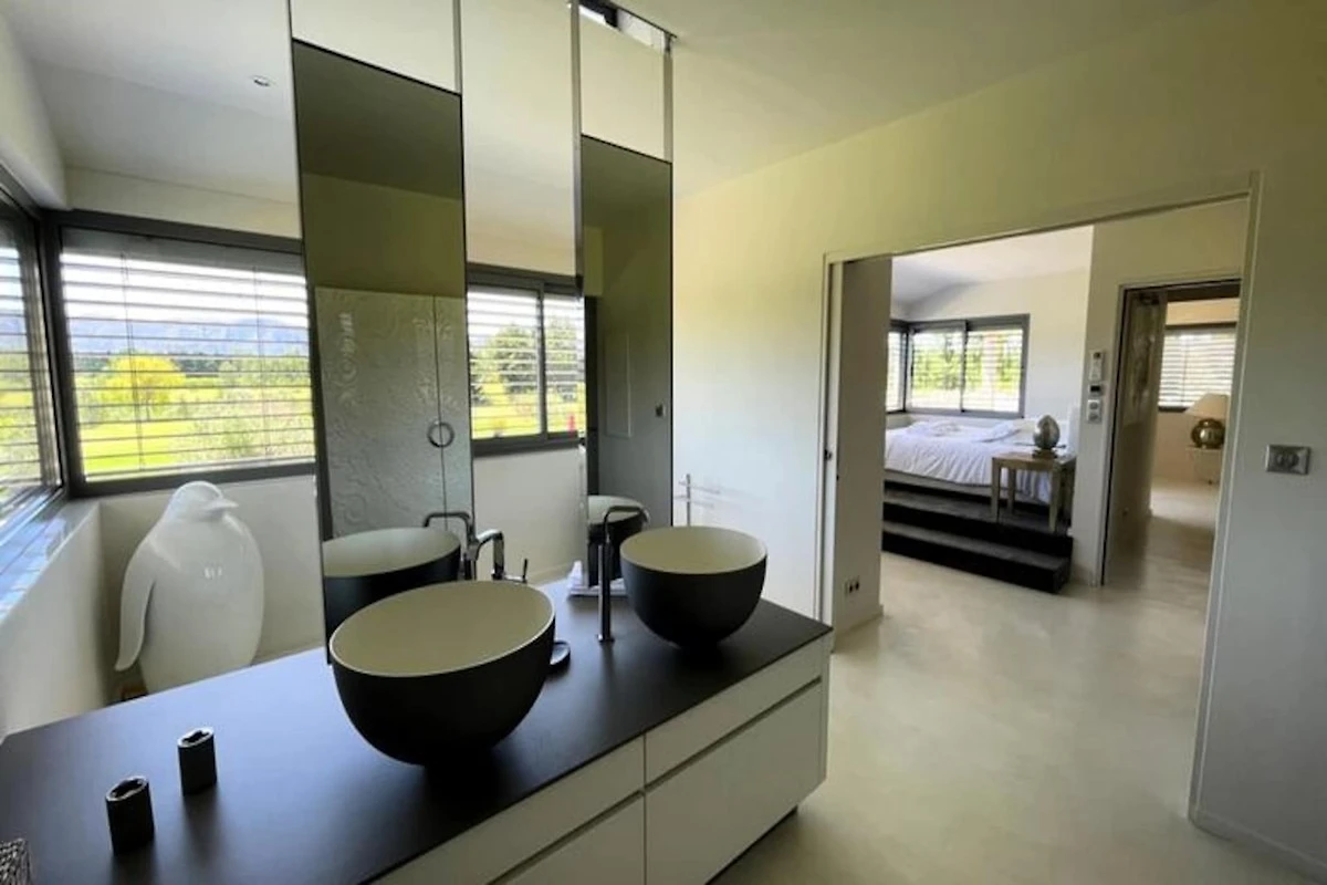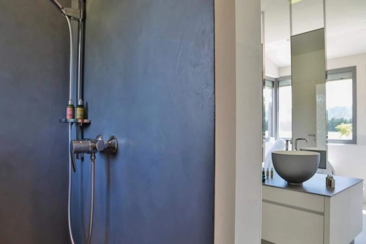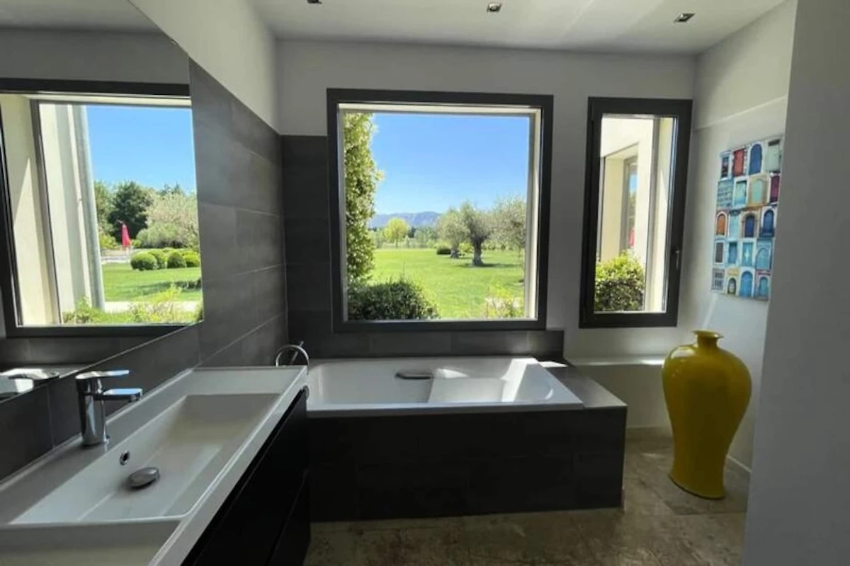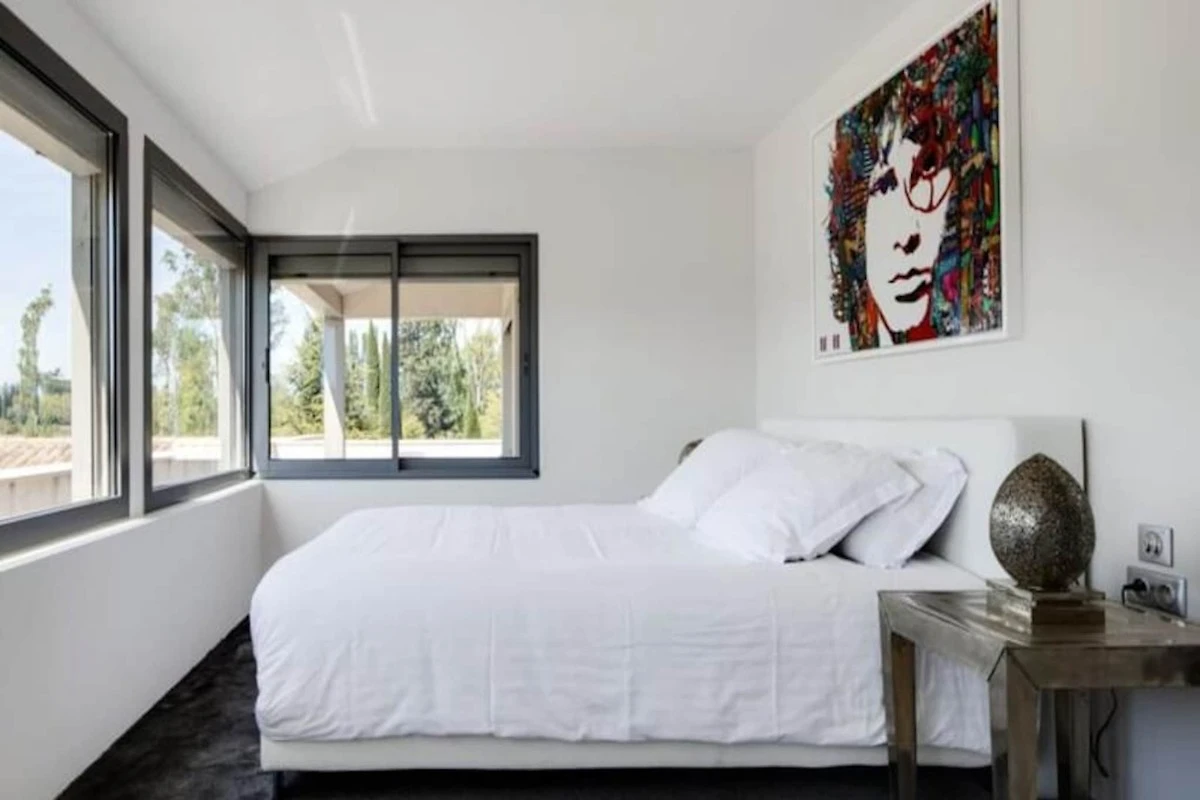 * Schlafzimmer 5: Master-Suite von 70 m², Panoramablick auf die Alpilles, 180 cm breites Bett, privates Wohnzimmer/Ankleidezimmer, eigenes Badezimmer (Dusche und WC) • Terrasse mit Panoramablick auf die Alpilles