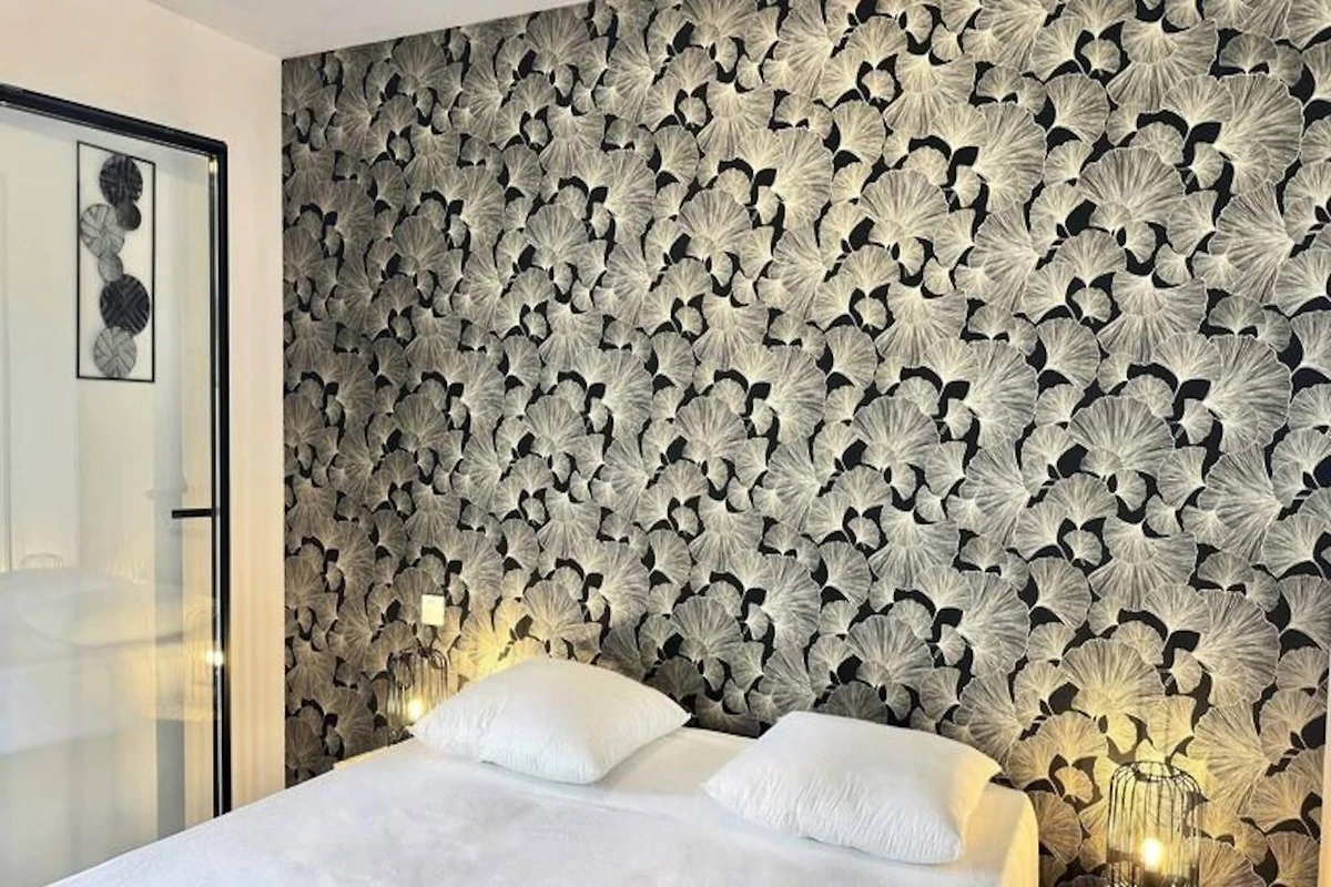 Een slaapkamer met tweepersoonsbed en toegang tot het terras,