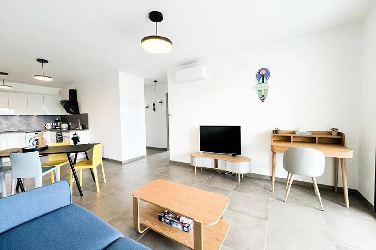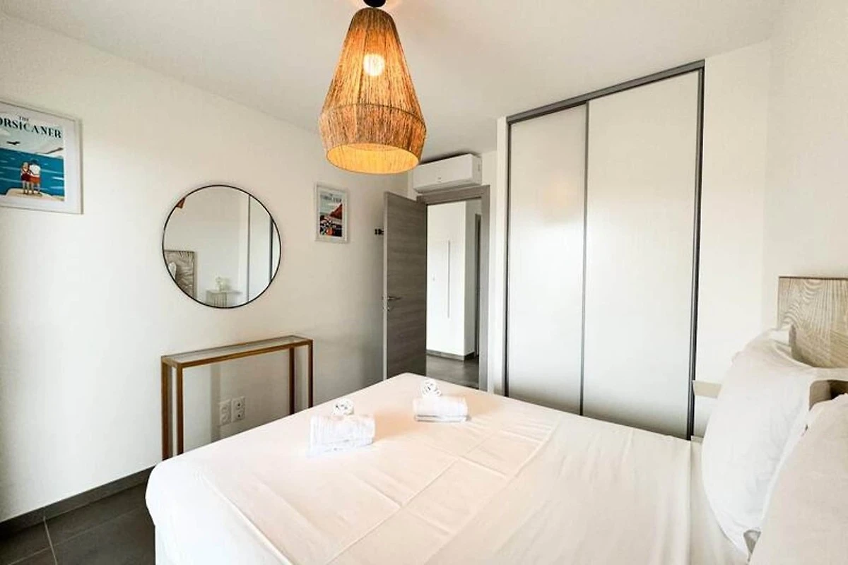 Dieses moderne Apartment im Herzen von Propriano bietet Komfort und Bequemlichkeit f�r bis zu sechs Gהste. Es verf�gt �ber ein Hauptschlafzimmer mit einem 160 cm breiten Doppelbett, ein zweites Schlafzimmer mit zwei 80 cm breiten Einzelbetten, die auf Anfrage zusammengestellt werden kצnnen, und ein Wohnzimmer mit einem hochwertigen Schlafsofa. Es ist voll klimatisiert und verf�gt au�erdem �ber ein modernes Badezimmer mit Dusche und WC. Eine gerהumige, mצblierte Terrasse mit Grill bietet einen atemberaubenden Blick auf das Meer und die Stadt. Bettwהsche wird gestellt und Privatparkplהtze stehen zur Verf�gung. Bitte beachten Sie, dass Haustiere und Partys nicht gestattet sind.