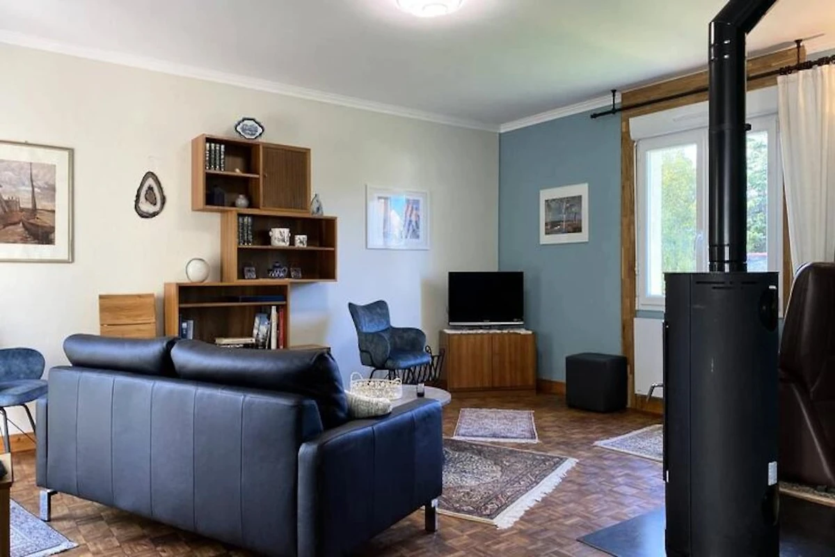Das Haus verfügt über ein Wohnzimmer mit Zugang zum Garten, eine offene Küche mit Essbereich, der ebenfalls zum Garten führt, und eine Garderobe im Erdgeschoss. Auf dieser Ebene befinden sich außerdem ein Schlafzimmer mit Doppelbett und ein Duschbad mit WC. Im Obergeschoss gibt es ein weiteres Doppelzimmer mit Ankleideraum, ein zweites Doppelzimmer, ein Einzelzimmer, ein Duschbad und ein separates WC. WLAN-Zugang und Heizung sind im Preis inbegriffen. Holz für den Holzofen ist nicht vorhanden. Die Endreinigung und der Wäscheverleih (Bettwäsche, Handtücher, Geschirrtücher und Badematten) sind als optionale Services gegen eine zusätzliche Gebühr verfügbar. Eine eigenständige Anreise ist ab 18:00 Uhr möglich. und an Agenturschlusstagen über Schlüsselboxen.