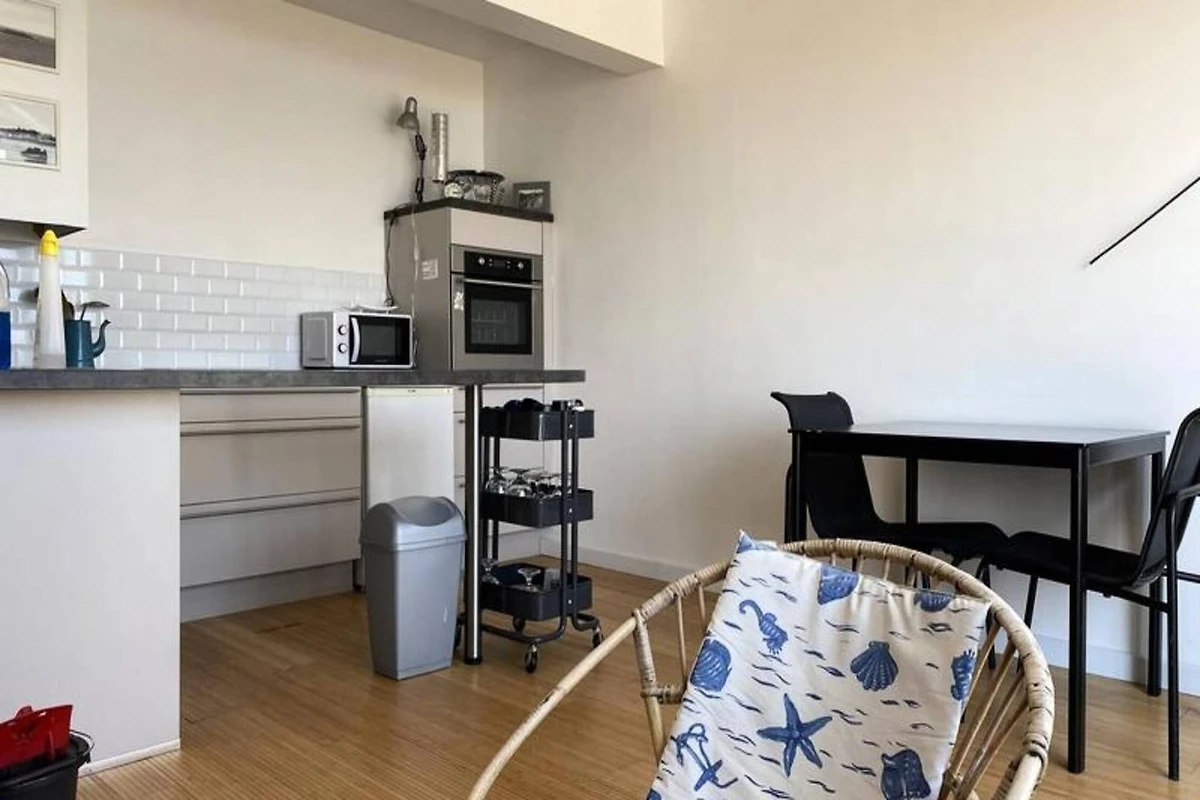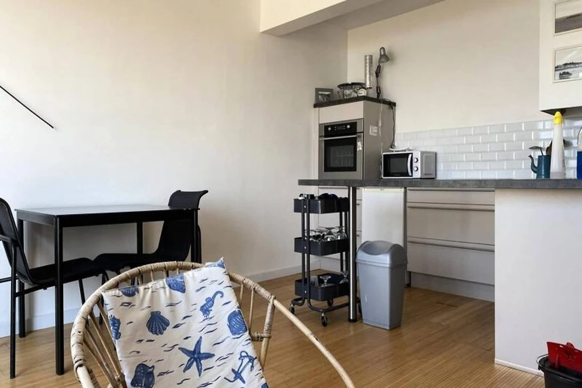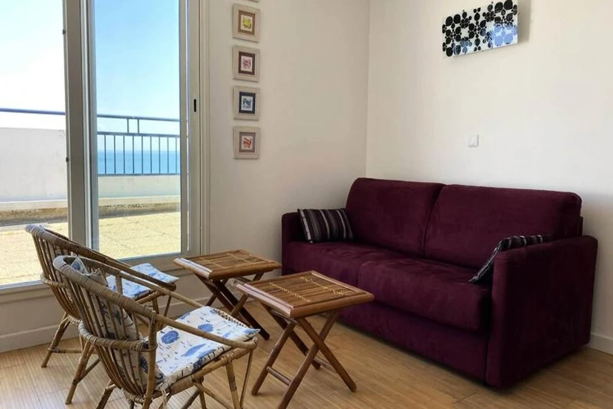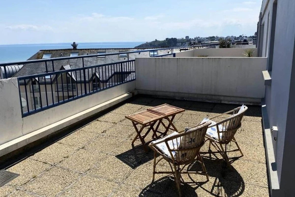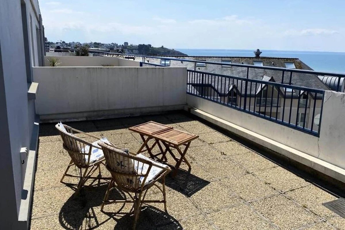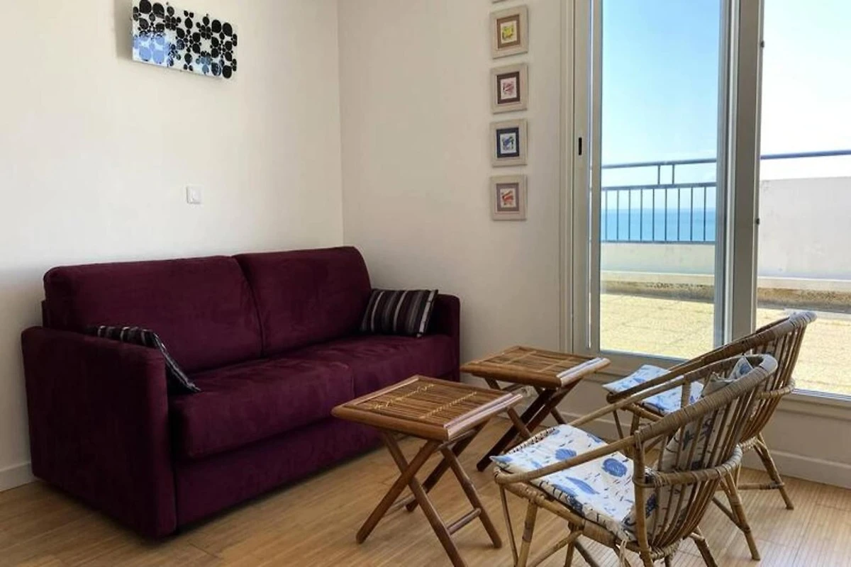 Dieses renovierte Studio-Apartment befindet sich im 4. Stock einer Residenz am Meer und bietet Gästen, die den pulsierenden Ferienort Val-André genießen möchten, einen komfortablen und bequemen Aufenthalt. Das Studio verfügt über einen Wohnbereich mit einem Schlafsofa, einem TV und Glastüren, die zu einem privaten Balkon mit vollem Meerblick führen. Die Wohnung ist haustierfreundlich, sodass Sie Ihren pelzigen Begleiter für Ihren Küstenurlaub mitbringen können. Der Wohnraum ist hell und einladend und verfügt über einen Esstisch und Stühle zum Essen oder Entspannen.