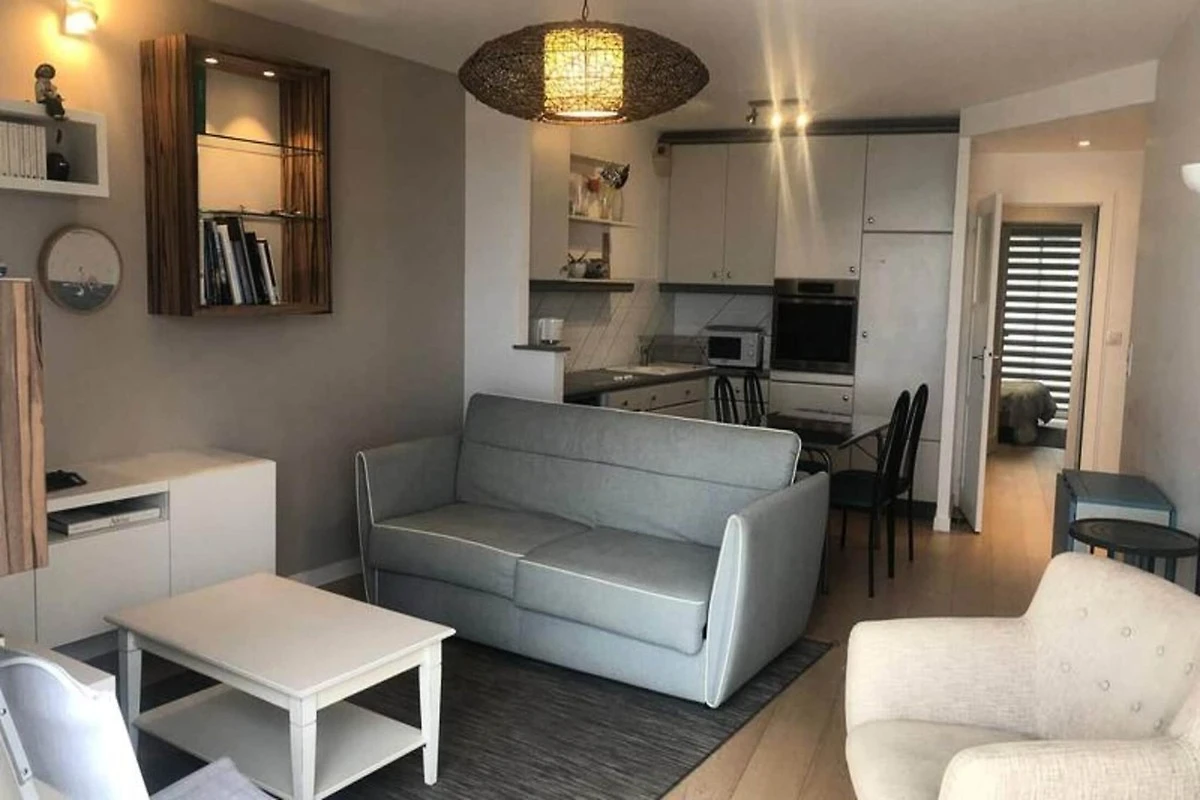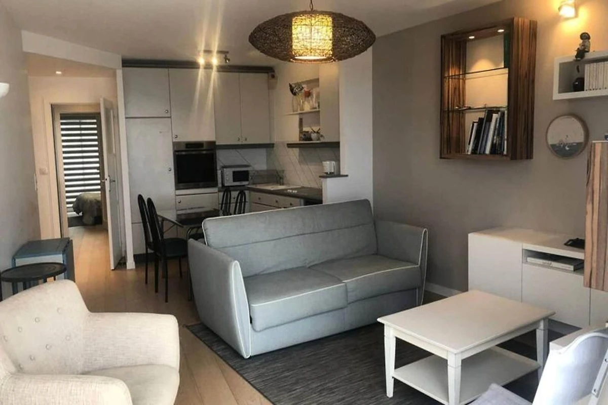 Dieses stilvolle T2-Apartment bietet einen komfortablen Aufenthalt mit atemberaubendem Meerblick. Das Apartment befindet sich im 3. Stock einer Residenz mit Aufzug und verfügt über ein Schlafzimmer mit einem Doppelbett (160 x 190 cm) und einem Kleiderschrank. Das Wohnzimmer verfügt über ein ausziehbares Sofa, Sessel und einen Esstisch für 4 bis 6 Personen, ideal zum Entspannen oder Bewirten. In der Wohnung ist das Rauchen verboten und Haustiere sind nicht gestattet, so dass eine ruhige und saubere Umgebung für die Gäste gewährleistet ist. Genießen Sie zwei Balkone, einen mit Blick auf das Meer und einen auf der Schlafzimmerseite. Für Ihren Komfort stehen überdachte Parkplätze zur Verfügung.
