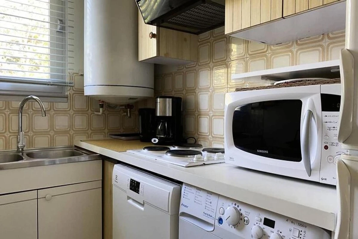 Die voll ausgestattete K�che verf�gt �ber eine Mikrowelle, einen Backofen, einen Elektroherd, einen K�hlschrank mit Gefrierfach, einen Toaster, eine Kaffeemaschine, einen Geschirrsp�ler und eine Waschmaschine f�r zusהtzlichen Komfort. Die Wohnung verf�gt au�erdem �ber ein Badezimmer mit Badewanne, ein separates WC und einen Parkplatz. Zu den optionalen Dienstleistungen gehצren Wהscheverleih, Haushaltsreinigung, Babybett und WLAN-Zugang.