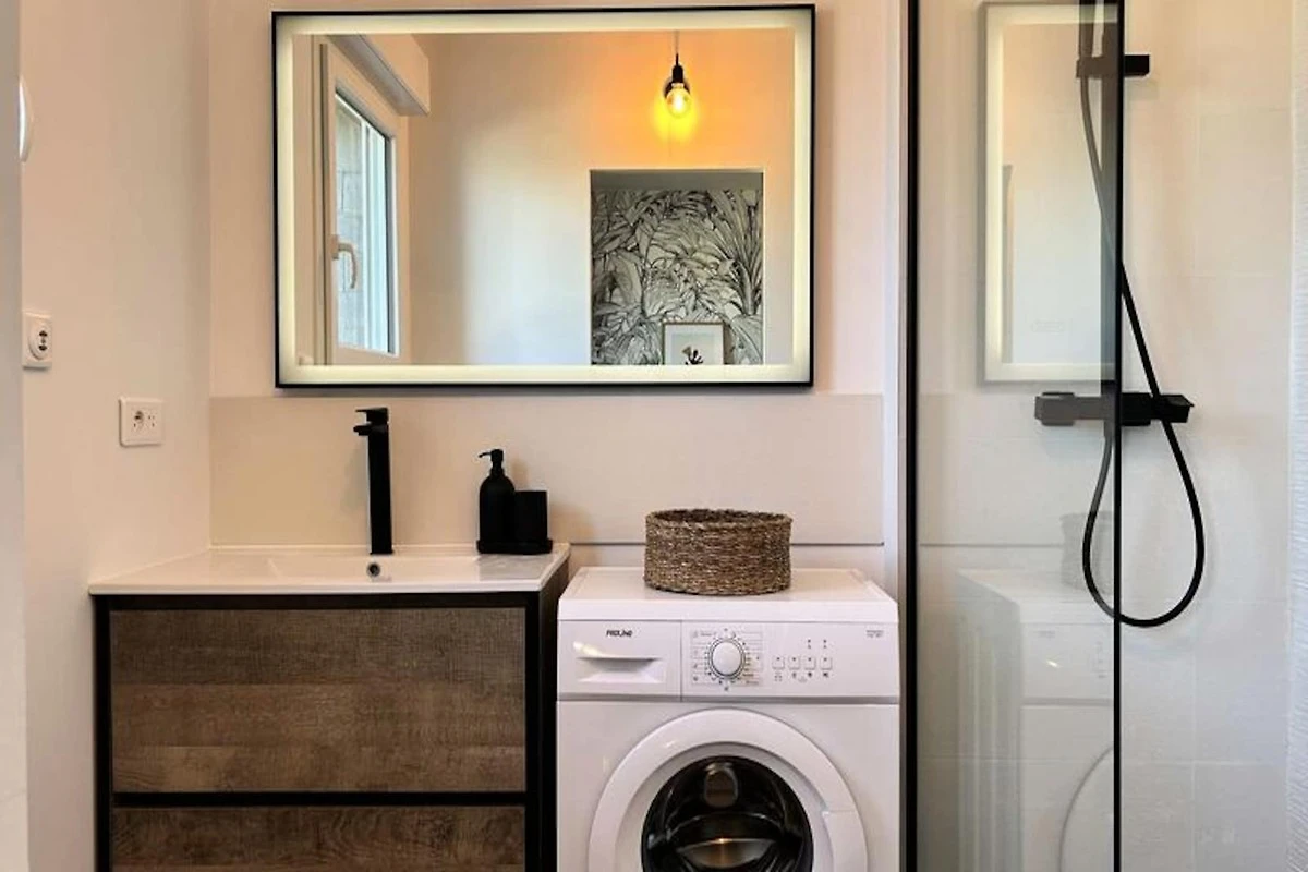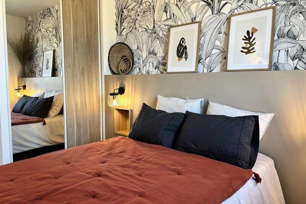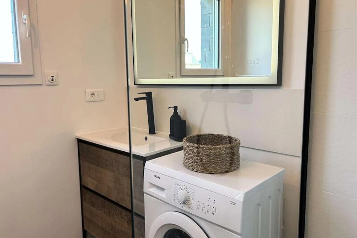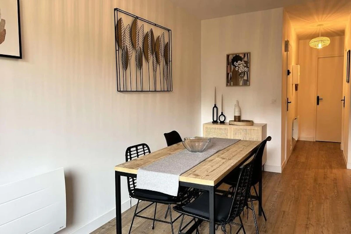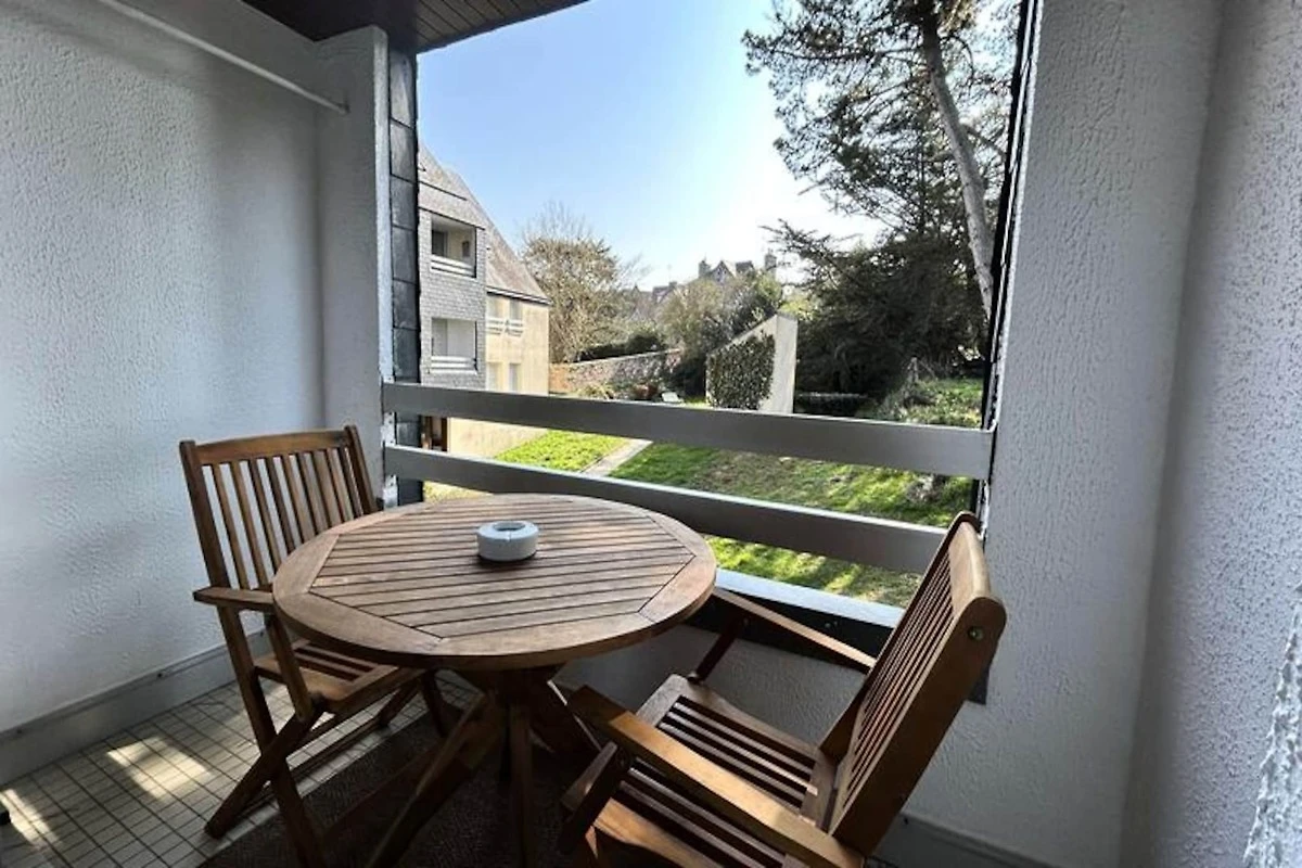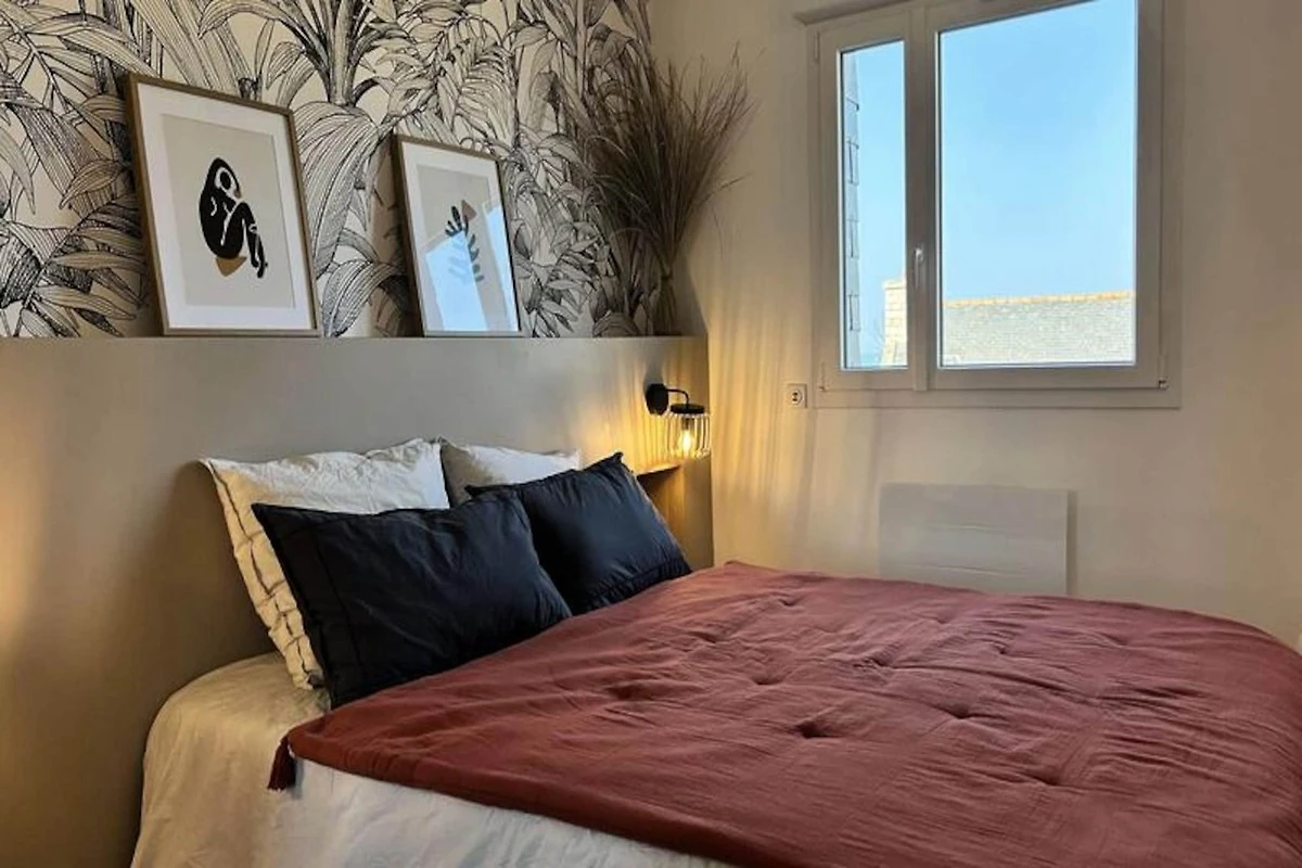 Tauchen Sie ein in den charmanten Küstenort Erquy mit diesem wunderschön renovierten Apartment. Erquy ist ein malerischer Küstenort, bekannt für seine traumhaften Strände und sein lebendiges Flair. Nur 250 Meter vom Strand und dem pulsierenden Stadtzentrum entfernt, bietet dieses gemütliche Refugium in einer privaten Residenz die perfekte Kombination aus Komfort und Ruhe. Ob Sie zu den Geschäften bummeln oder die goldenen Sandstrände von Centre und Caroual genießen möchten – alles, was Sie für einen unvergesslichen Urlaub brauchen, befindet sich direkt vor Ihrer Tür. \n\nDieses charmante Zweizimmer-Apartment im ersten Stock der Residenz empfängt Sie mit einer warmen und einladenden Atmosphäre. Das Wohnzimmer verfügt über eine komfortable Sitzecke mit Sofa, Sessel, Fernseher und Gesellschaftsspielen und öffnet sich zu einem charmanten Balkon, auf dem Sie Ihren Morgenkaffee oder ein Glas Wein am Abend genießen können. Ein Esstisch für vier Personen und eine voll ausgestattete offene Küche laden zum gemeinsamen Kochen und Genießen ein. Die Küche ist modern ausgestattet, unter anderem mit einem 3-Platten-Induktionskochfeld, Backofen, Kühl-/Gefrierkombination, Geschirrspüler und Nespresso-Kaffeemaschine – alles, was Sie für einen komfortablen Aufenthalt benötigen. \n\nDas separate Schlafzimmer mit Doppelbett bietet einen ruhigen Rückzugsort. Das Badezimmer verfügt über Dusche, Waschbecken und Waschmaschine. WLAN ist verfügbar (abhängig von der 4G-Netzabdeckung). Gäste profitieren von einem sicheren Tiefgaragenstellplatz im Gebäude. Bettwäsche, Handtücher und Geschirrtücher werden gestellt. Optional ist eine Endreinigung buchbar. \n\nDank seiner unschlagbaren Lage und der durchdachten Ausstattung ist dieses Apartment der ideale Ausgangspunkt, um die Naturschönheiten von Erquy zu entdecken, frische Meeresfrüchte in lokalen Restaurants zu genießen oder einfach am Meer zu entspannen. Schaffen Sie unvergessliche Erinnerungen in diesem charmanten Küstenparadies, wo der Rhythmus der Gezeiten die perfekte Atmosphäre für Entspannung und Abenteuer schafft.