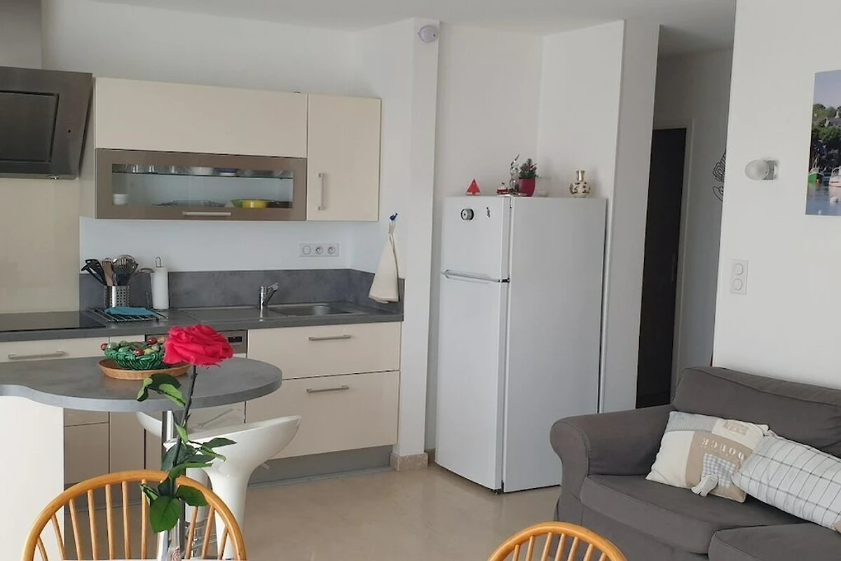 Die Innenausstattung dieser Wohnung sieht wie folgt aus: Wohnbereich: Balkon mit Blick auf die Bucht von Concarneau, Sofa, Flachbildschirm TV 102cm, 4M2 großer Balkon mit Blick auf's Meer einem Tisch und Stühlen, Essbereich mit Tisch und Stühlen, voll ausgestattete Küchenzeile mit elektrischem Ofen, Mikrowelle, Induktionskochfeld, Spülmaschine, Kühlschrank mit integriertem Tiefkühlfach, Theke mit 2 Hockern.
