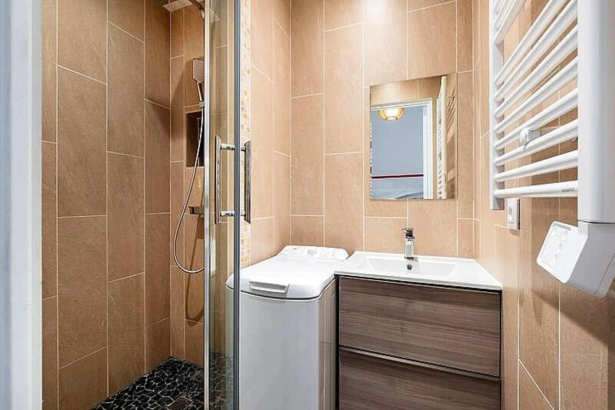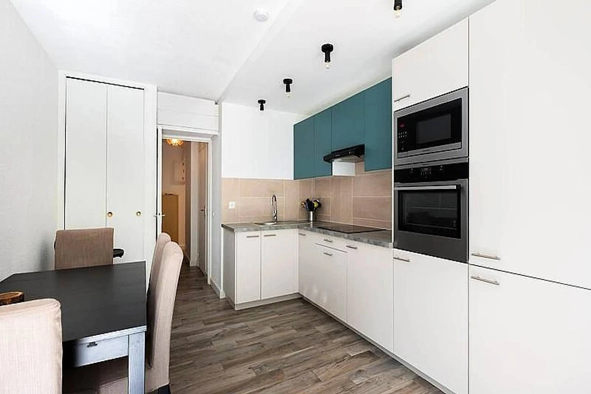 Die voll ausgestattete Küche verfügt über eine Mikrowelle, einen Kühl-/Gefrierschrank, einen Backofen und ein Cerankochfeld, sodass Sie Ihre Mahlzeiten bequem zubereiten können. Das Badezimmer ist mit einer Waschmaschine ausgestattet und für zusätzliche Privatsphäre gibt es ein separates WC. Für zusätzlichen Komfort stehen private Parkplätze zur Verfügung, die ein sicheres Parken für die Gäste gewährleisten.