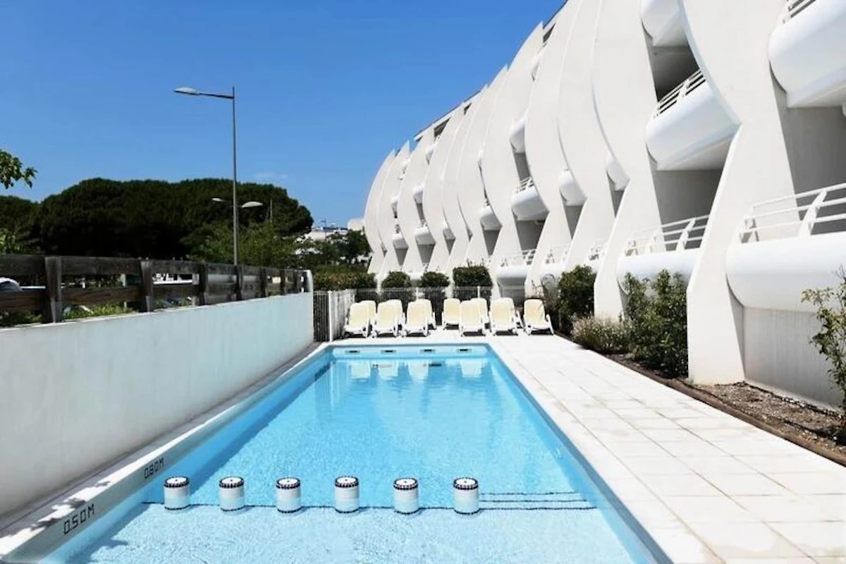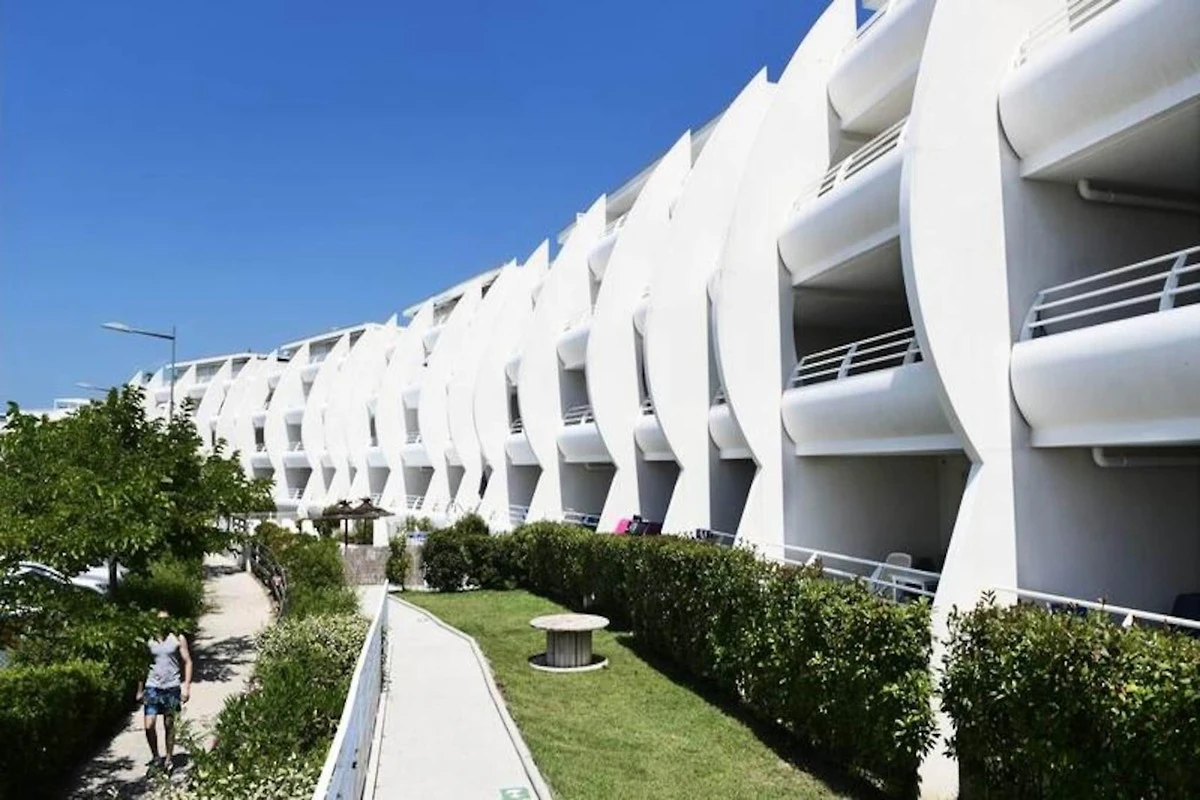 Dieses Zweizimmerapartment befindet sich in einem vierstöckigen Wohnhaus (mit Aufzügen) und bietet bequem Platz für bis zu vier Gäste. Zu den Schlafgelegenheiten gehören ein ausziehbares Schlafsofa für zwei Personen im Wohnzimmer und zwei Etagenbetten in einem Kabinenzimmer. Haustiere sind gegen eine zusätzliche Gebühr erlaubt. Die Residenz verfügt über einen beheizten Außenpool (geöffnet von Mai bis Ende September, mit Ausnahme der Schließung im gesamten April 2024).