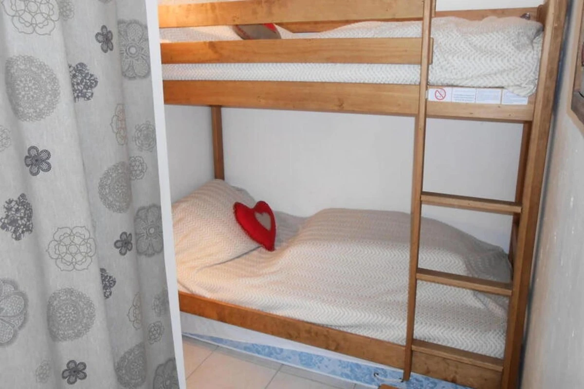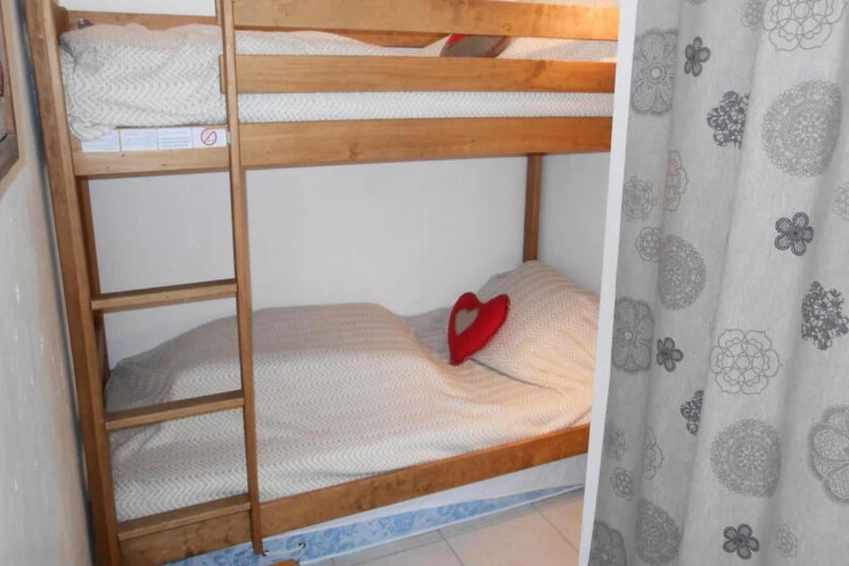 Dieses 47 m² große Apartment für 6 Personen befindet sich im 5. Stock, ist mit dem Aufzug erreichbar und verfügt über einen Südbalkon mit herrlichem Berg- und Pistenblick. Die Wohnung verfügt über ein Wohnzimmer mit TV, Sofa und Essbereich, sowie ein Schlafzimmer mit einem Doppelbett (140x190), einem ausziehbaren Sofa (2 Einzelbetten: 80x190) und einem separaten Schlafbereich mit zwei Einzelbetten Etagenbetten (90x190). Das obere Etagenbett wird für Kinder unter 6 Jahren nicht empfohlen. Das Anwesen ist nicht haustierfreundlich und verfügt über einen Skiraum, eine Waschmaschine, elektrische Rollläden und einen privaten Parkplatz für ein Standardauto (Nr. 36).