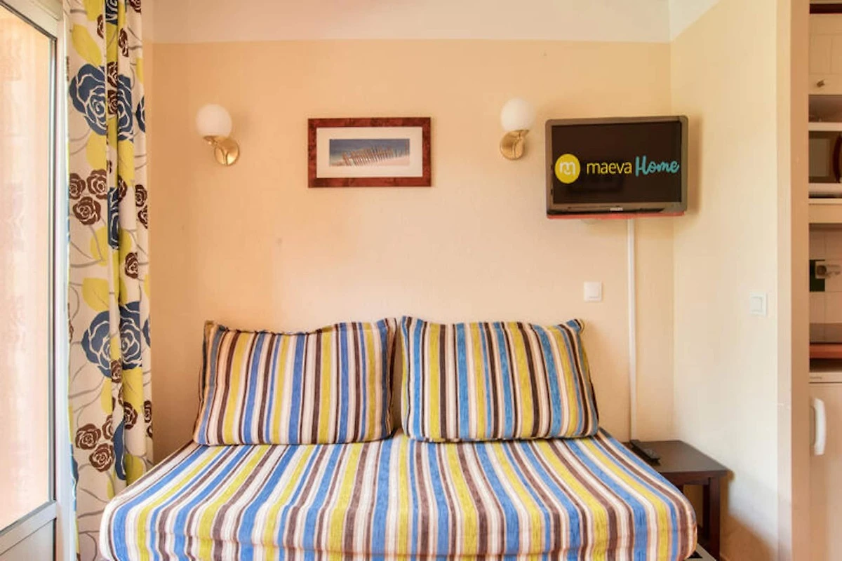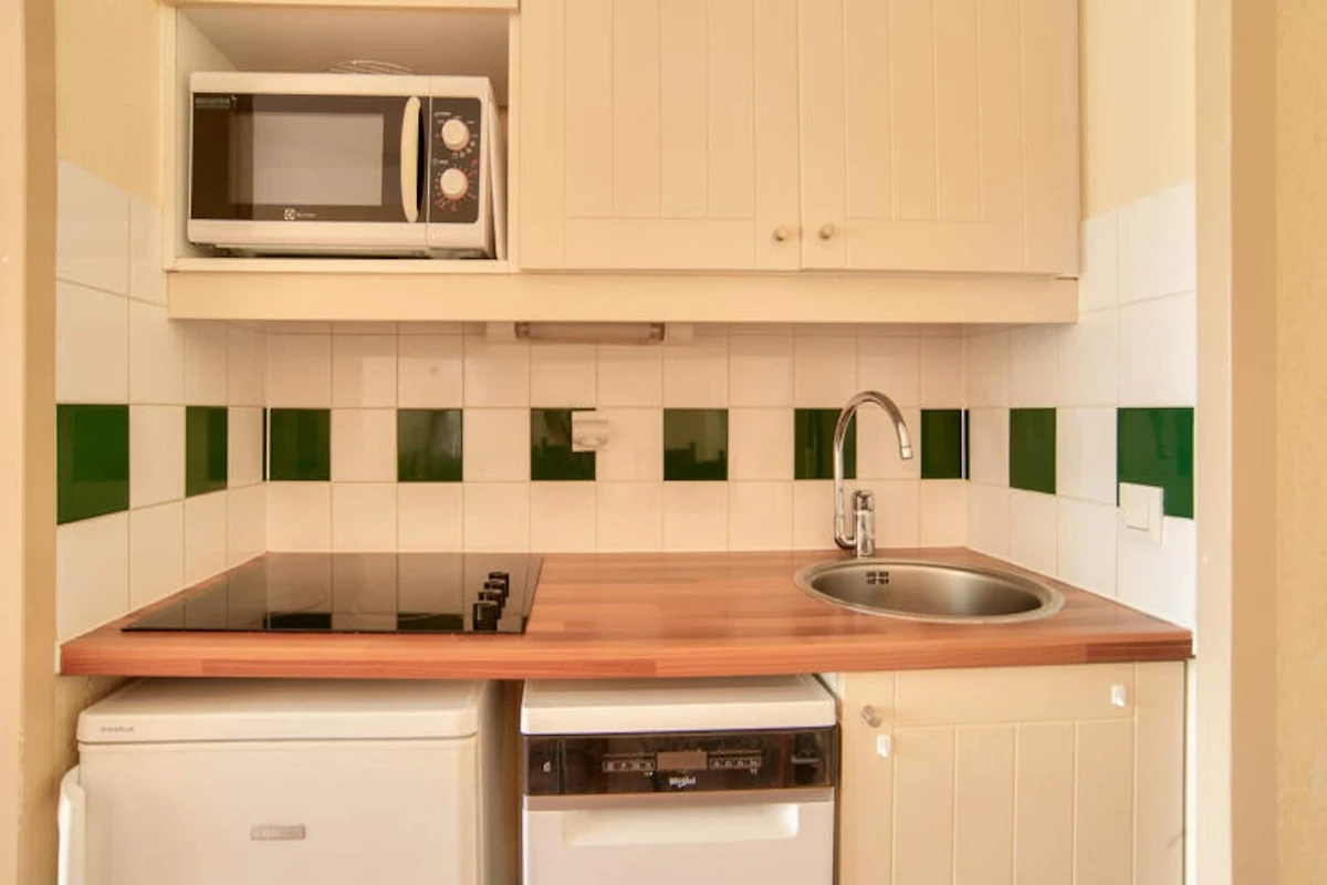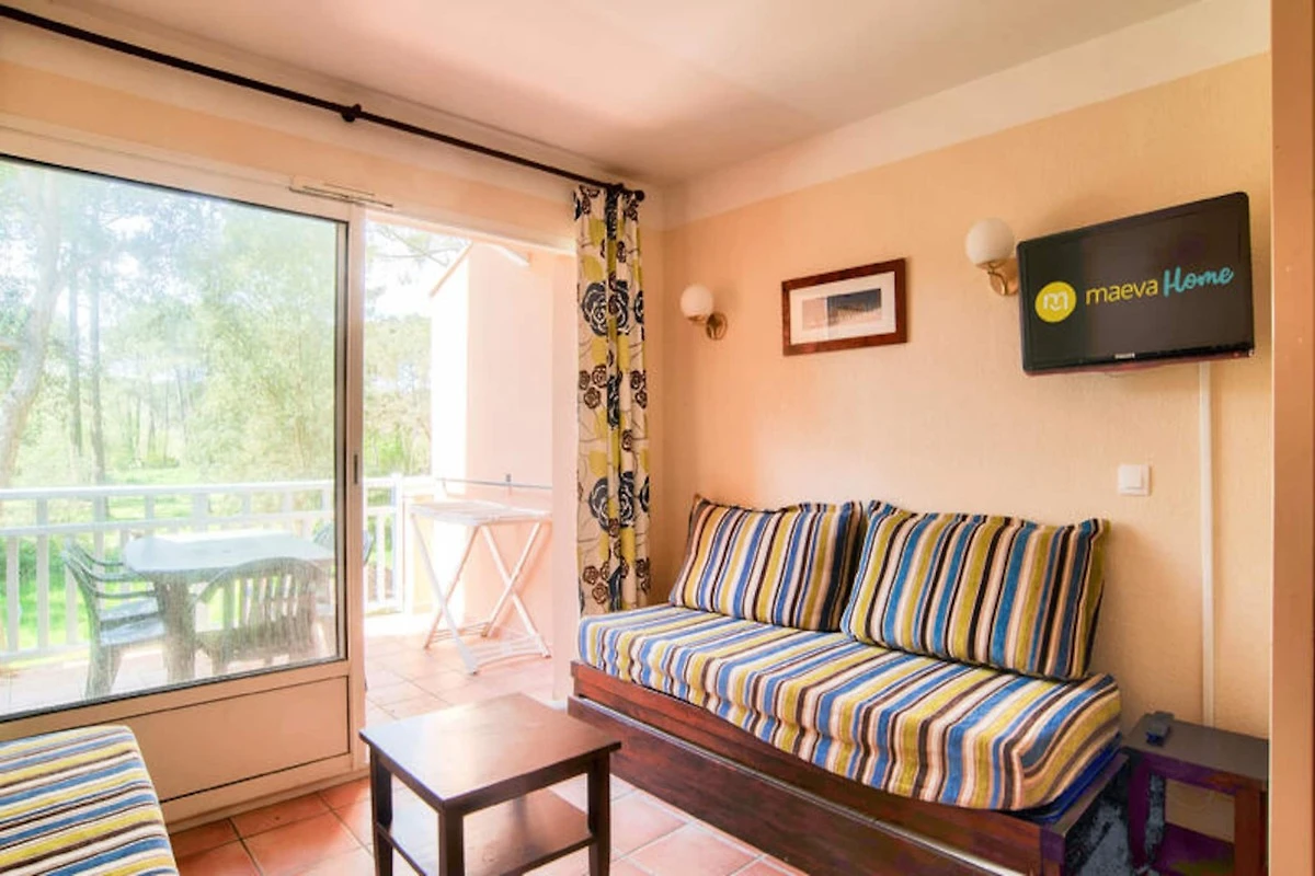 Im Inneren des Apartments befindet sich eine halboffene amerikanische Küche, die mit allem ausgestattet ist, was Sie zum Zubereiten von Mahlzeiten benötigen. Das Wohnzimmer ist hell und gemütlich, mit einem Esstisch und bequemen Sitzgelegenheiten für die Gäste. Ein nach Süden ausgerichteter Balkon bietet Aussicht auf den nahegelegenen Wald und schafft eine ruhige Atmosphäre zum Entspannen. Das Anwesen verfügt außerdem über Zugang zu einem beheizten Außenpool, der sich perfekt zum Entspannen nach einem Tag voller Aktivitäten eignet.