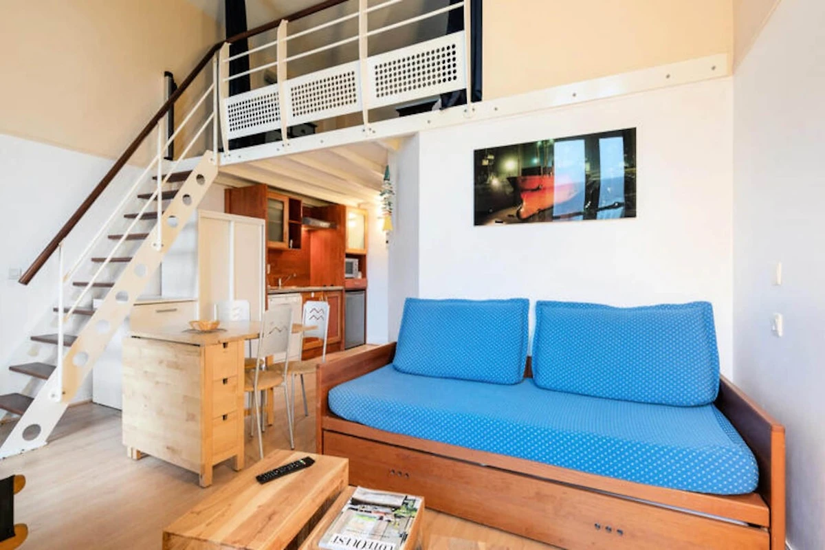 Accommodatie: 1 woonkamer, 1 keuken, 1 mezzanine, 1 badkamer, 1 toilet en parkeerplaats.