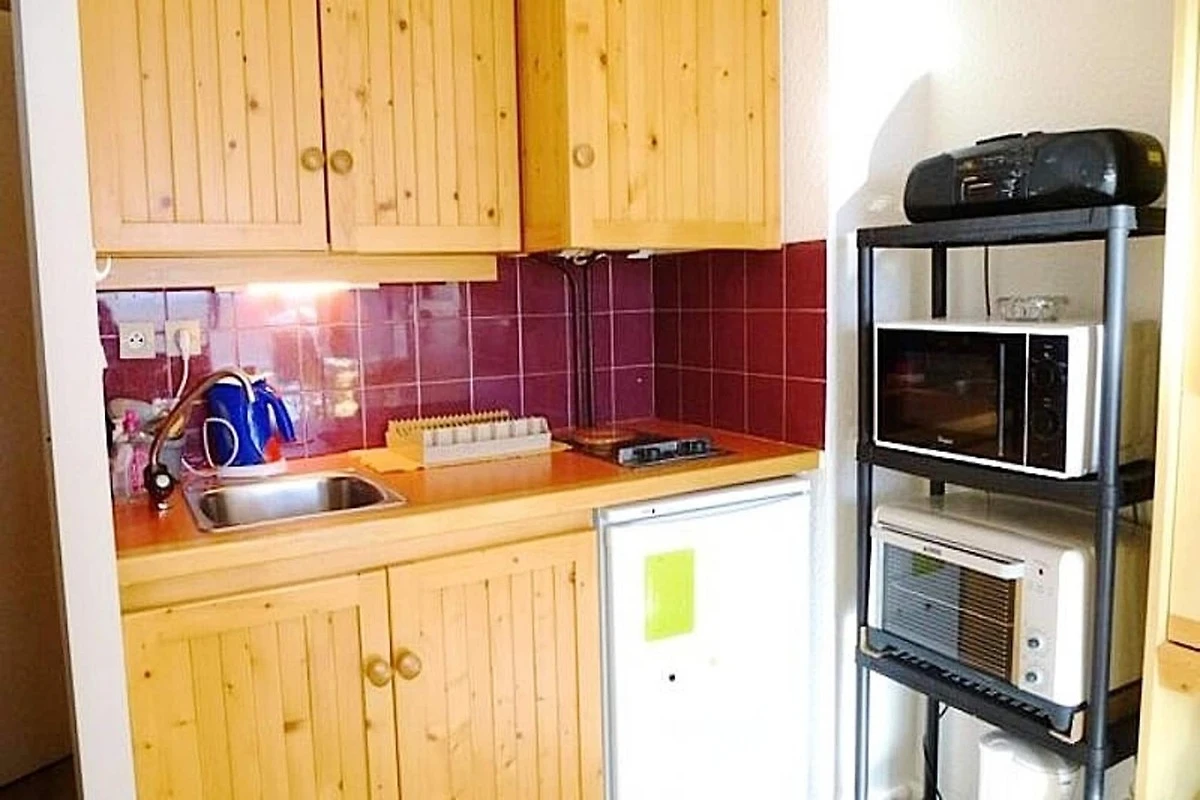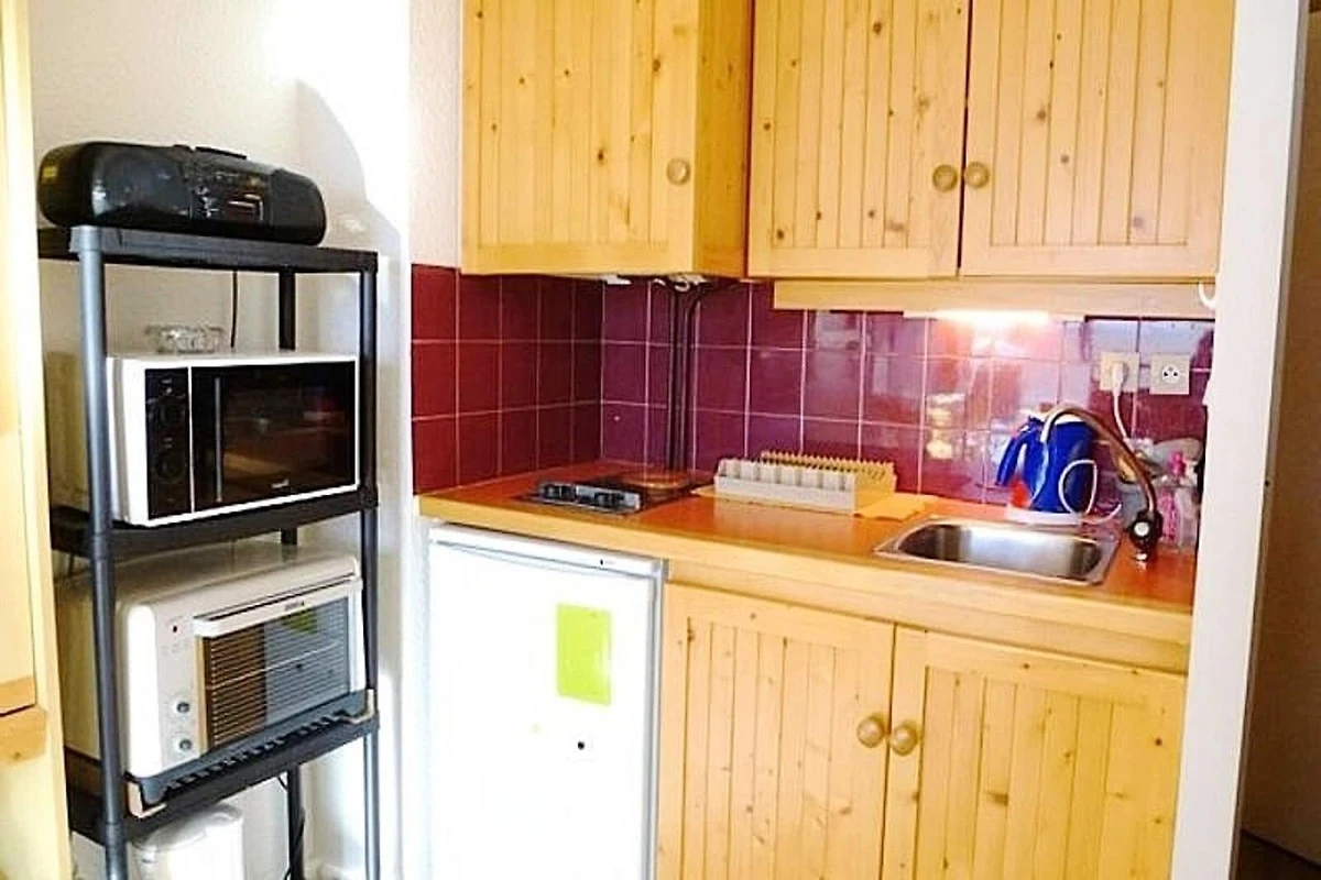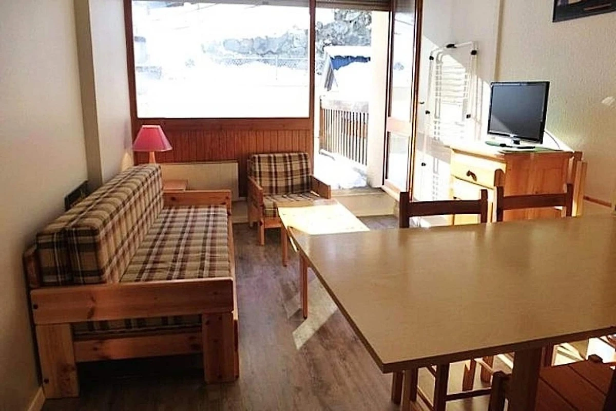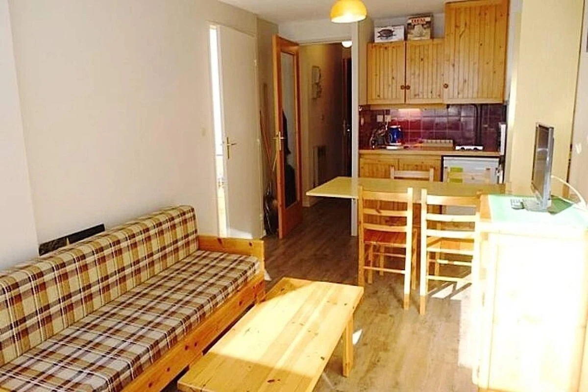 Dieses Apartment befindet sich in der Residenz **LE LIENZ** und ist eine charmante Einheit im 2. Stock mit Terrasse und Südausrichtung, die eine tolle Aussicht und natürliches Licht bietet. Es bietet Platz für bis zu 4 Personen und verfügt über eine Kabine mit Etagenbetten, ein kleines separates Schlafzimmer mit einem Doppelbett (140 cm) und ein Wohnzimmer mit Kochnische. Das Badezimmer ist mit einer Badewanne und einem WC ausgestattet. Ein Skiraum sorgt für Komfort und die SKIBUS-Haltestelle ist nur 20 Meter entfernt, so dass Sie bequem zu den Pisten gelangen.