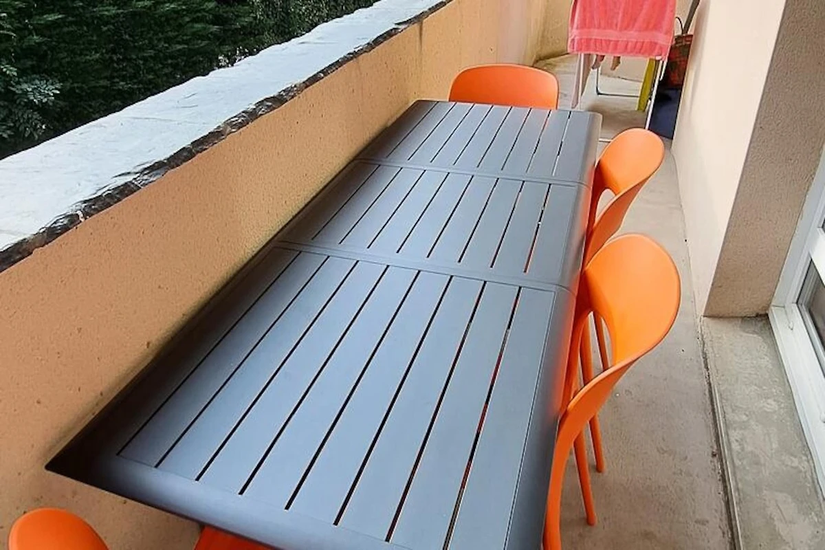 Terrassenausstattung: ein Tisch mit 5 Stühlen.