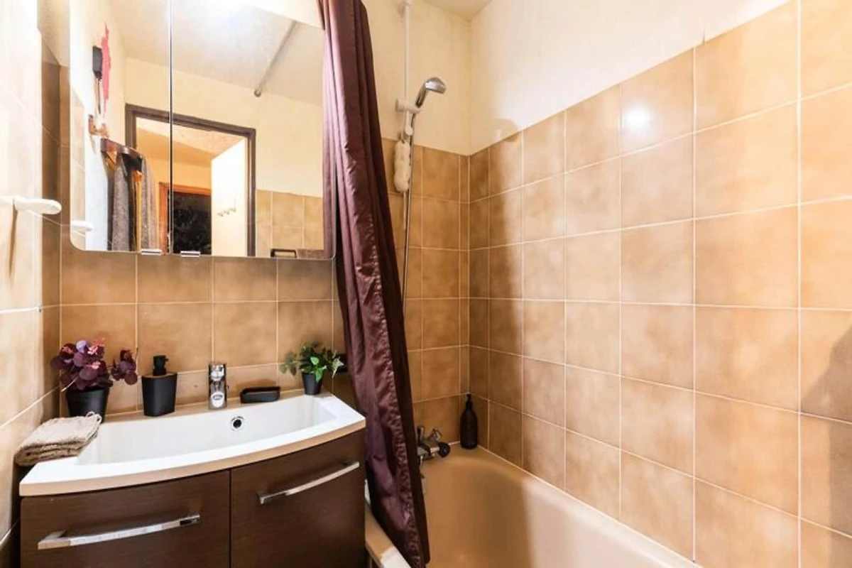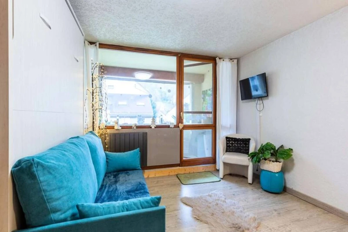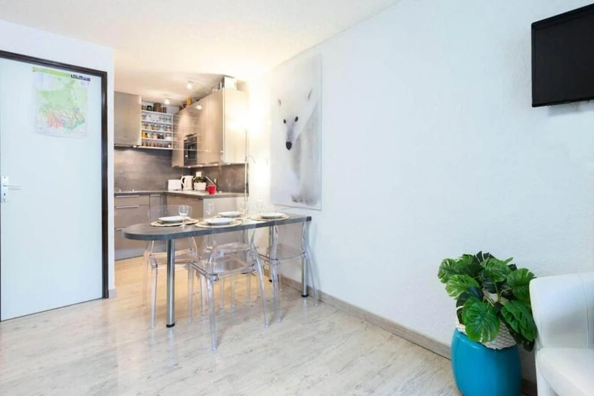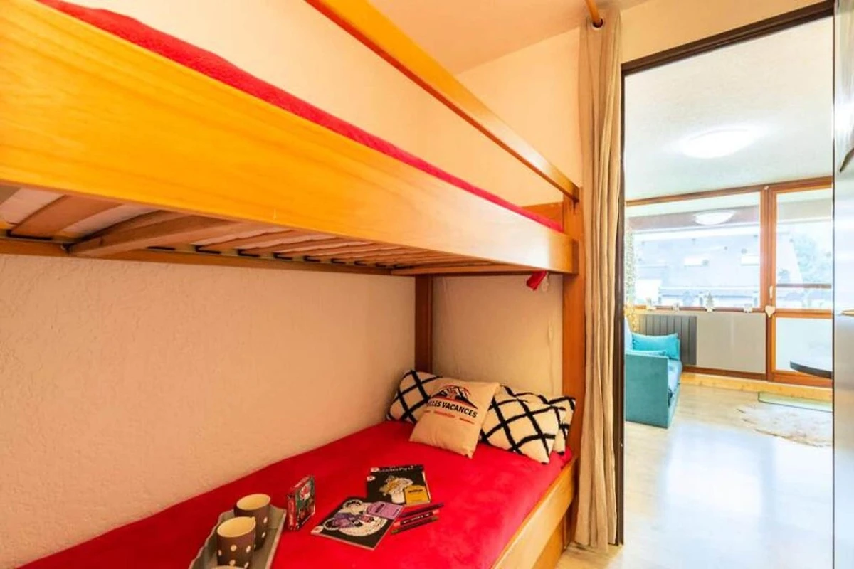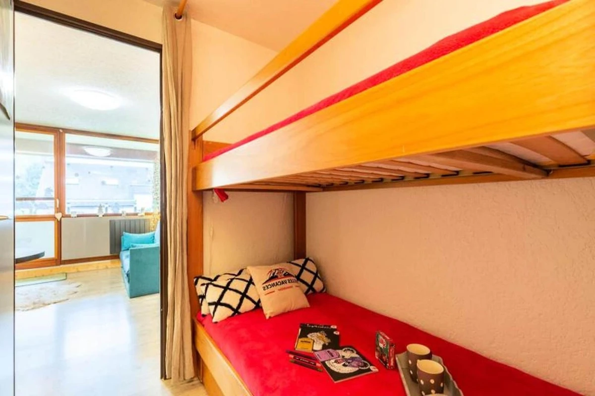 Dieses charmante Studio-Apartment ist für 4 Personen ausgelegt und verfügt über einen gut organisierten Schlafbereich, darunter zwei 90-cm-Etagenbetten im Flur und ein Doppelbett mit Kleiderschrank im Wohnbereich. Die Wohnung befindet sich im 2. Stock und ist für Ihren Komfort mit einer Garage ausgestattet. In der Unterkunft sind keine Haustiere gestattet. Darüber hinaus stehen den Gästen ein Skiraum und ein eigenes Badezimmer mit separater Toilette zur Verfügung.