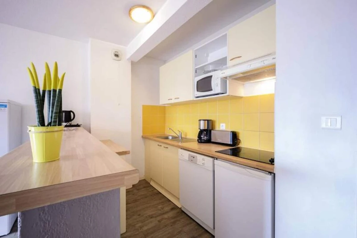 ingerichte keuken open naar de woonkamer (2 slaapplaatsen op de slaapbank)