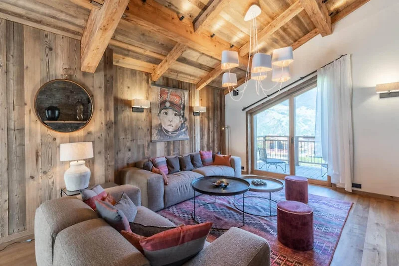 Das Chalet verfügt über ein geräumiges Wohnzimmer mit Kamin, eine voll ausgestattete Küche mit Bar und ein gemütliches Lesezimmer. Auf der unteren Ebene befindet sich ein Entspannungsbereich mit Schwimm-Spa, Sauna und Kräuterteestube, der nach einem Skitag für ultimativen Komfort sorgt. Darüber hinaus gibt es einen Balkon und eine Terrasse, um den Panoramablick auf die Umgebung zu genießen.