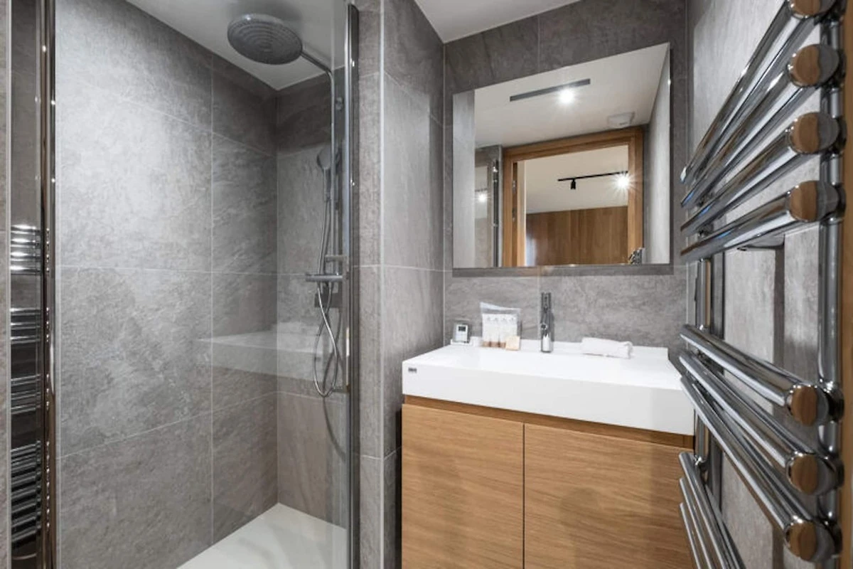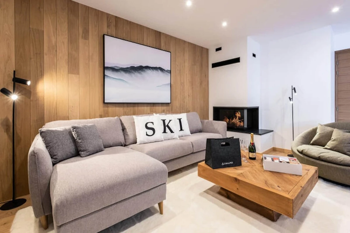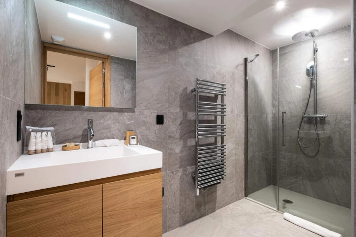 Das Apartment verfügt über eine offene Küche mit modernen Geräten, darunter Kühlschrank, Backofen, Mikrowelle und Nespresso-Maschine. Der großzügige Wohnbereich umfasst ein Esszimmer und eine TV-Lounge. Zu den weiteren Einrichtungen gehören eine Waschmaschine, ein Skiraum mit Schuhtrockner und Parkplätze im Freien. Die Badezimmer sind mit beheizten Handtuchhaltern ausgestattet und die Unterkunft bietet einen regelmäßigen Reinigungsservice und einen mit Holz gefüllten Kamin.