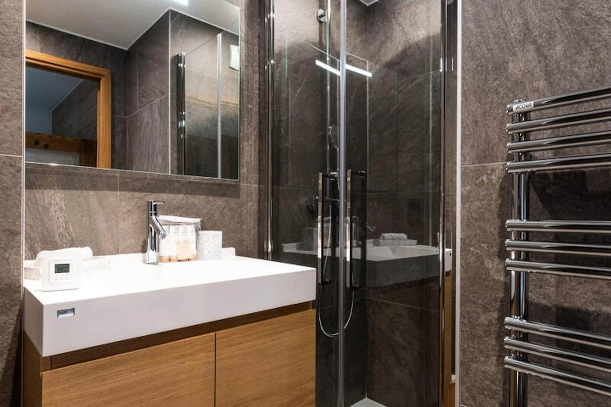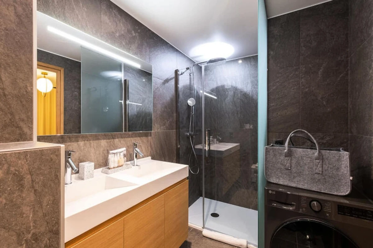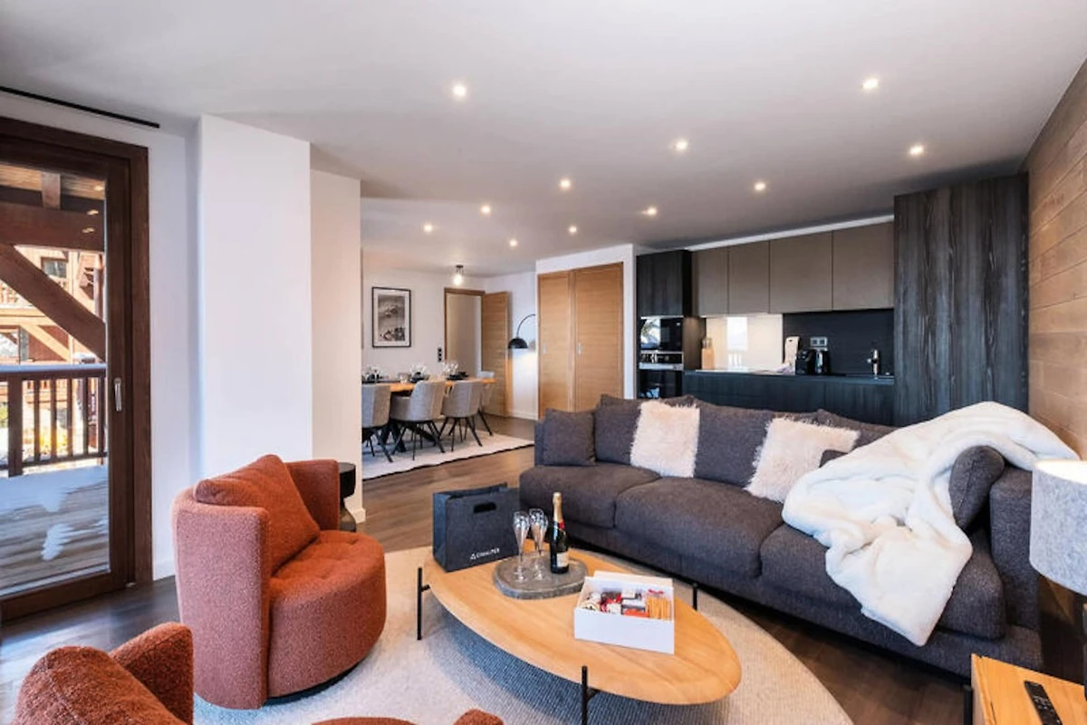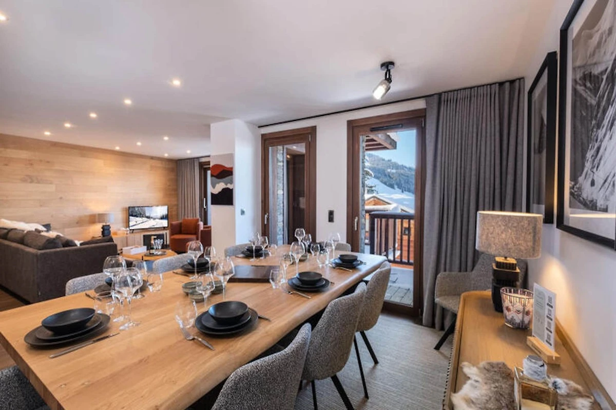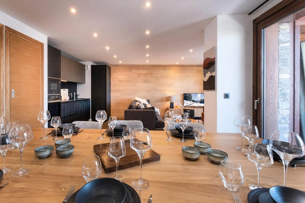 Das Apartment verfügt über eine offene, voll ausgestattete Küche mit Kühlschrank, Gefrierschrank, Backofen, Induktionskochfeld, Geschirrspüler und Mikrowelle. Für zusätzlichen Komfort sorgen ein Waschtrockner und ein Skiraum zur Aufbewahrung der Ausrüstung. Ein separates WC erhöht die Funktionalität des Raums und macht ihn ideal für Familien oder Gruppen.