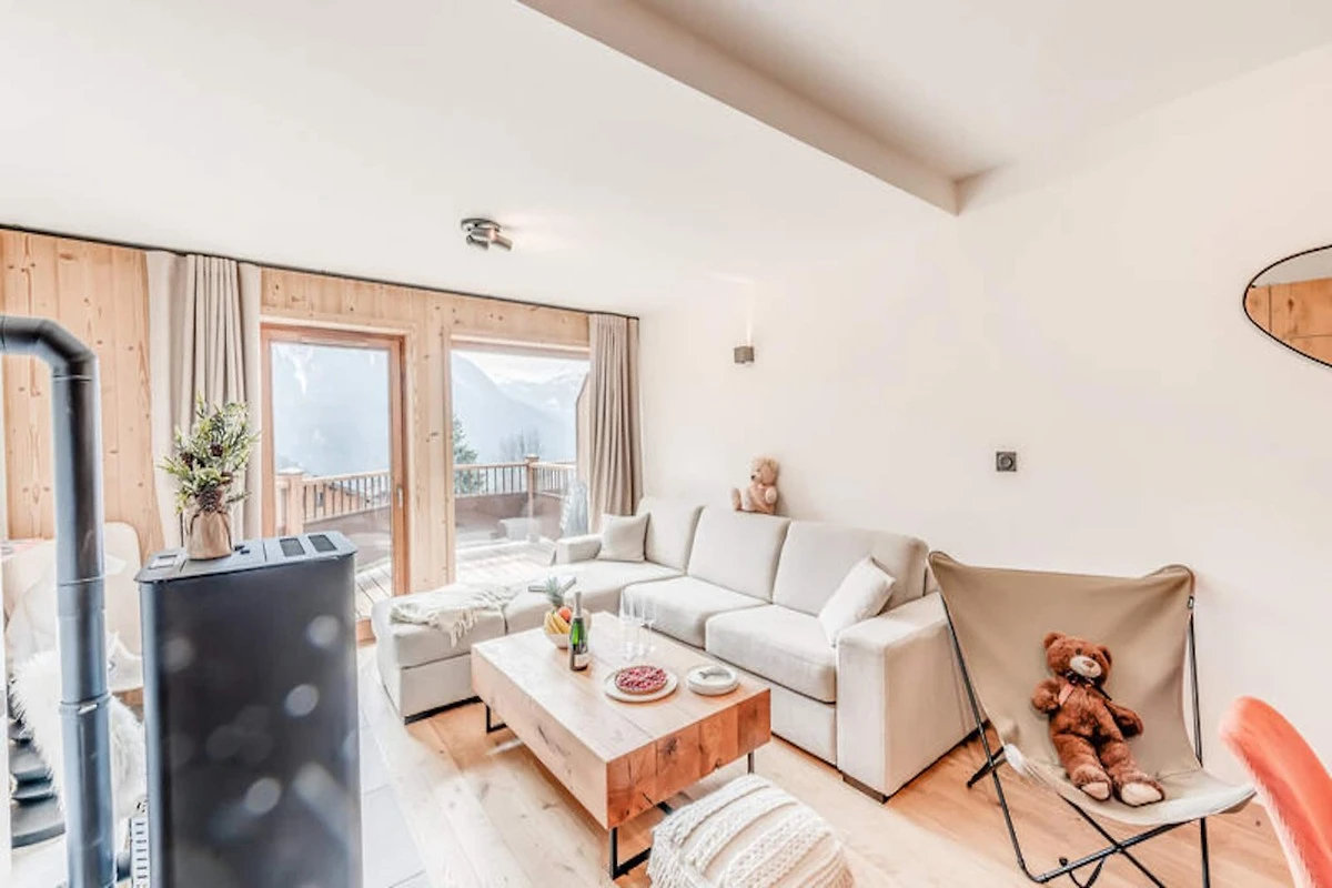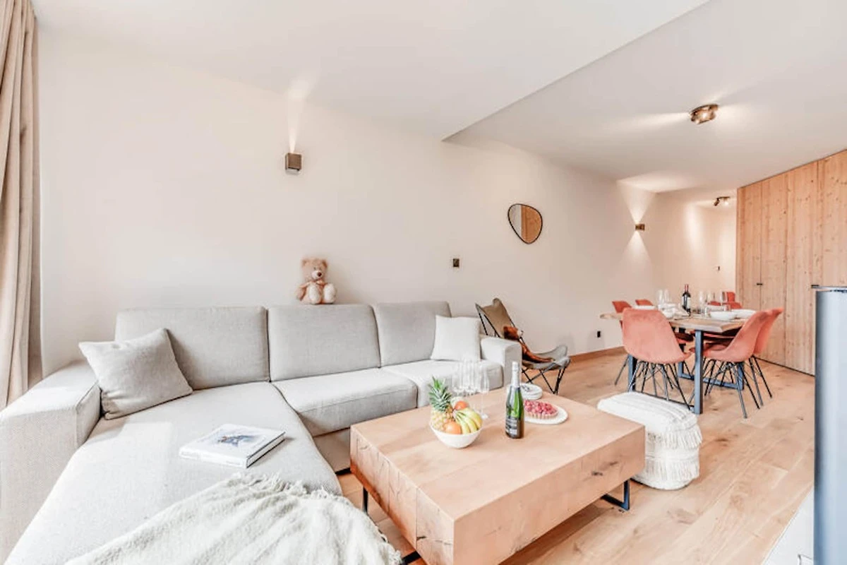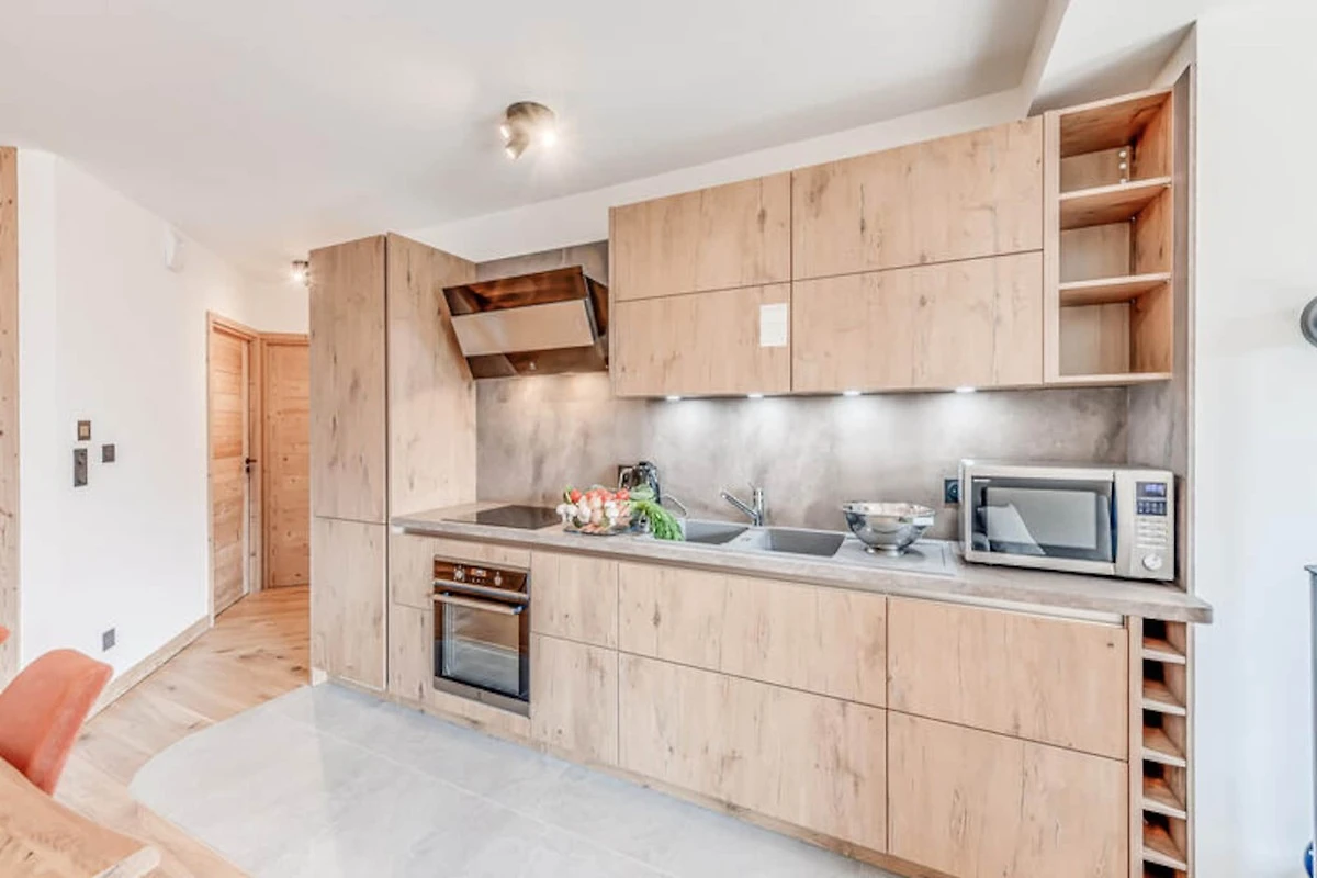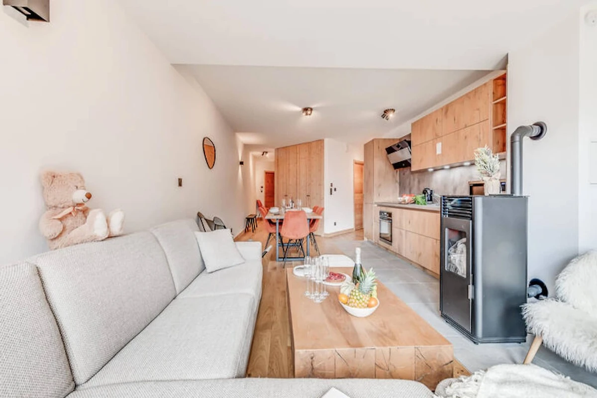 Dieses moderne 4-Sterne-Apartment ist Teil einer neuen Residenz und bietet bequem Platz f�r bis zu 6 Personen. Es umfasst ein gerהumiges Wohnzimmer mit einem Pelletofen (Pellets nicht vorhanden), einen Essbereich und eine voll ausgestattete K�che. Die Wohnung verf�gt �ber zwei gem�tliche Schlafzimmer, eines mit einem Doppelbett und das andere mit zwei Einzelbetten, die beide direkten Zugang zu privaten Balkonen bieten. Ein Doppelschlafsofa im Wohnbereich bietet zusהtzlichen Schlafplatz. Die Wohnung ist eine Nichtraucherwohnung und Haustiere sind nicht gestattet. Ein separates Badezimmer mit Waschmaschine/Trockner und eine separate Toilette sorgen ebenfalls f�r Komfort.
