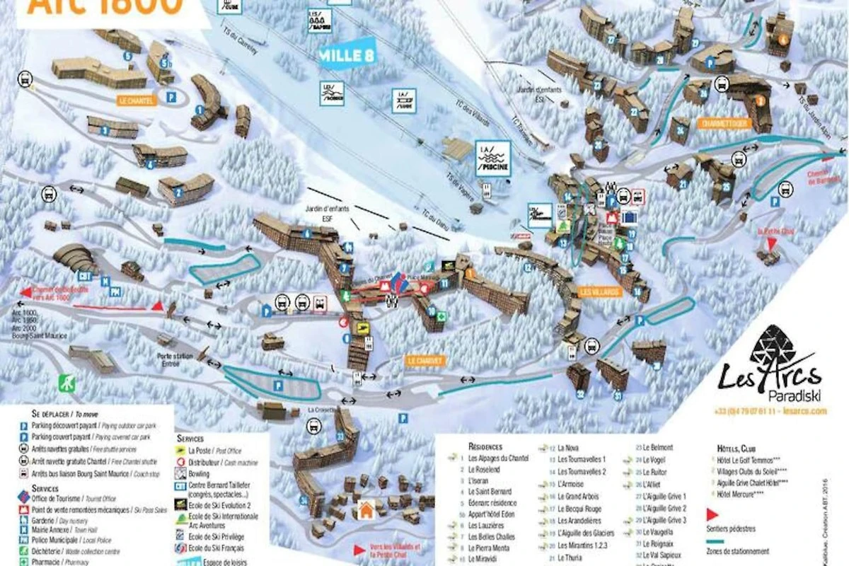 Dieses Apartment liegt in einer ruhigeren Gegend von Arc 1800 und bietet einfachen Zugang zu den Pisten. Gäste können direkt von der Residenz aus mit den Skiern zu den Sesselliften „Vagère“ oder „Carreley“ und der Gondelbahn „Villards“ fahren. Die kostenlose Seilbahn „Dahu“ ist 100 Meter entfernt und eine Haltestelle des kostenlosen Shuttlebusses ist nur 50 Meter entfernt. Dieser verkehrt im Winter halbstündlich und im Sommer stündlich. Ein Minimarkt befindet sich 100 m entfernt im Dorf. Das Tourismusbüro und das Arztamt befinden sich unten im Dorf Charvet und die ESF-Skischule befindet sich an der Schneefront des Resorts.