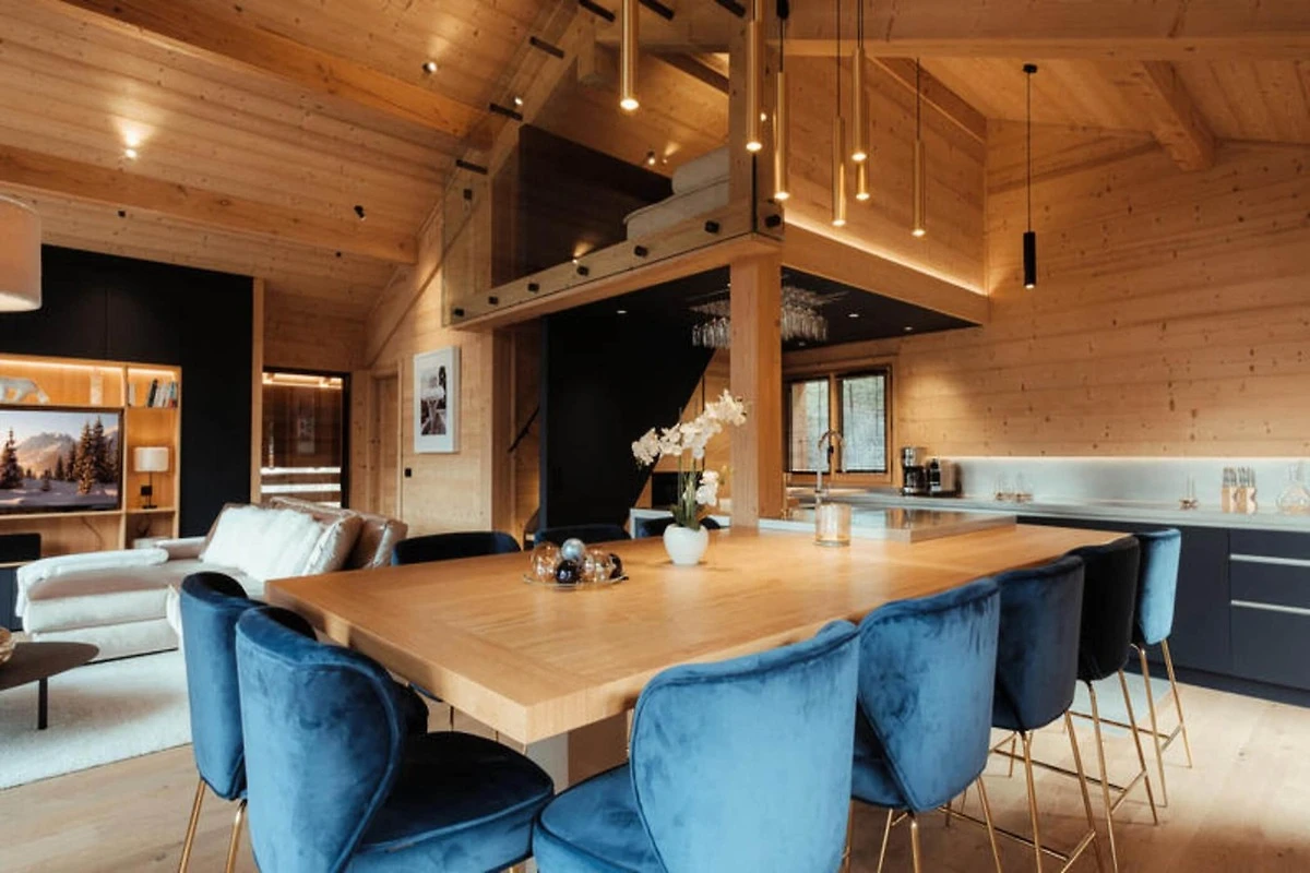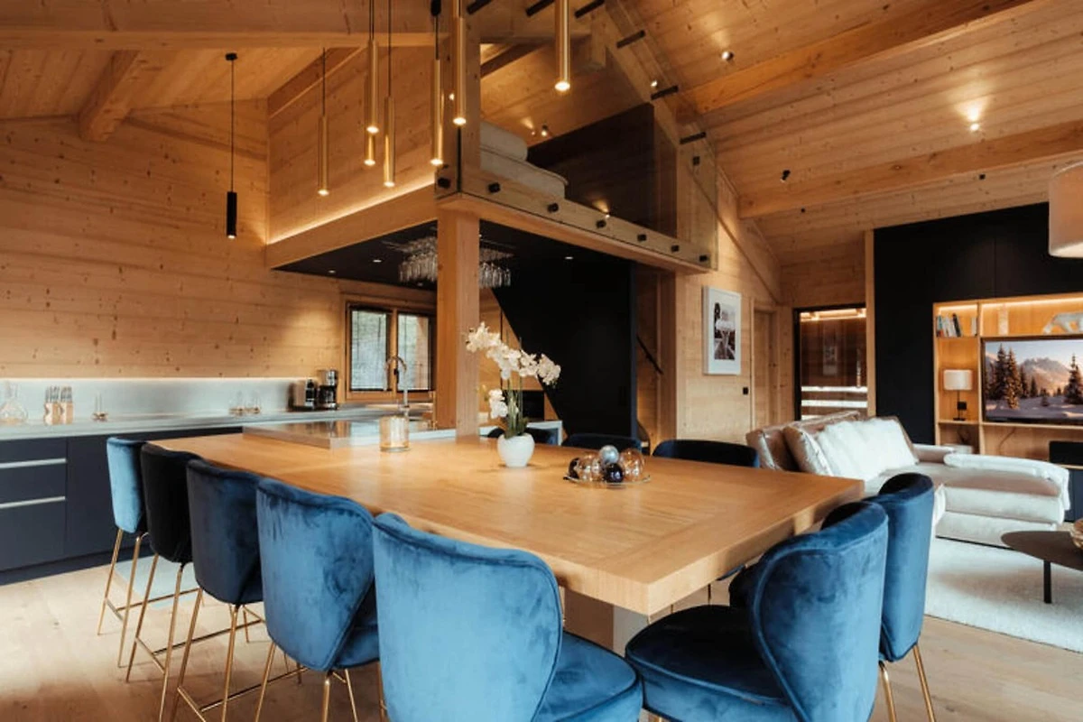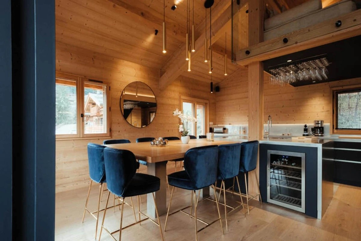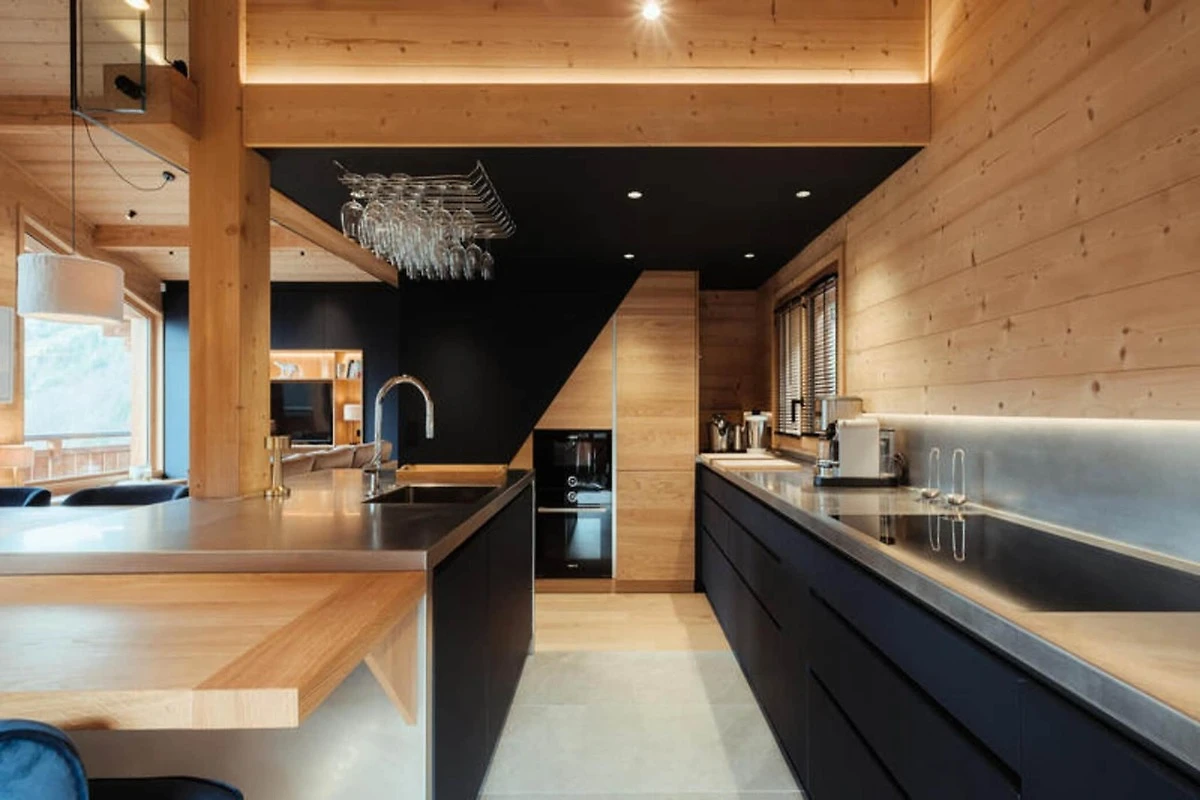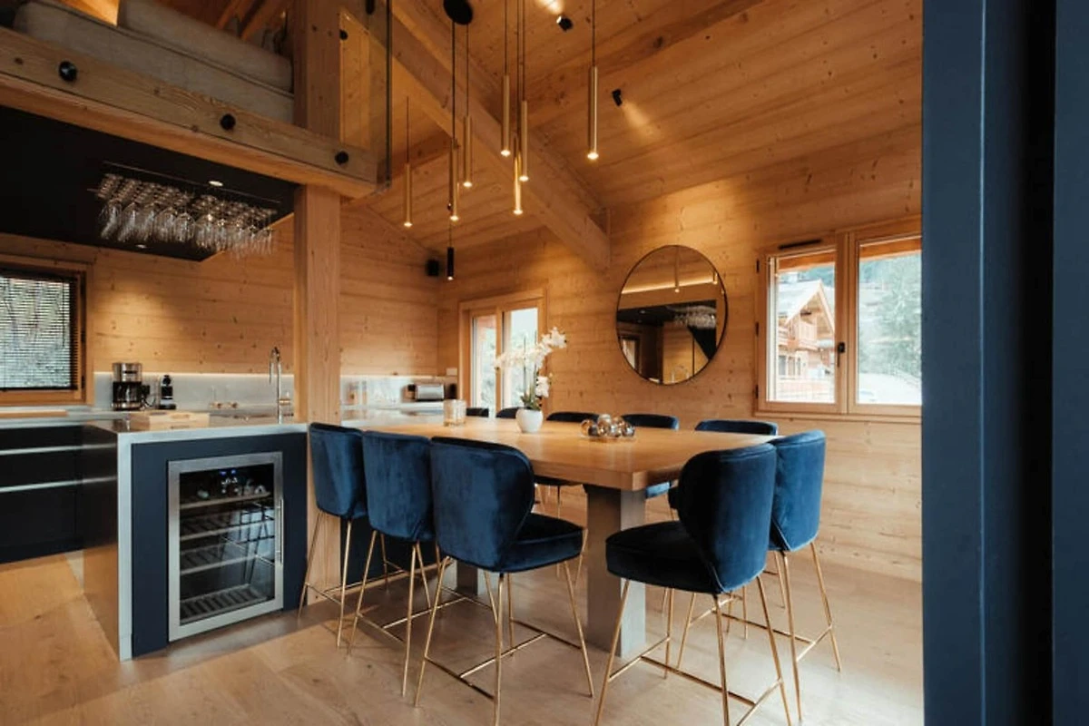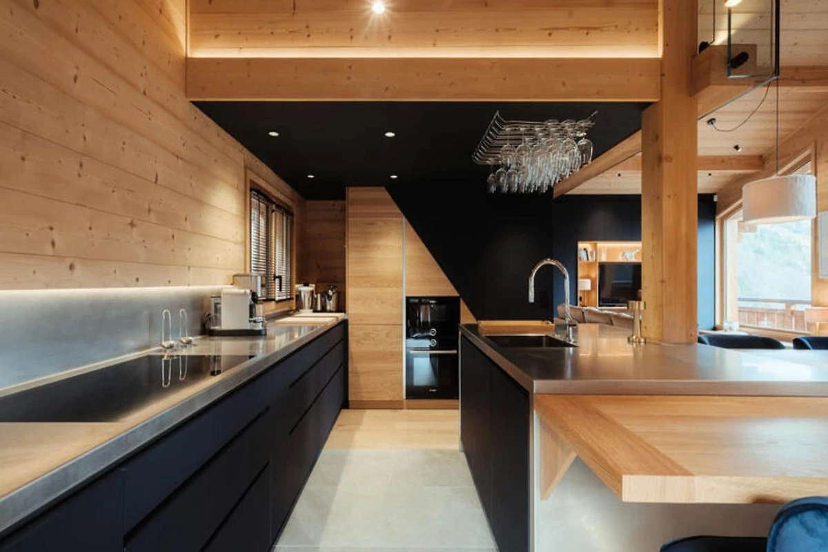 Die voll ausgestattete Küche ist zum Wohnzimmer hin offen und verfügt über hochwertige Geräte wie ein Induktionskochfeld, zwei Geschirrspüler, einen Weinkeller und eine Nespresso-Kaffeemaschine. Es verfügt außerdem über einen Kühlschrank mit Gefrierfach (267 l), einen Backofen und eine Mikrowelle. Die Anordnung der Küche ermöglicht eine einfache Interaktion mit Gästen im Wohnbereich, der mit einem Flachbild-TV und Panoramablick auf die Berge ausgestattet ist. Zu den weiteren Annehmlichkeiten gehören ein Skiraum mit Schuhtrockner für bis zu 10 Paar Schuhe, Fußbodenheizung und ein entspannender Zwischengeschossbereich mit einem Flachbild-TV für zusätzlichen Komfort.